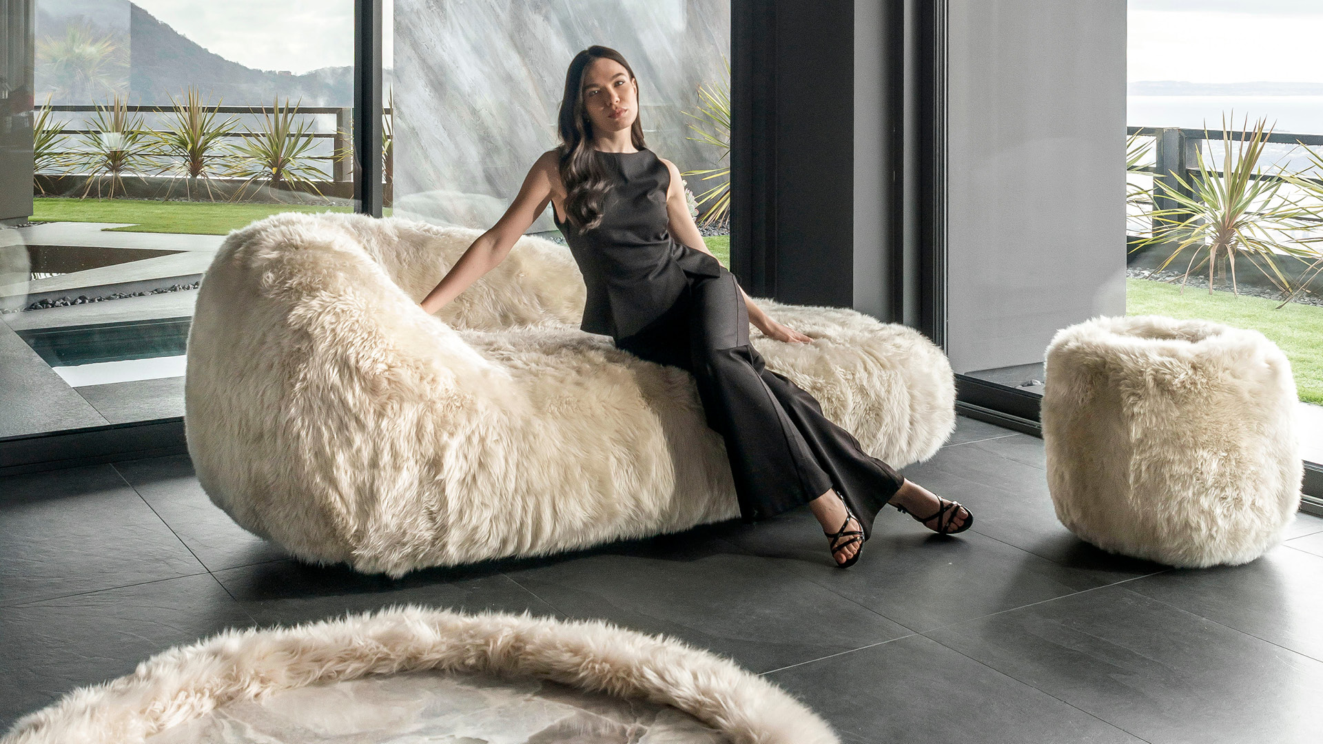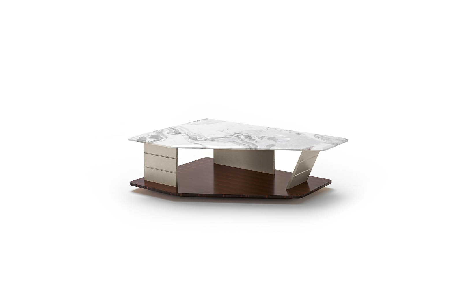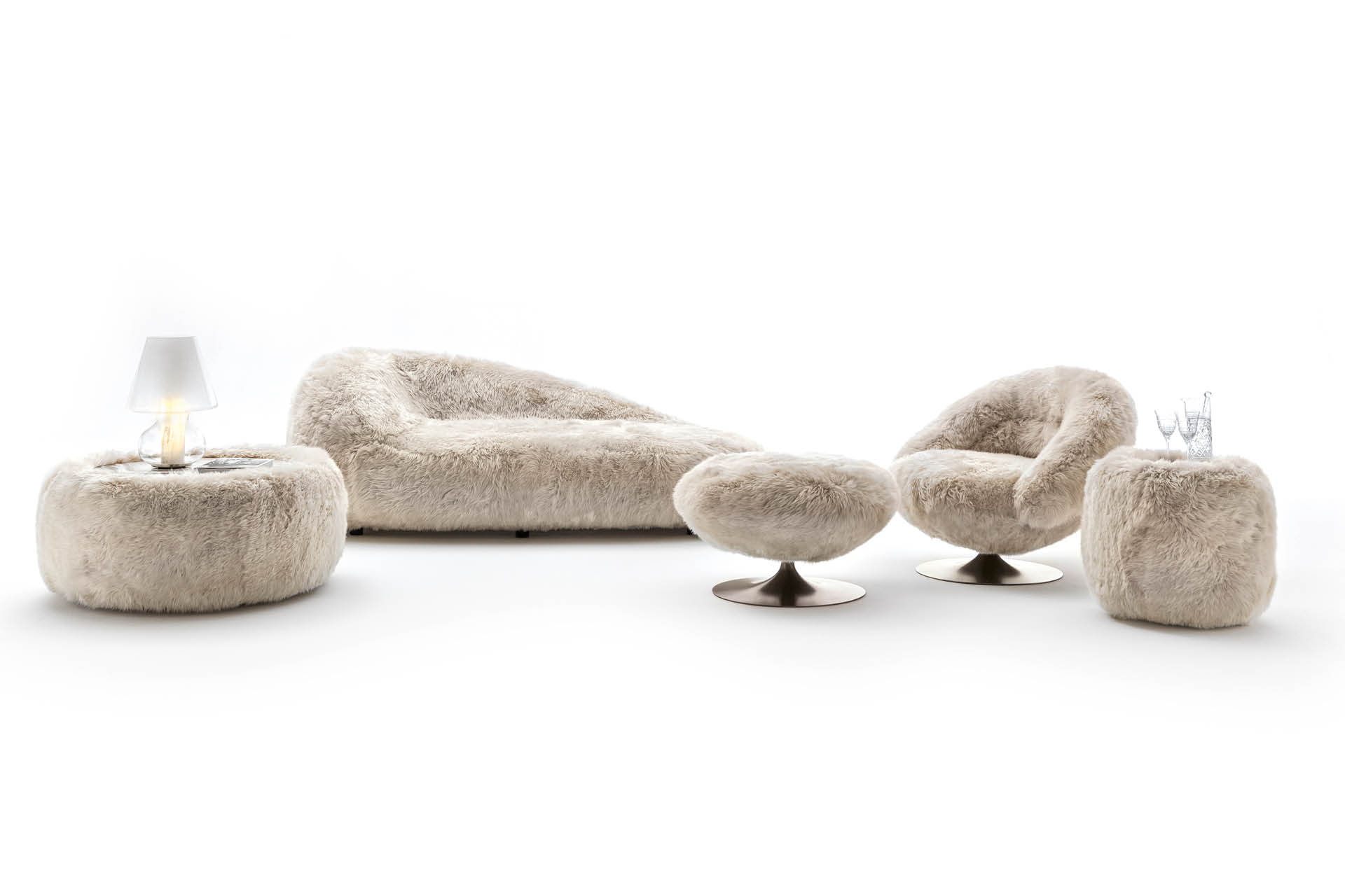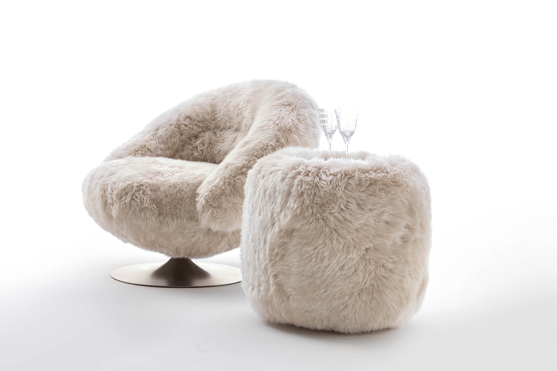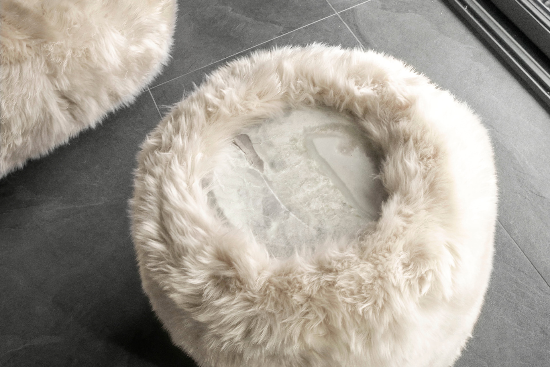 Tavolino rotondo in agnello australiano con piano in marmo Oyster della Namibia dalla finitura lucida.