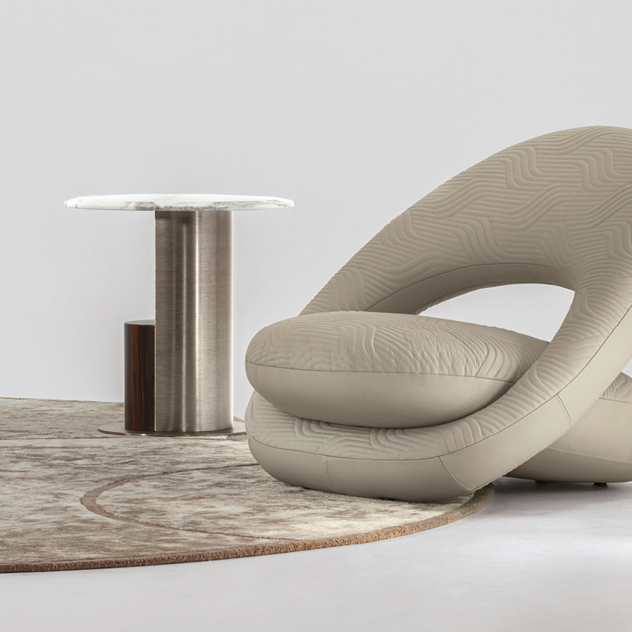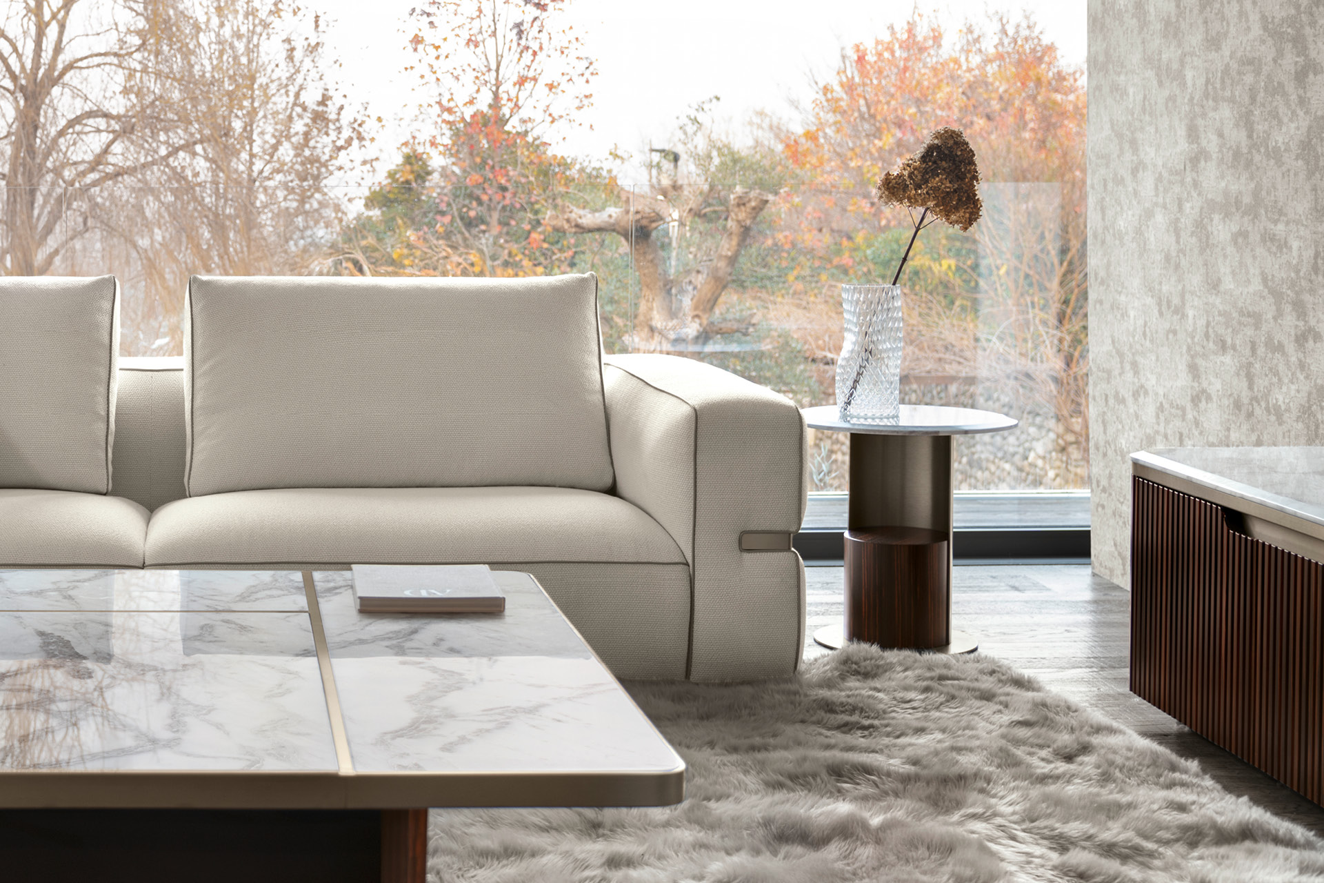 Tavolino con piano bisellato in marmo Namibian Oyster con finitura lucida. Base in impiallacciatura di ebano Makassar satinato e acciaio inossidabile con finitura titanio galvanizzato satinato, con 2 loghi Giorgio Collection incisi al laser.