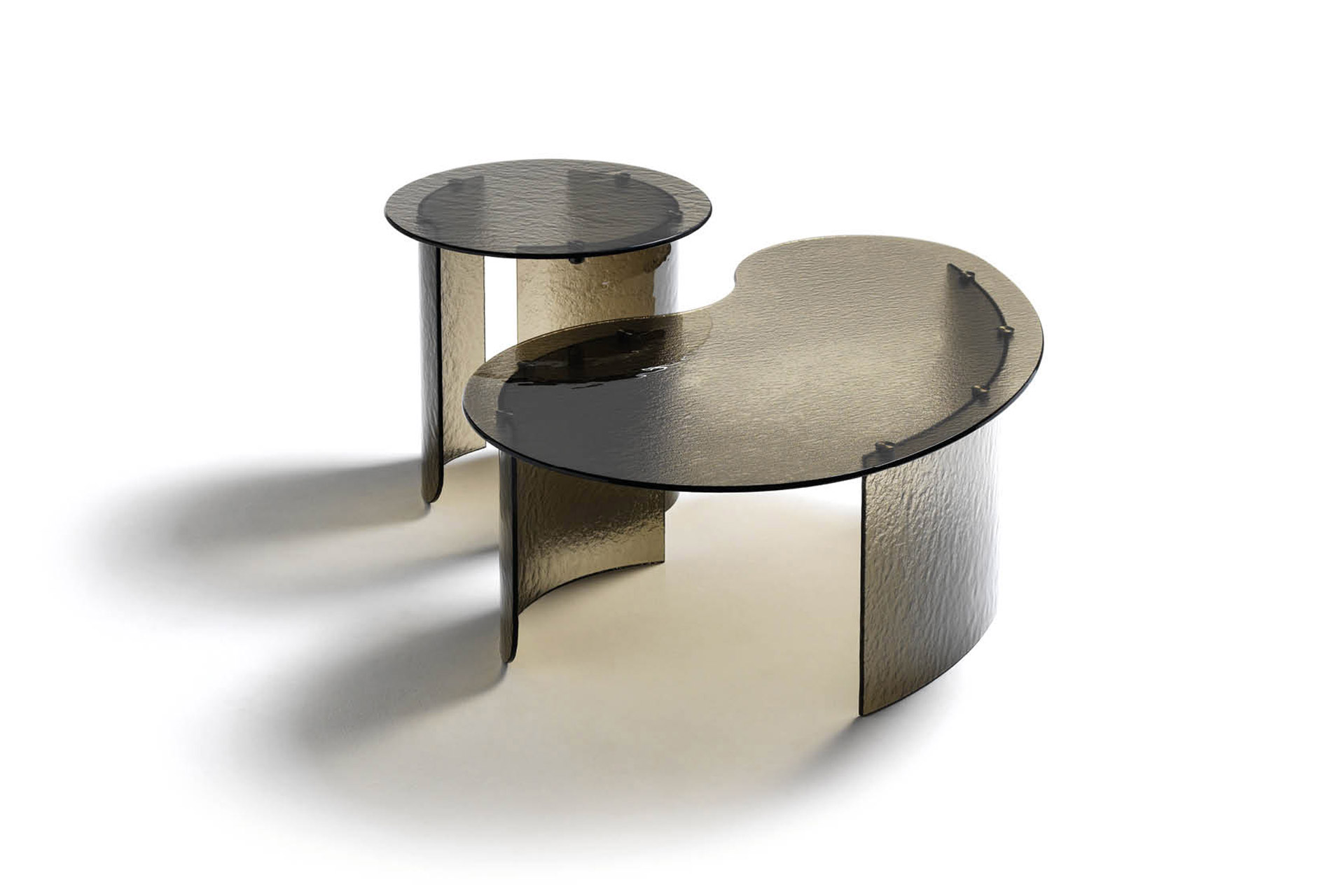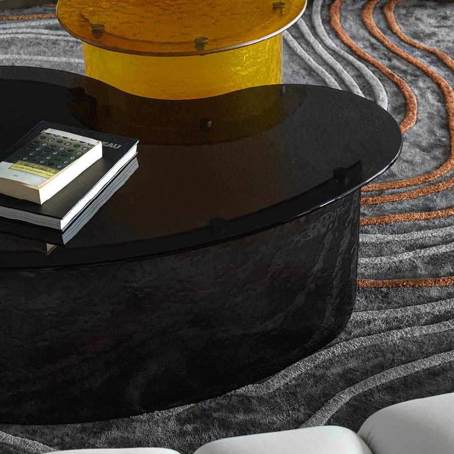 Tavolo da cocktail ellittico con piano e base disponibili in vetro fuso martellato a mano marrone, fumo o ambra.