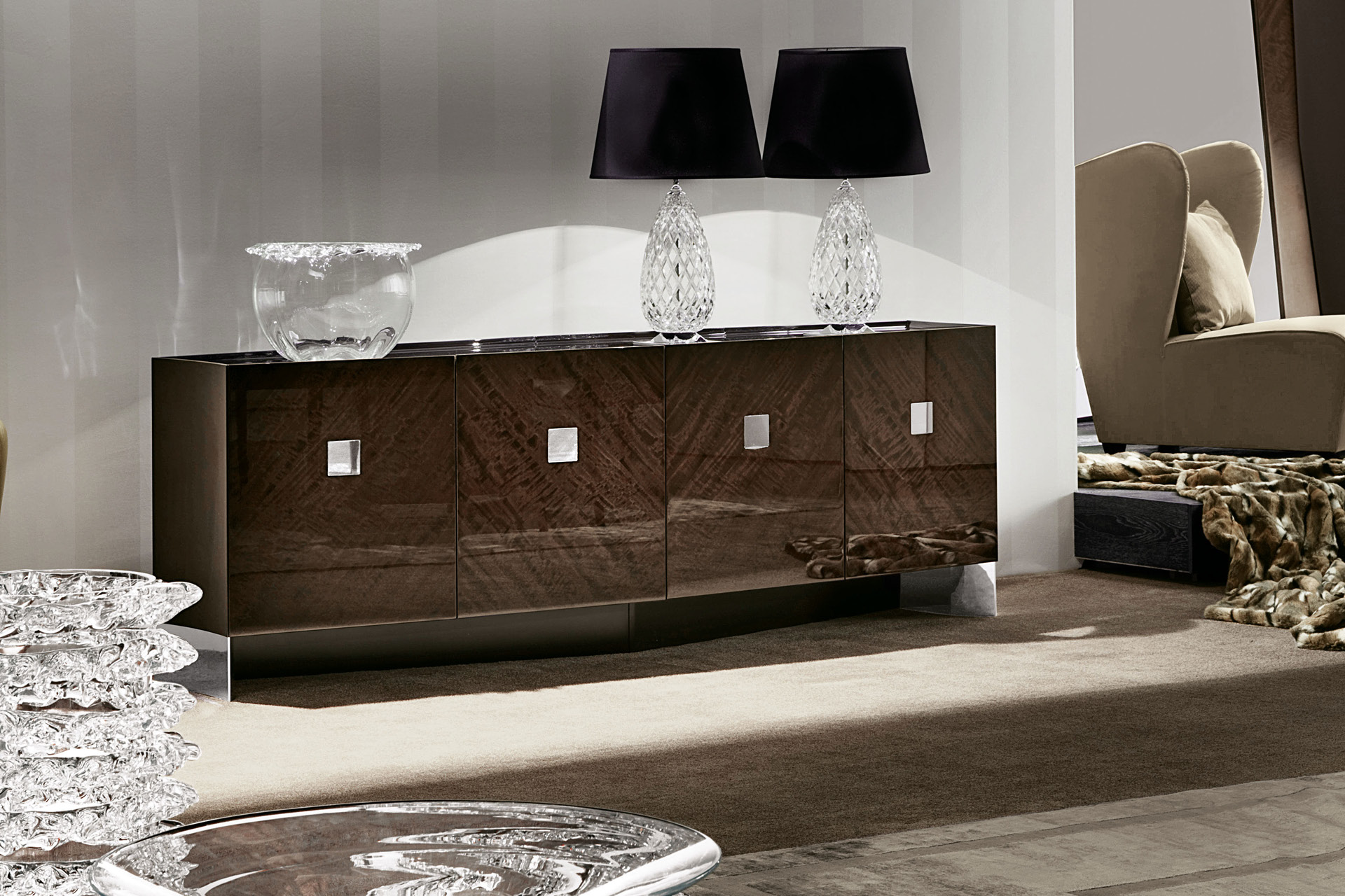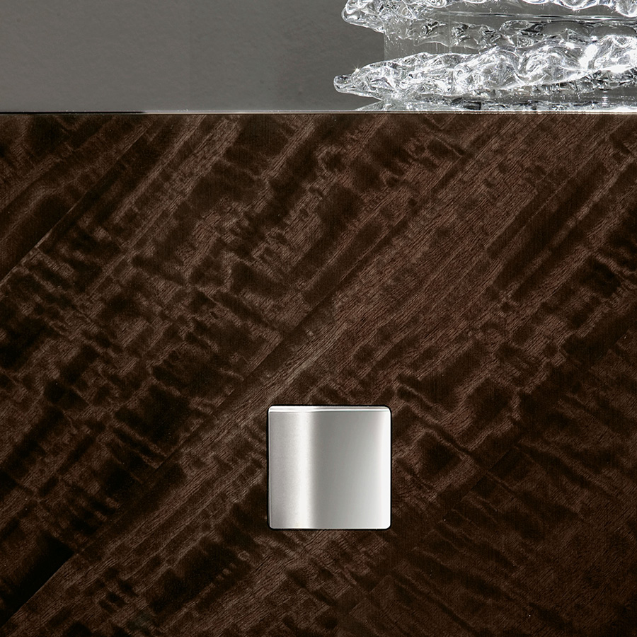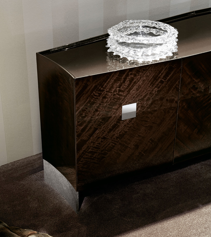 Buffet con impiallacciatura in eucalipto riccio europeo in poliestere lucido.