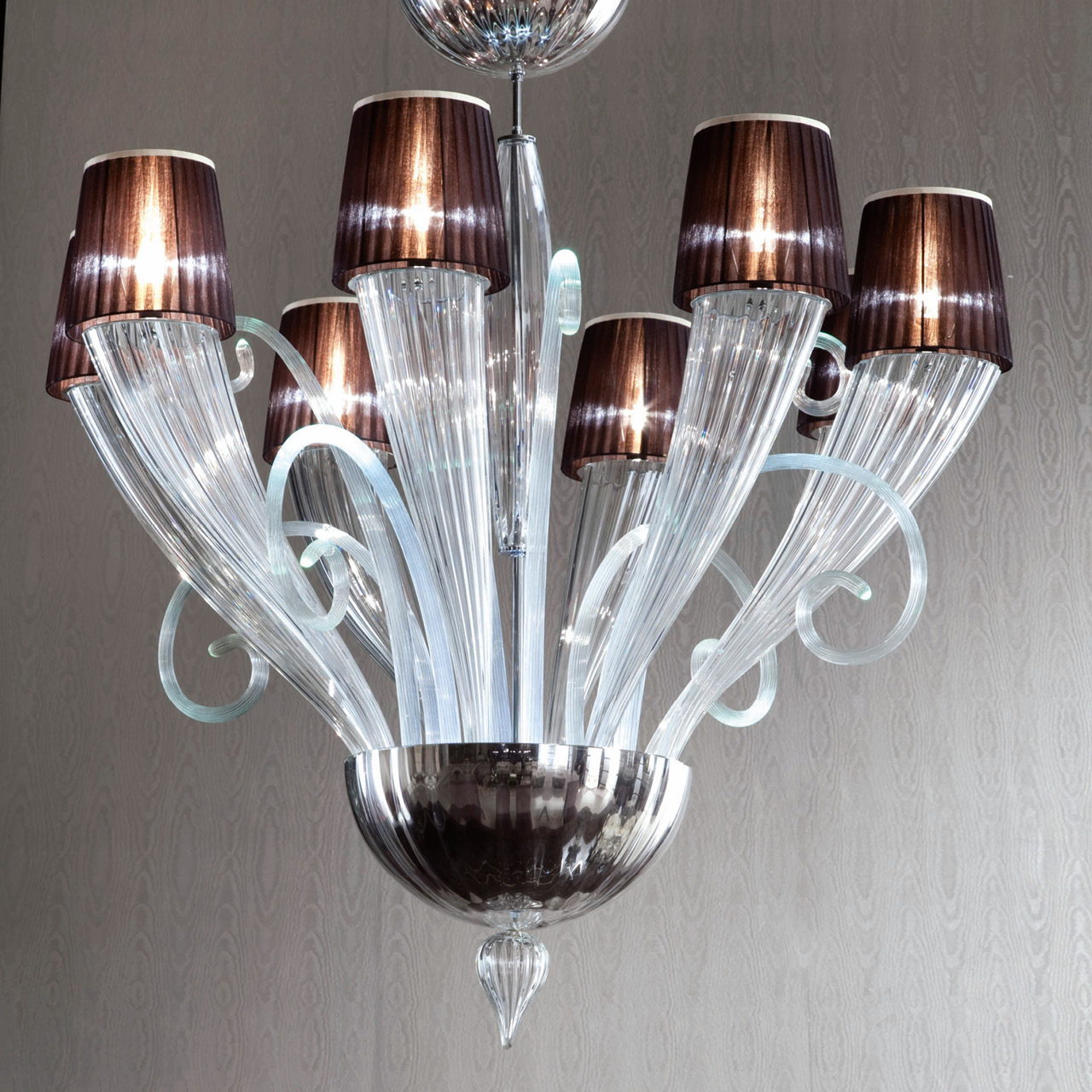 Venetian “Murano” clear blow glass round chandelier. Details in silver leaf blow “Murano” glass. 8 lights with shades in brow silk. 2 different light switches.