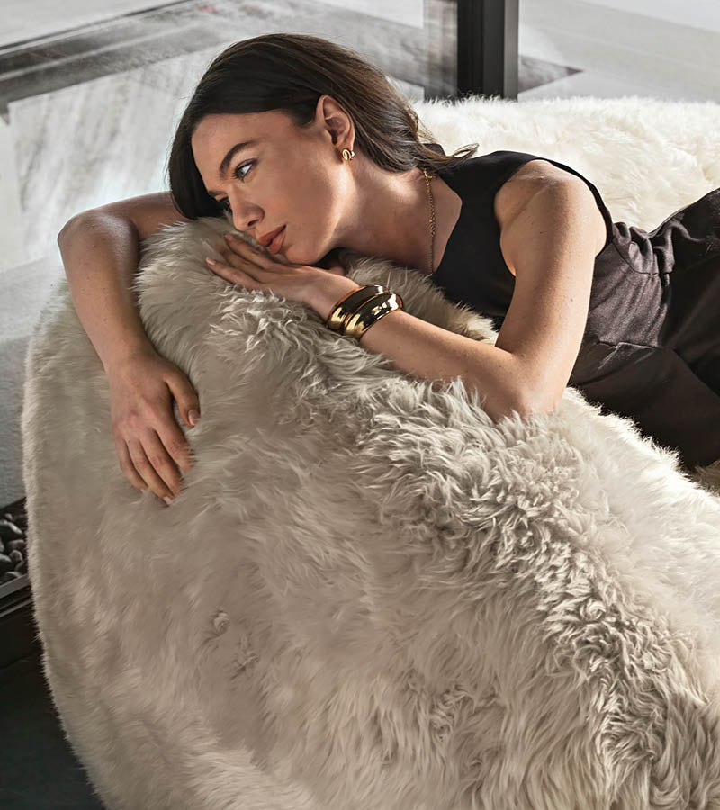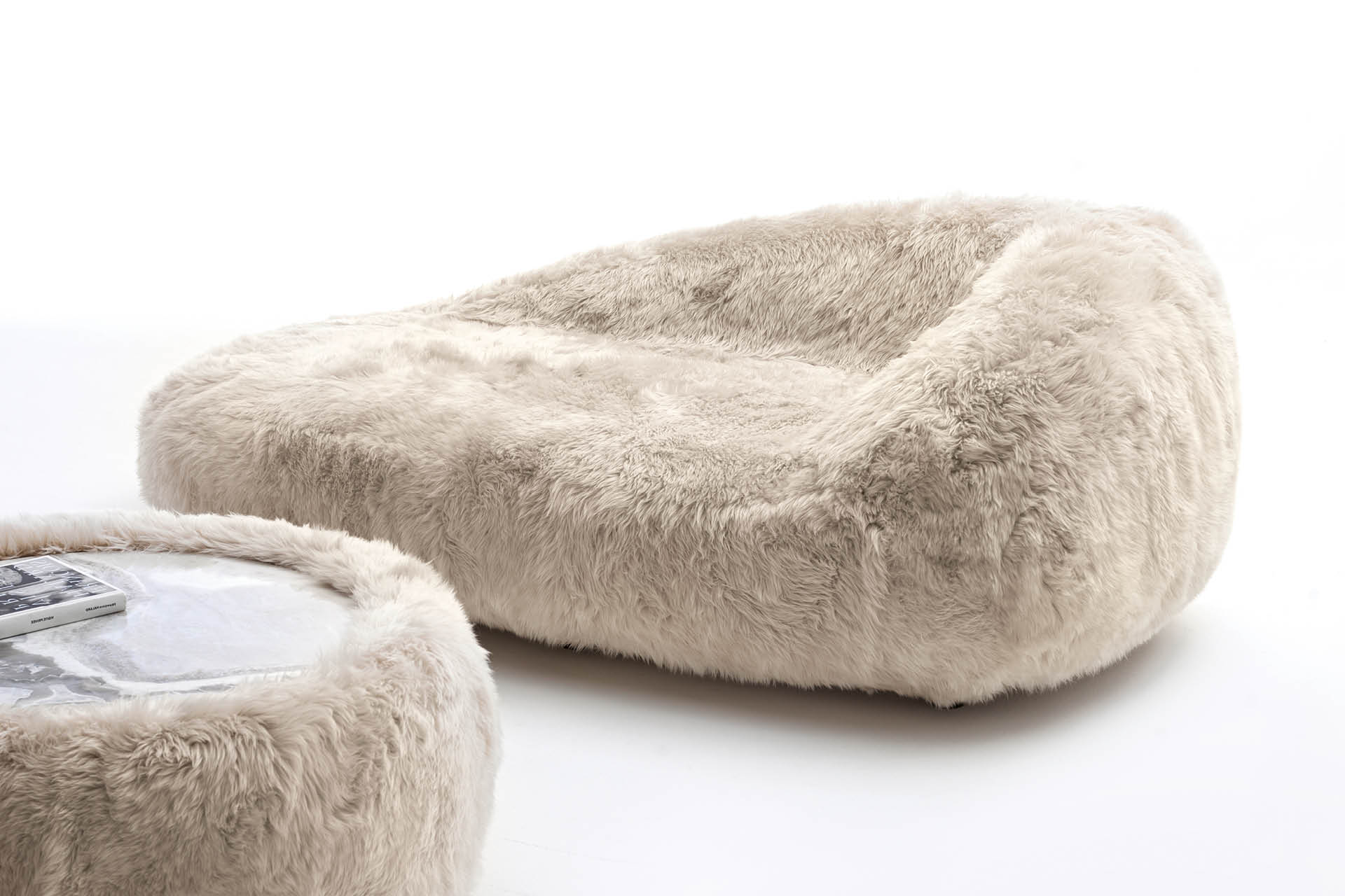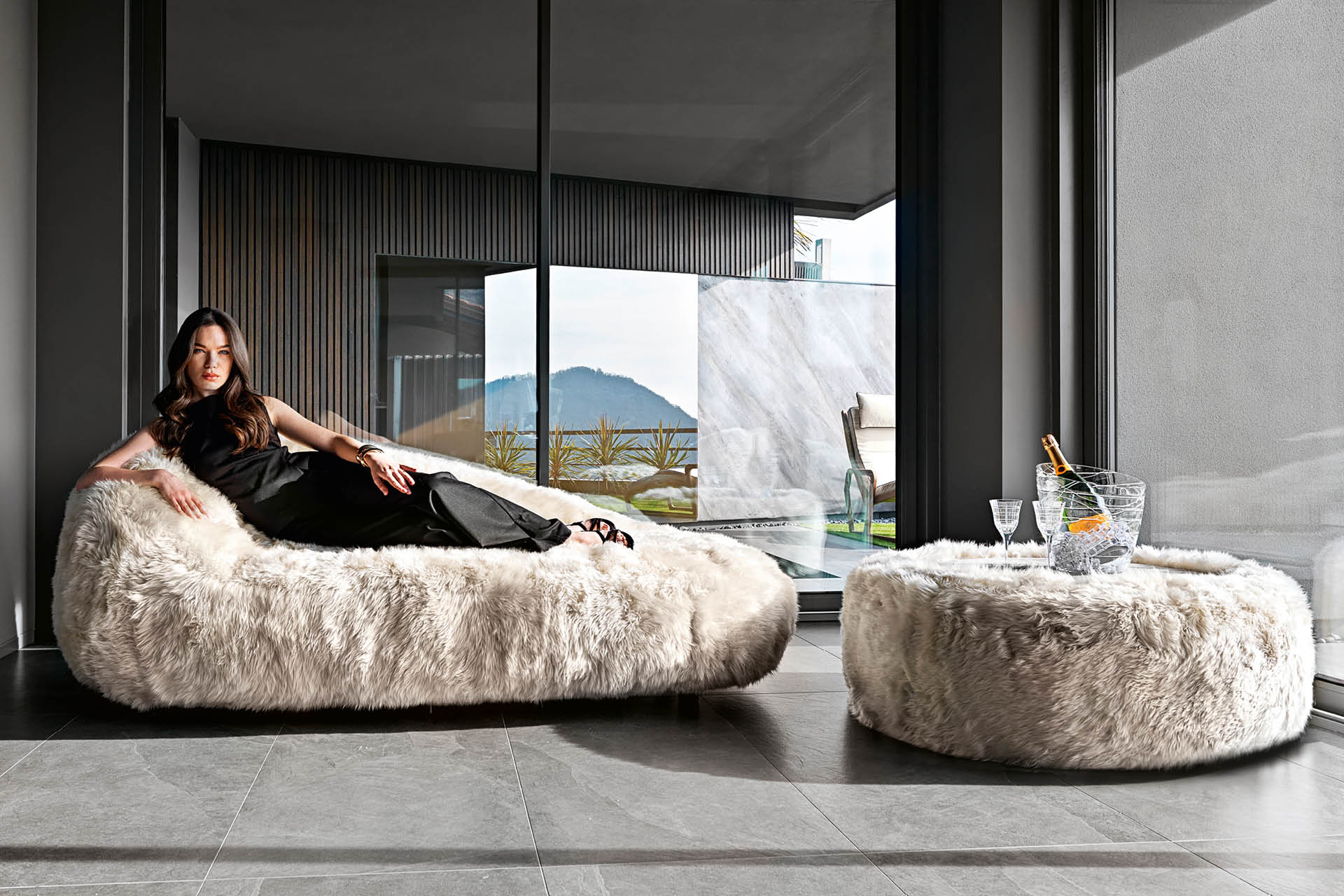 Chaise longue available in Australian lamb. Seat and sides in polyurethane foam wrapped in down feather. Seat height cm. 46