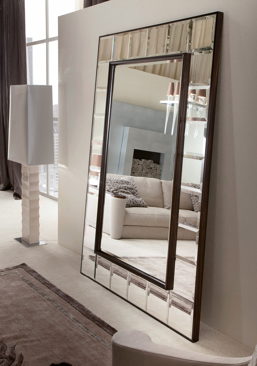 Floor mirror in combination of makassar ebony veneer in satin finish and beveled mirrors.