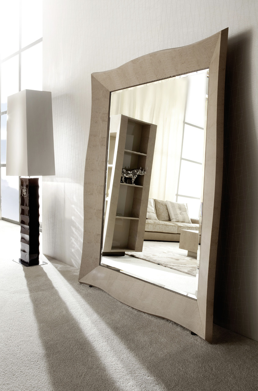Floor mirror in combination of armadillo printed leather and beveled mirror. Outer frames in armadillo printed leather.