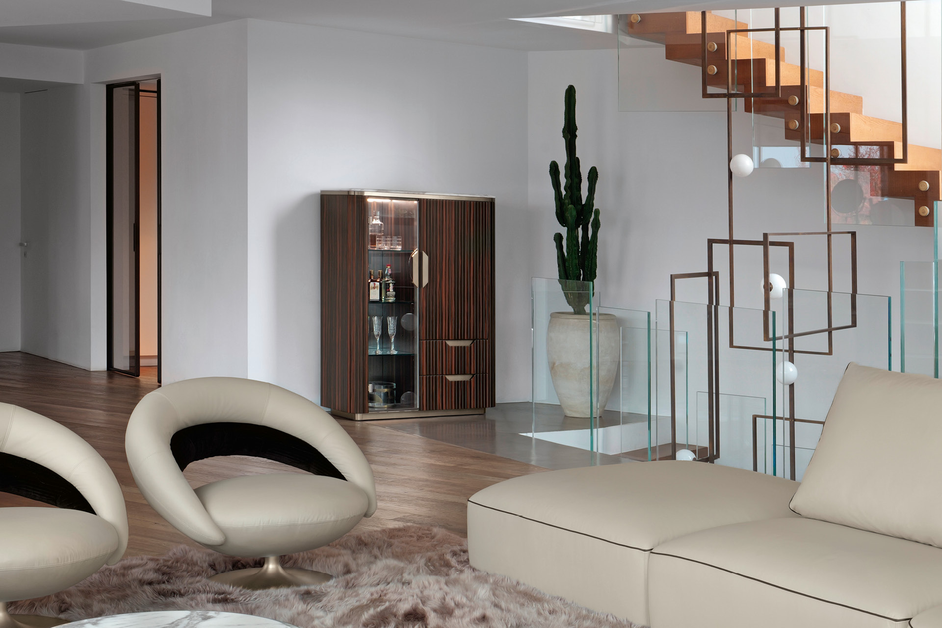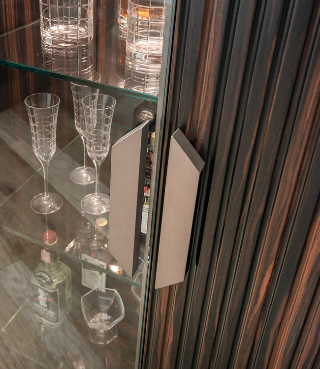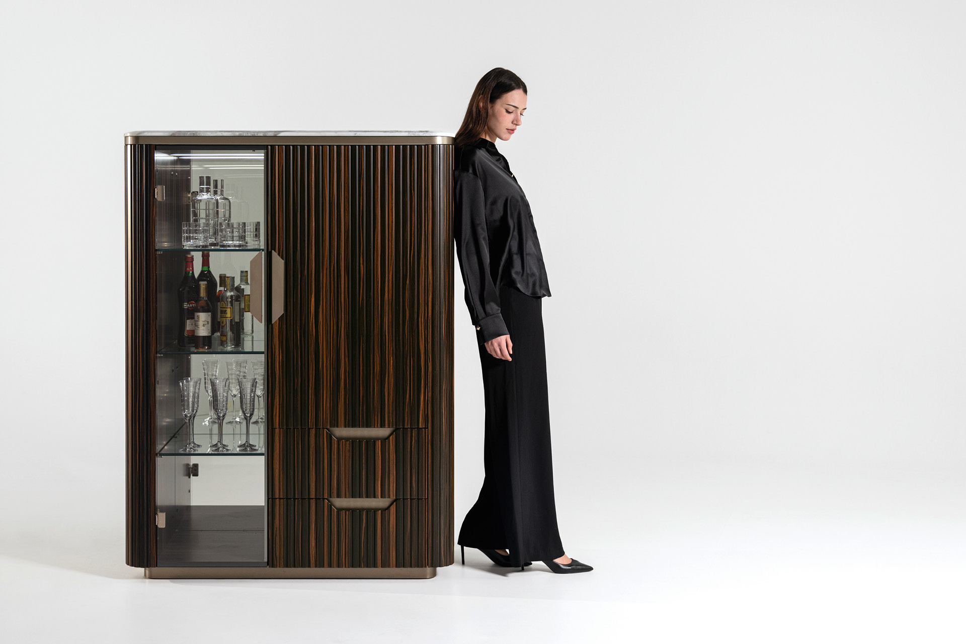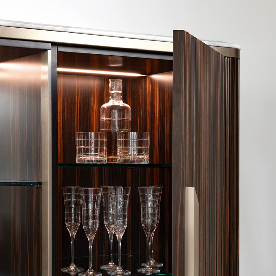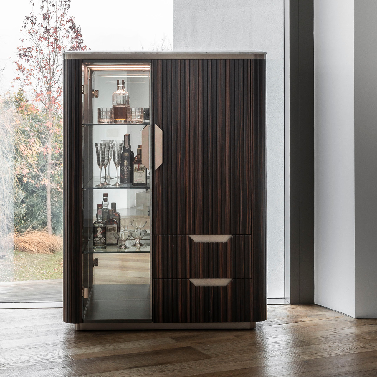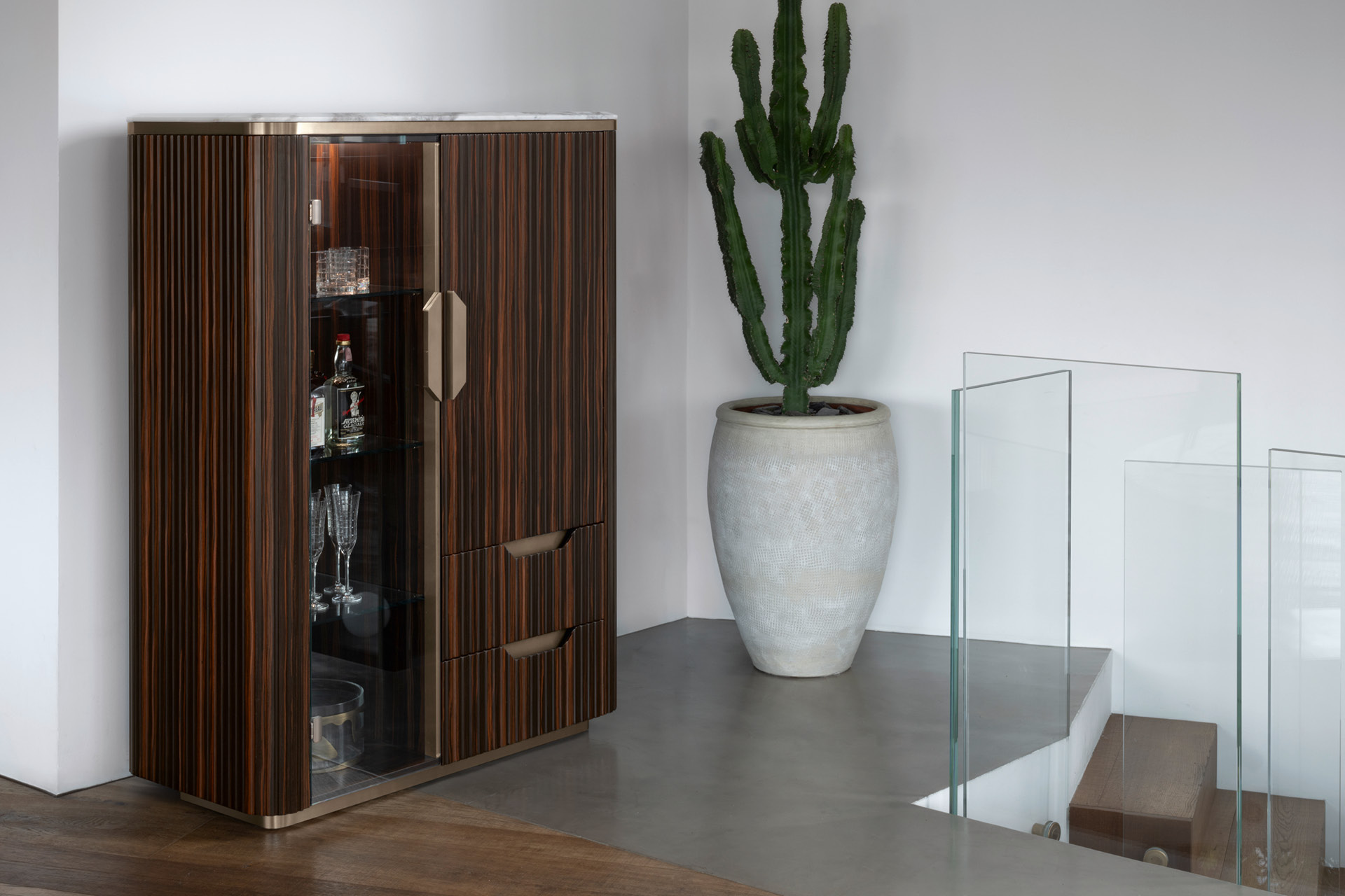 Bar cabinet in ribbed satined Makassar Ebony veneer with beveled high gloss finish Namibian Oyster marble top. Base, handles and details in satined galvanized titanium finish stainless steel. 1 glass door with 3 inside adjustable tempered glass shelves, 1 wooden door with 2 inside adjustable tempered glass shelves. Led lights included. 2 full extension drawers with bottom part in velvet fabric.