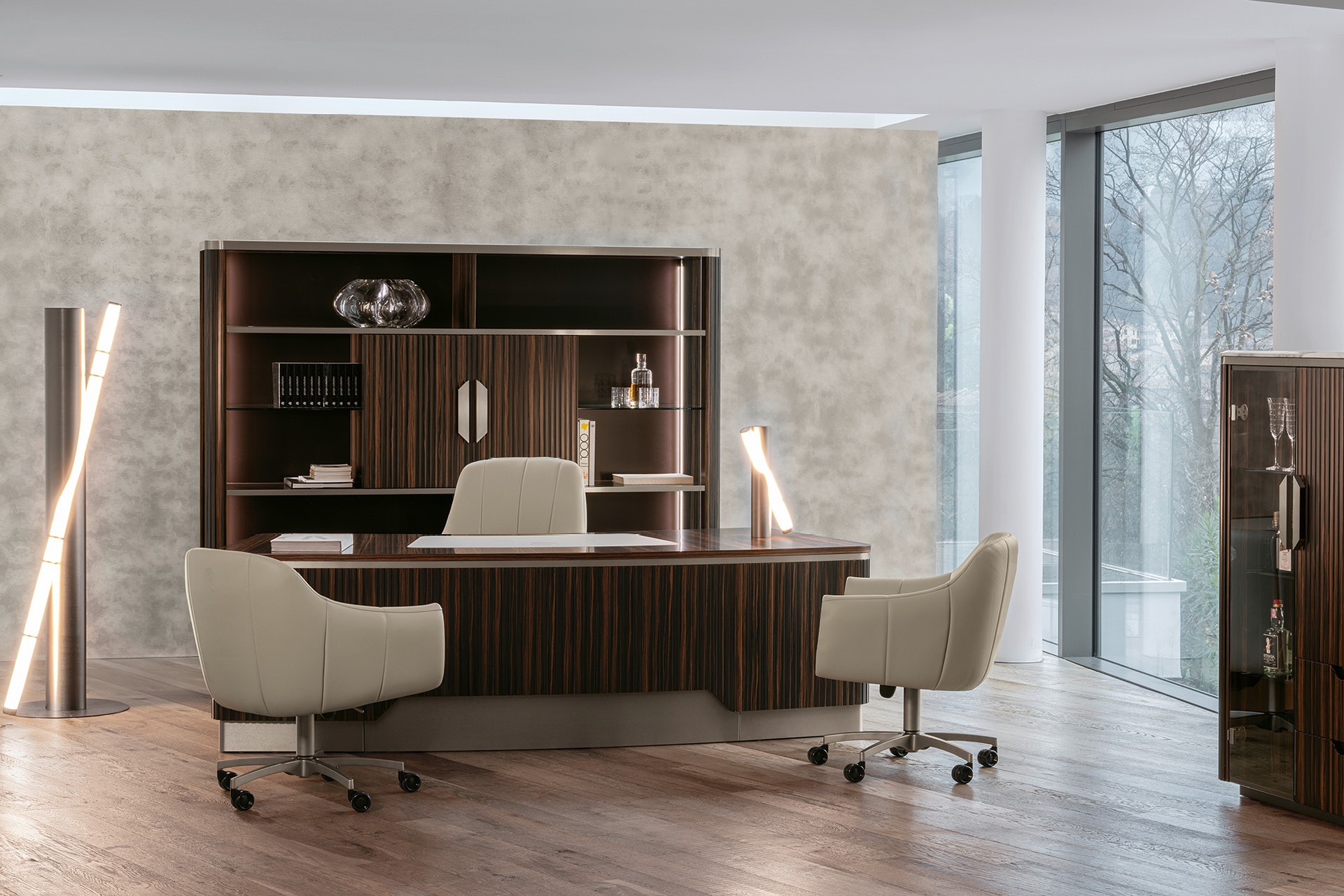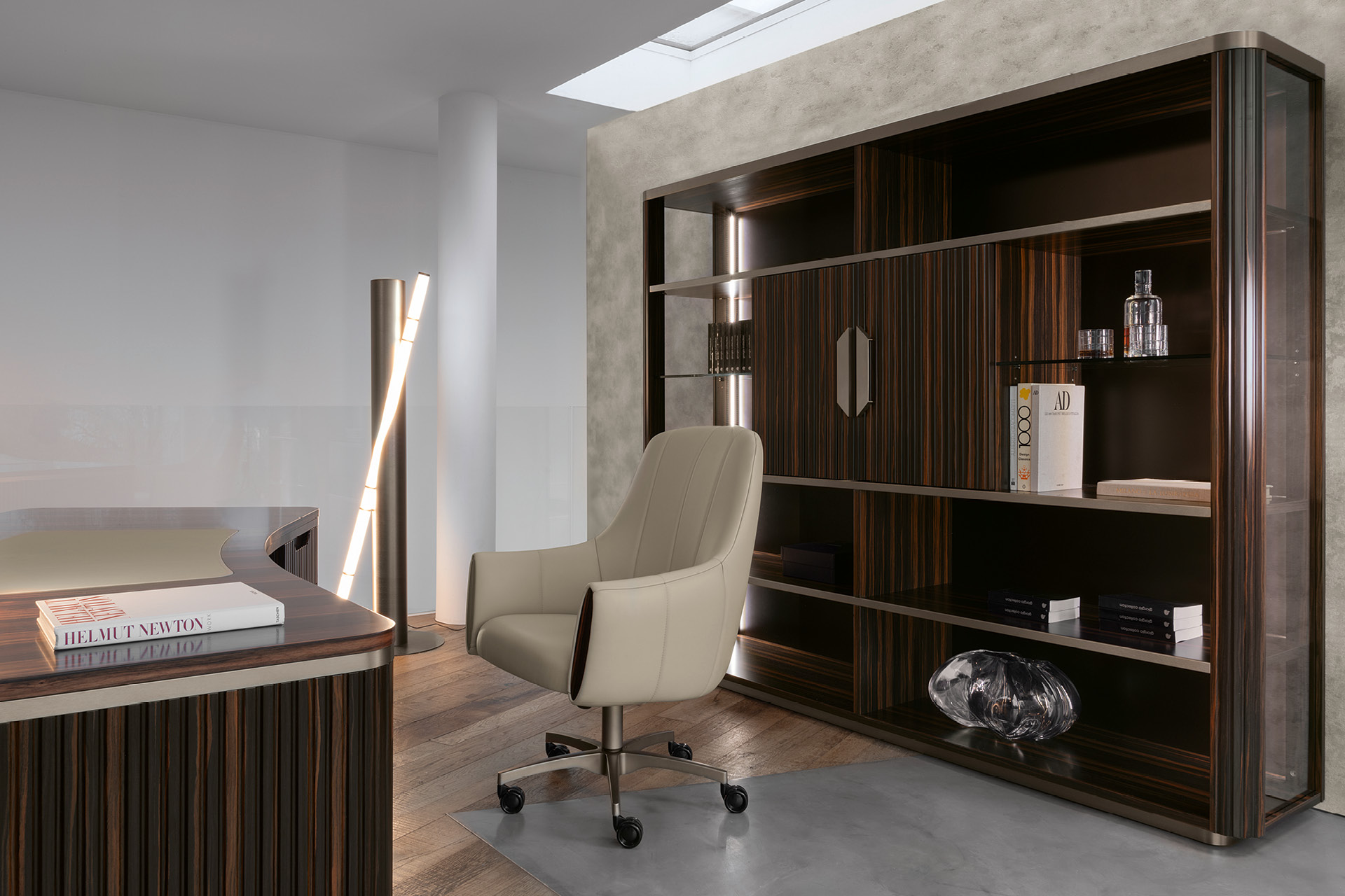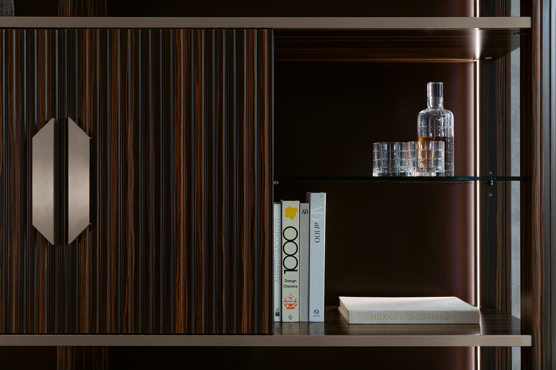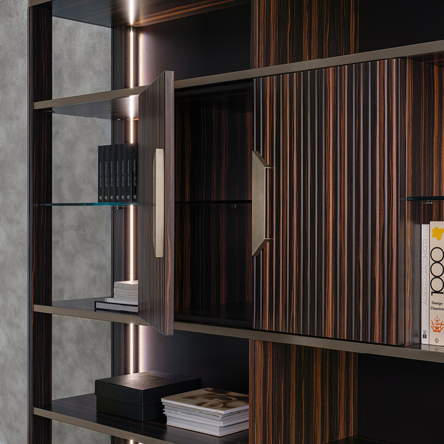 Bookcase in satined Makassar Ebony veneer with base, details and handles in satined galvanized titanium finish stainless steel. Sides in tempered glass. 6 wooden shelves and 2 adjustable tempered glass shelves. 2 led lights included. 2 wooden doors with 1 inside adjustable tempered glass shelf.