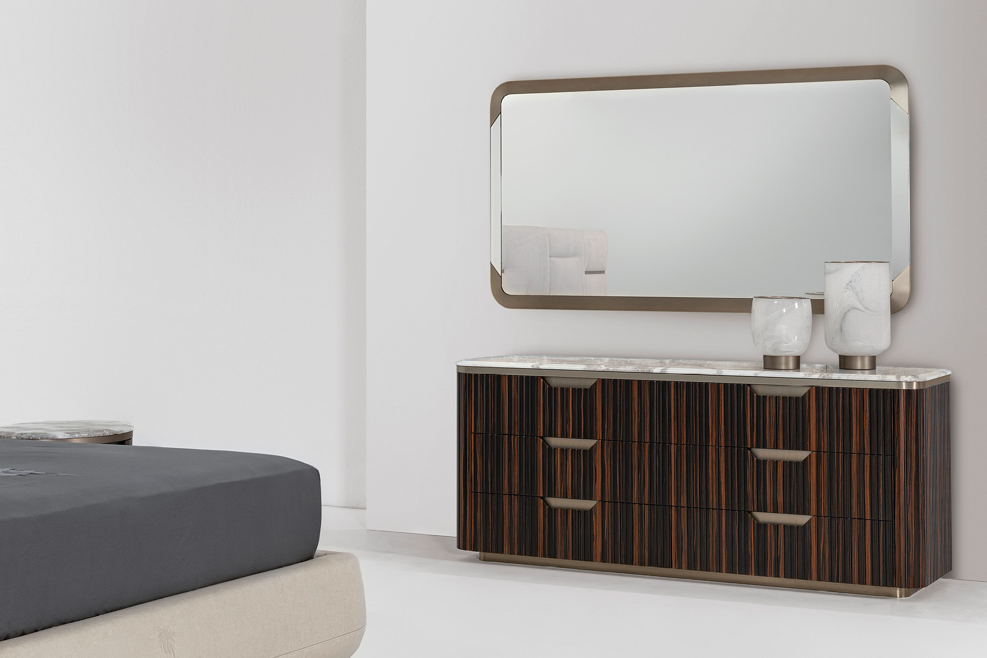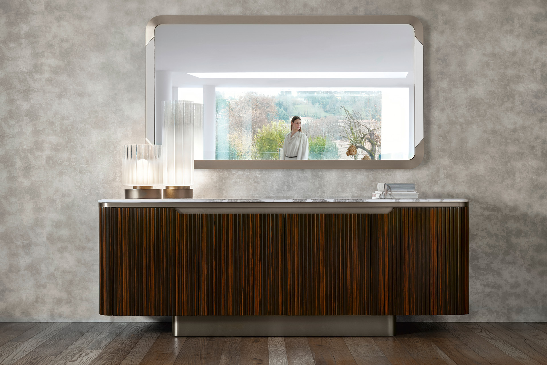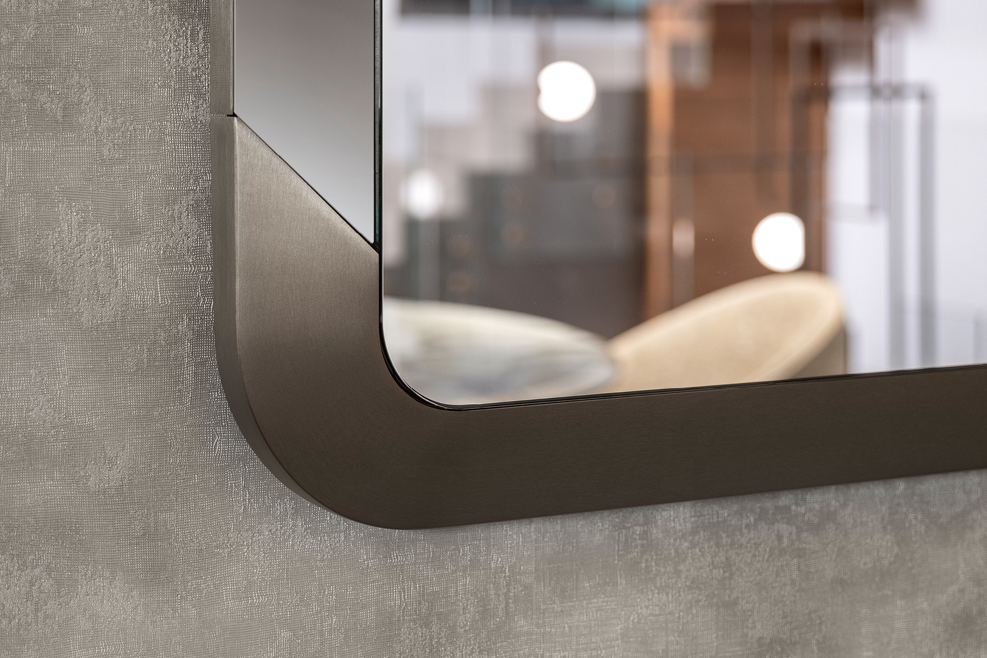 Rectangular mirror with frame in combination of glass and satined galvanized titanium finish stainless steel.