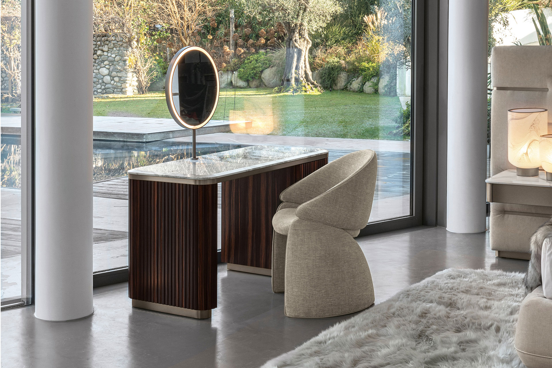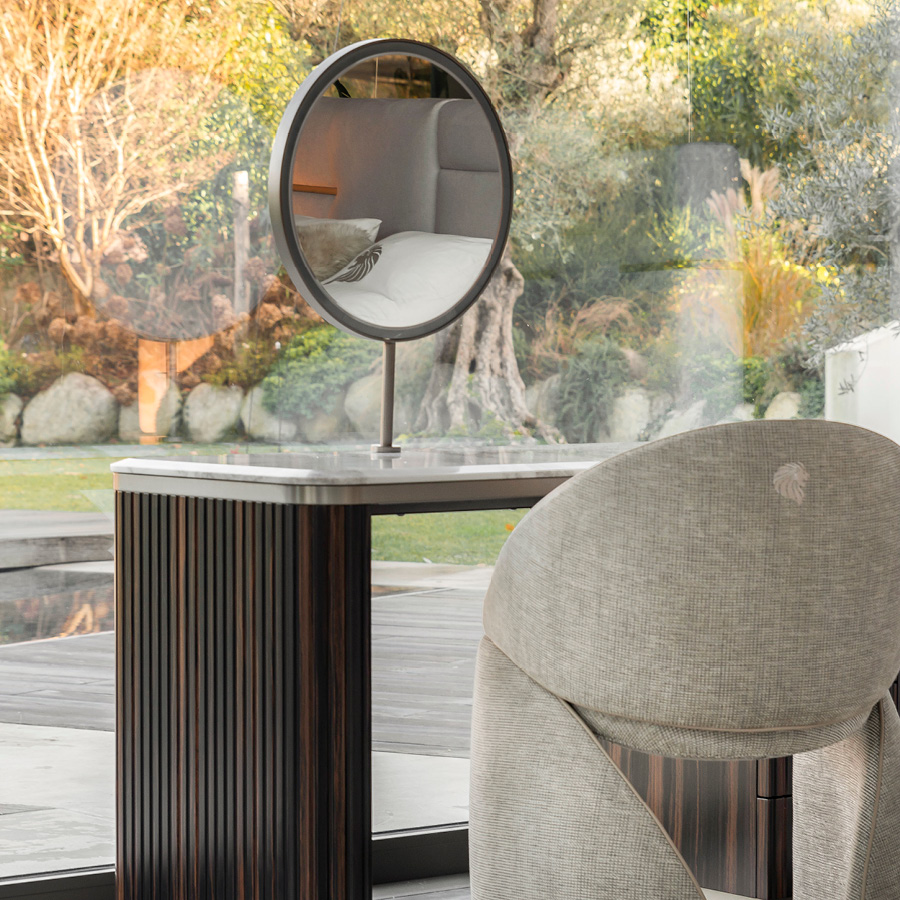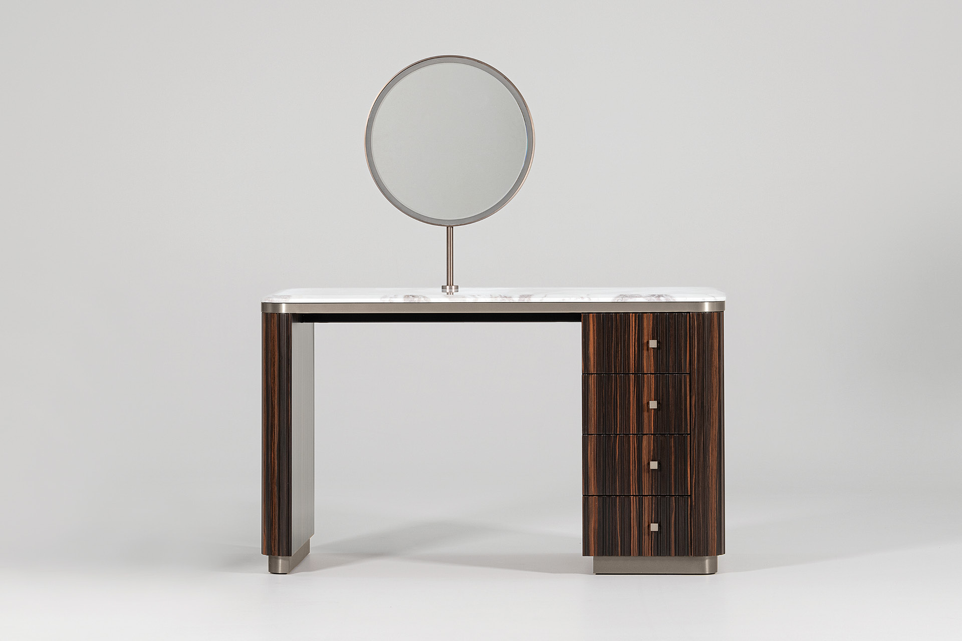 Vanity desk in ribbed satined Makassar Ebony veneer. Beveled top in high gloss finish Namibian Oyster marble. Base, handles and details in satined galvanized titanium finish stainless steel. 4 side full extension drawers with bottom part in velvet fabric. Round mirror top for vanity desk in satined galvanized titanium finish stainless steel with lasered Giorgio Collection logo on the back part. Inserted led light with touching switch.