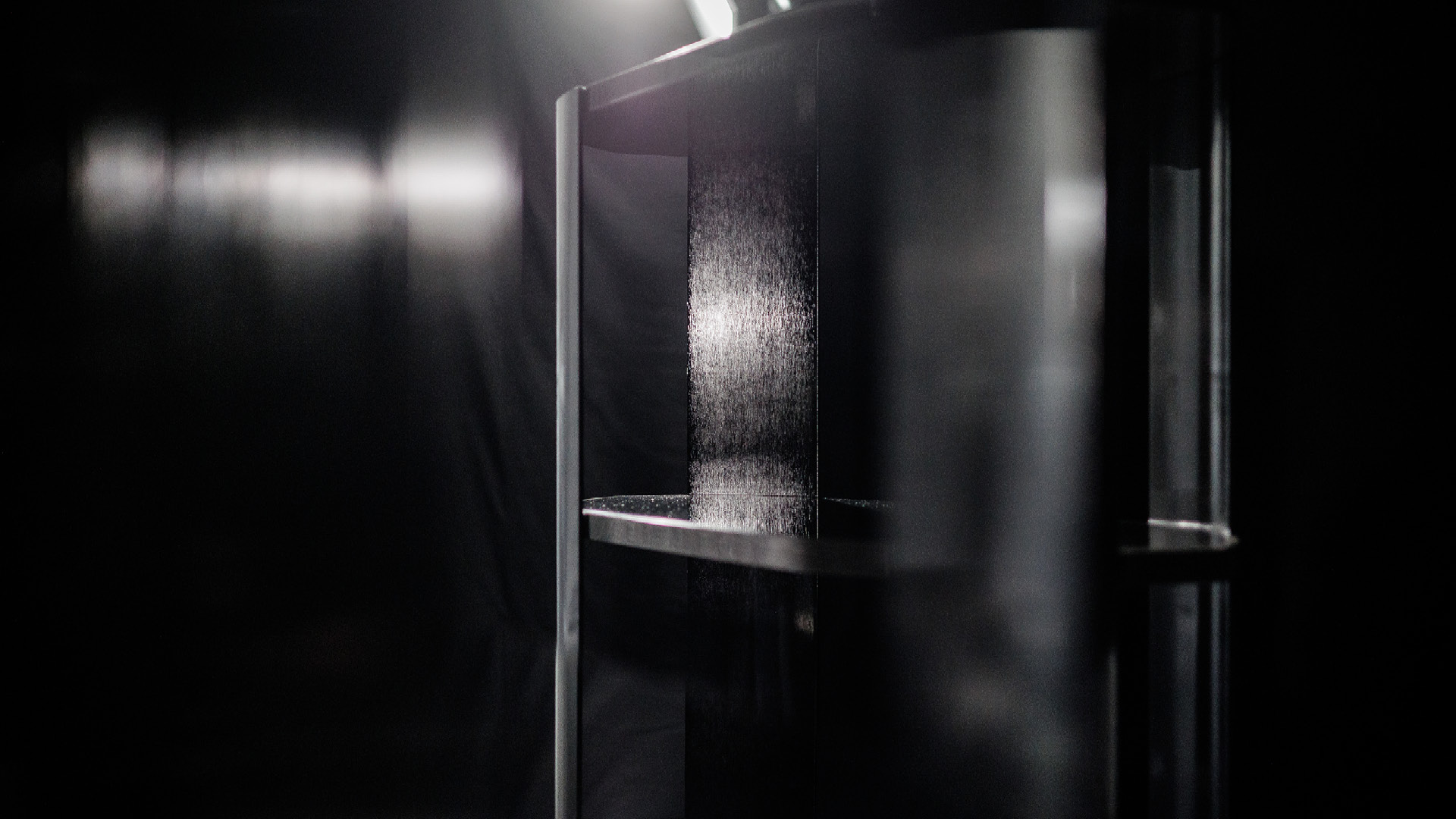 Bookcase with structure in satin black nickel stainless steel with Giorgio Collection logo on the base. 3 fixed shelves in smoked tempered glass with frame in Madagascar figured Mowinghi veneer with high gloss polyester finish.
