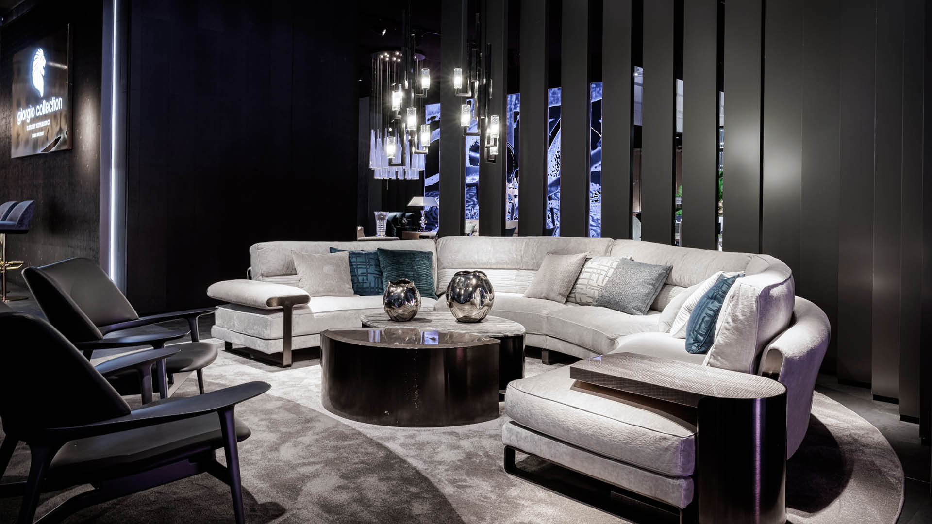 Cocktail sofa table in high gloss polyester finish. Curved leg in satin black nickel stainless steel with lasered Giorgio Collection logo.