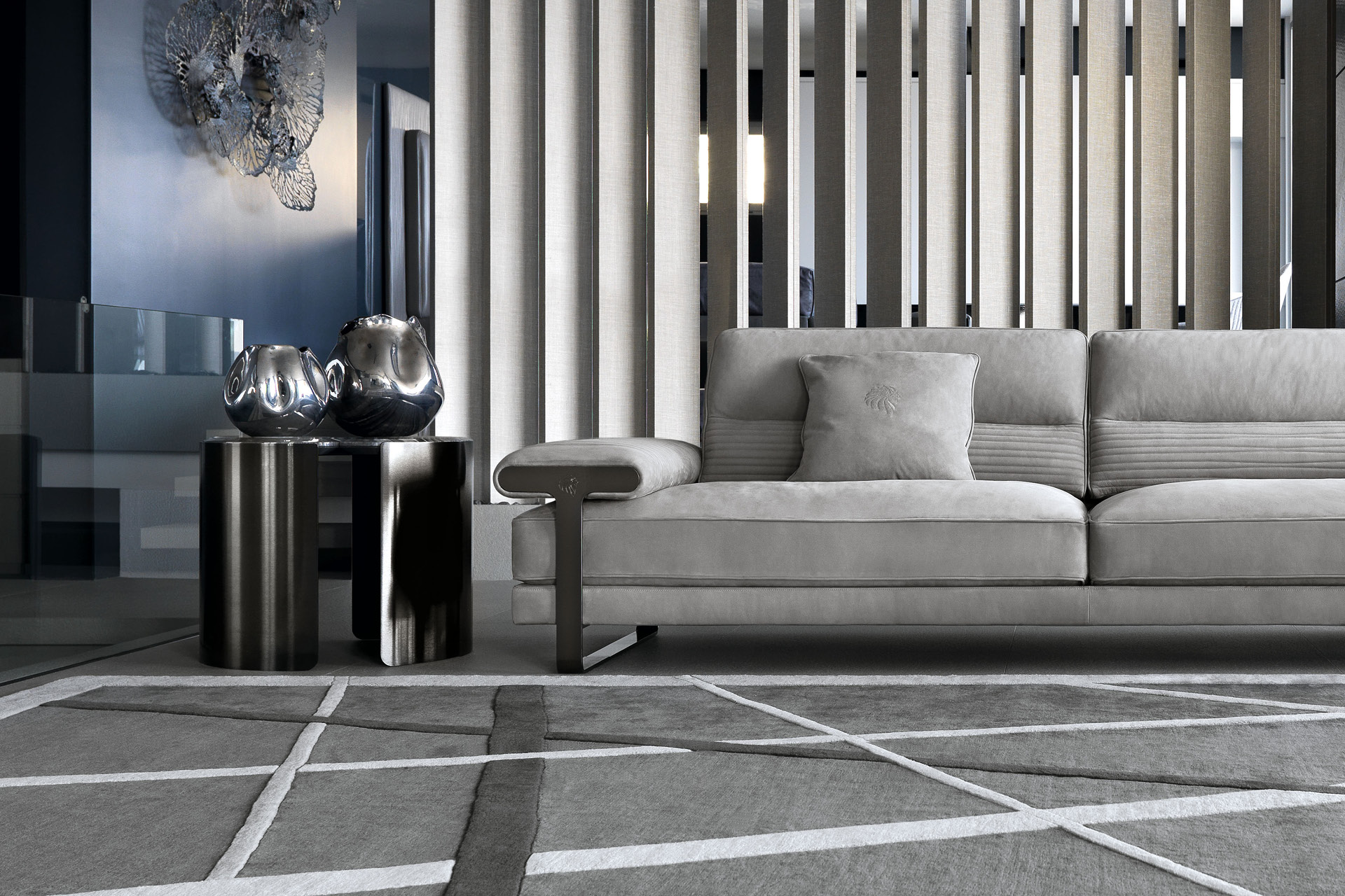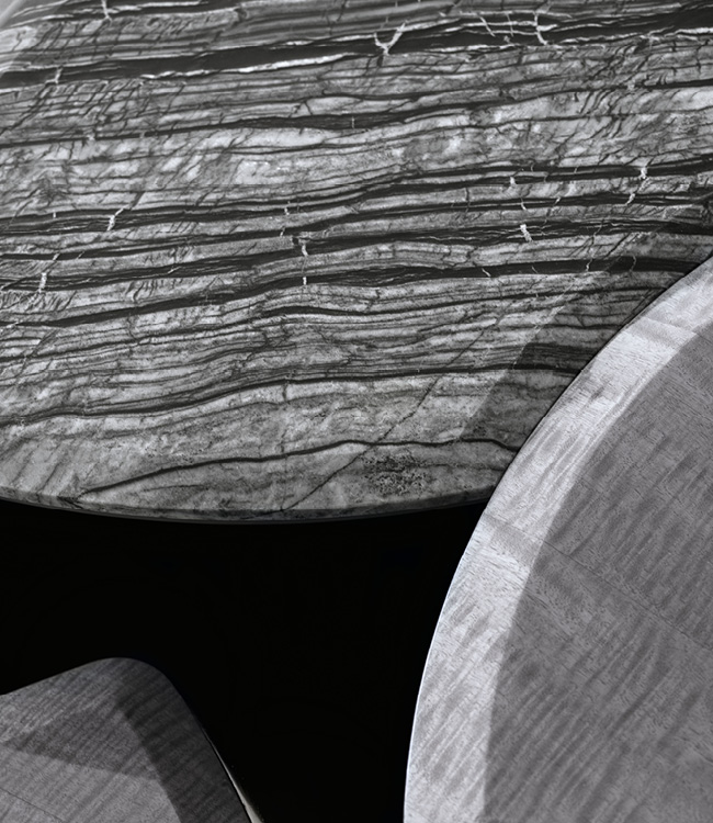 Round side table with top in combination of Black Kenya marble and Madagascar figured Mowinghi veneer in high gloss polyester fìnish. Curved legs in satin black nickel stainless steel with lasered Giorgio Collection logo.