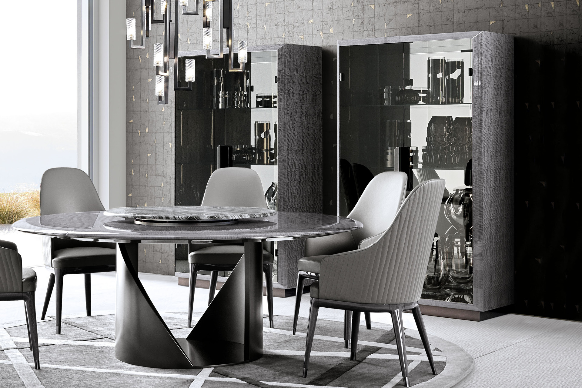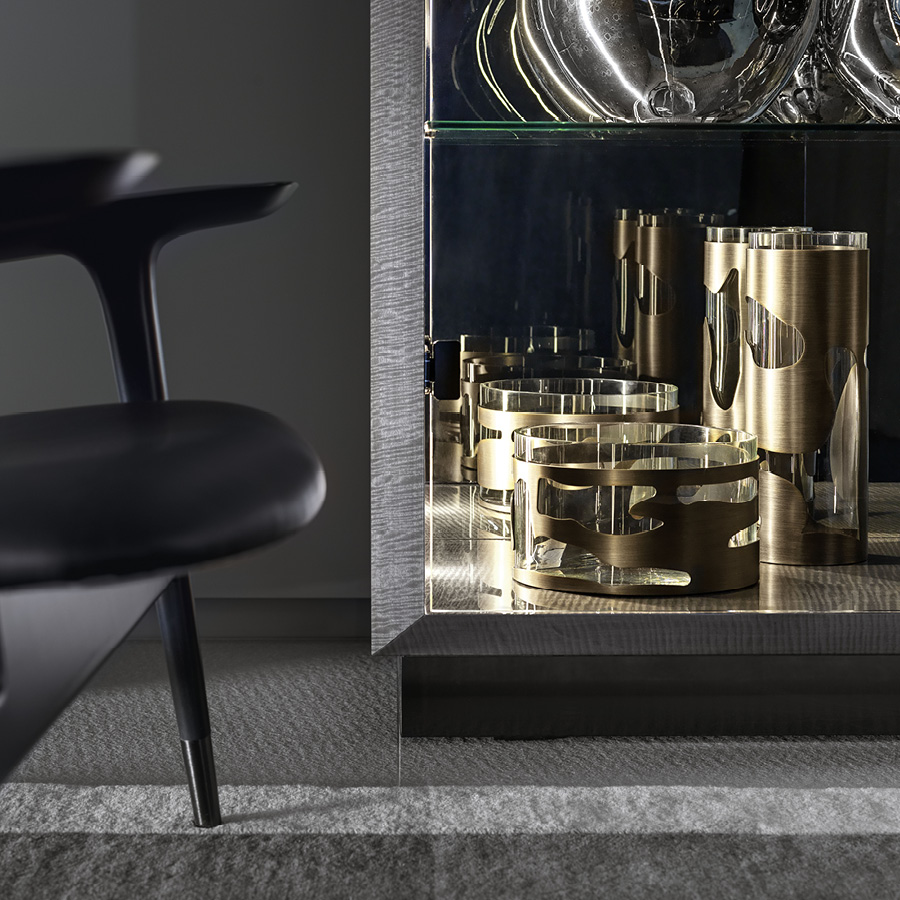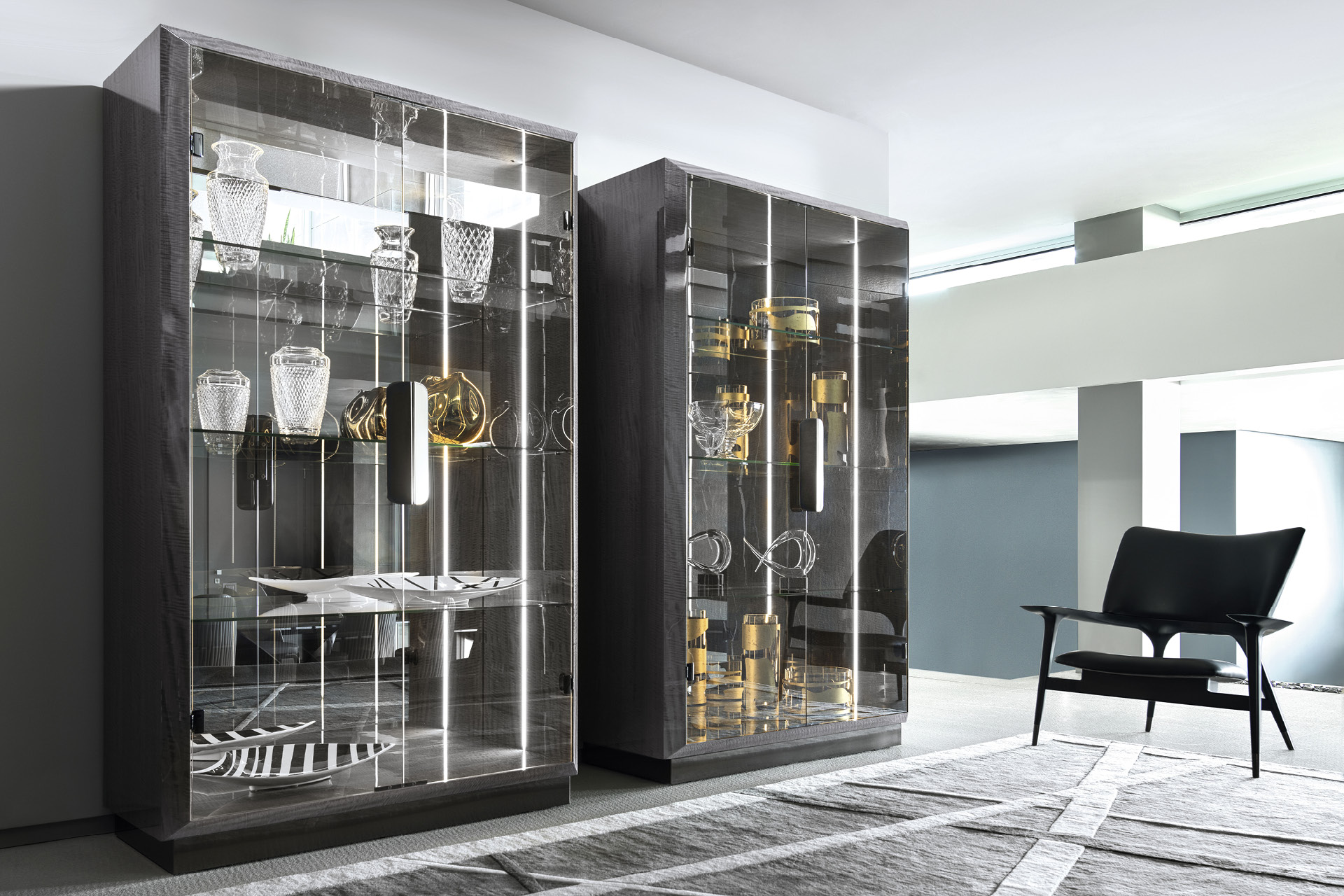 Vetrine with 2 glass doors, structure in Madagascar figured Mowinghi veneer with high gloss polyester fìnish. Base and handles in satin black nickel stainless steel. 4 led lights including switch. 3 inside adjustable glass shelves.