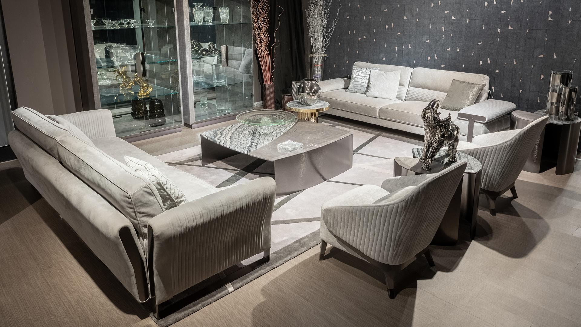 Vetrine with 2 glass doors, structure in Madagascar figured Mowinghi veneer with high gloss polyester fìnish. Base and handles in satin black nickel stainless steel. 4 led lights including switch. 3 inside adjustable glass shelves.
