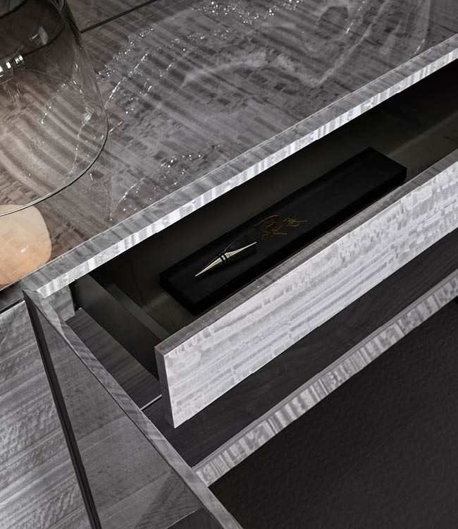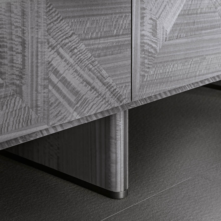 Buffet in inlaid Tasmanian curly Eucaliptus veneer with high gloss polyester finish. Top, sides and legs with insert in satin grey nickel stainless steel. 1 interior full extension drawer with front in Tasmanian curly Eucaliptus veneer with high gloss polyester finish, bottom part in velvet fabric. 3 adjustable tempered glass shelves.
