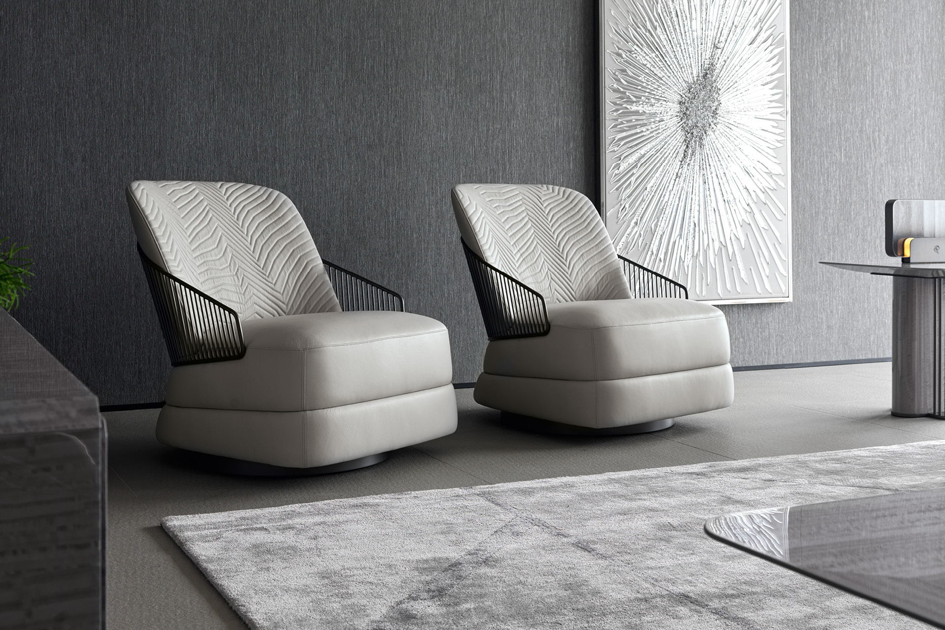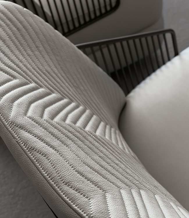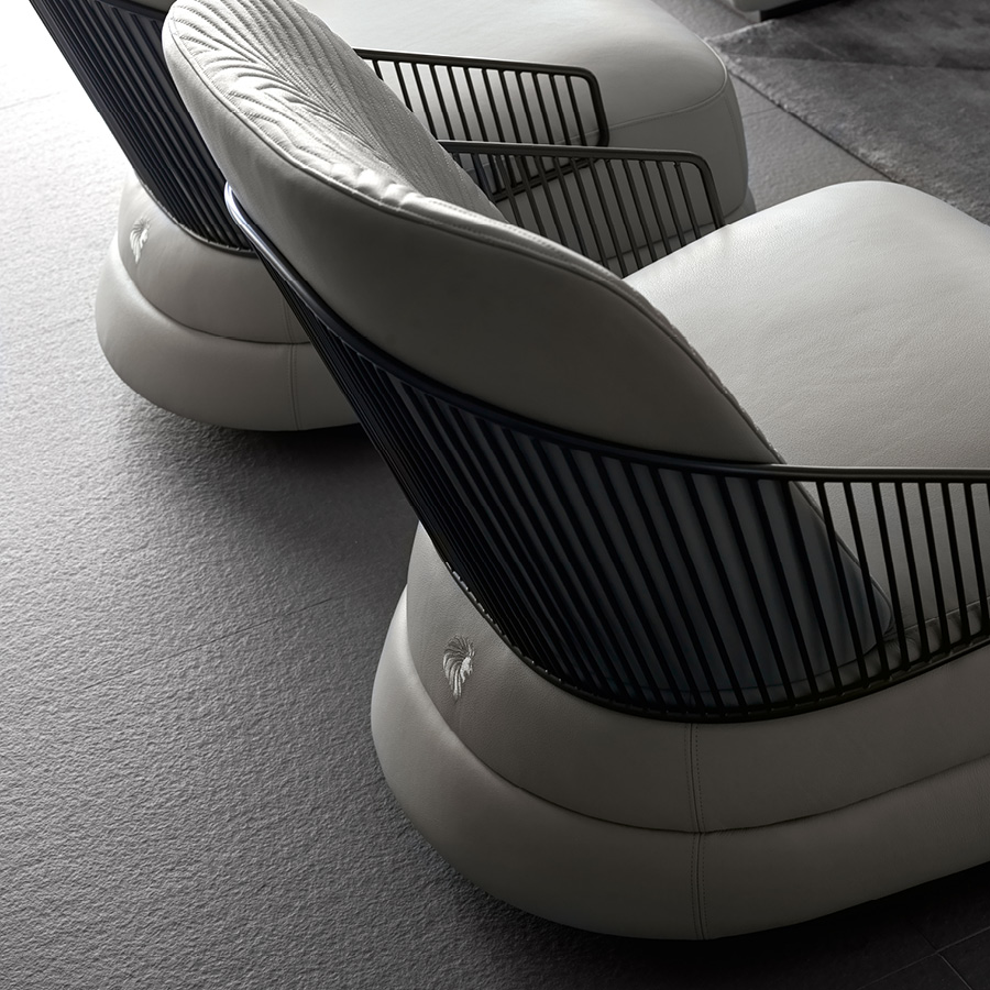 Occasional swivel chair available in first grade leather, nubuk leather, lizard printed leather, velvet or suede fabric. Chair seat and sides with double stitching in polyurethane foam wrapped in down feather. Quilted back with satin grey nickel stainless steel structure with embroidered Giorgio Collection logo on the base.