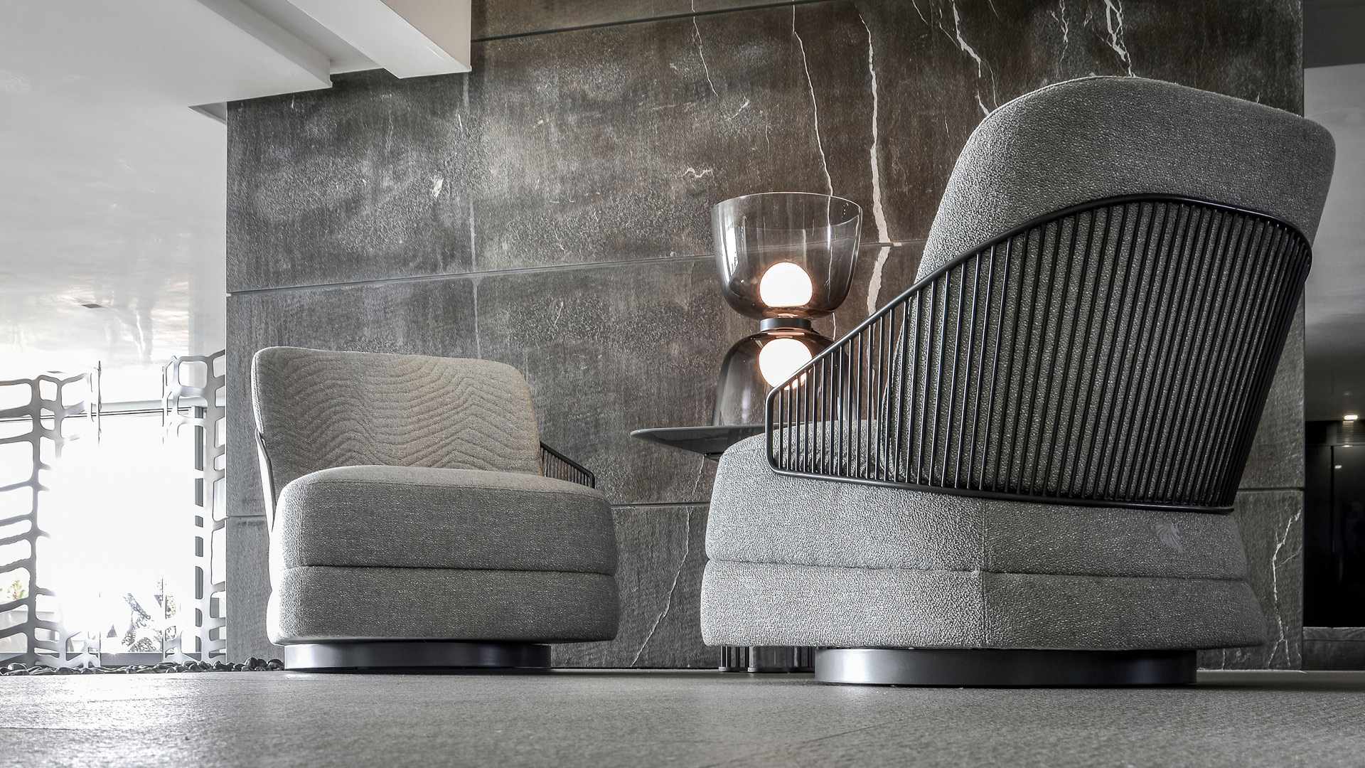 Occasional swivel chair available in first grade leather, nubuk leather, lizard printed leather, velvet or suede fabric. Chair seat and sides with double stitching in polyurethane foam wrapped in down feather. Quilted back with satin grey nickel stainless steel structure with embroidered Giorgio Collection logo on the base.