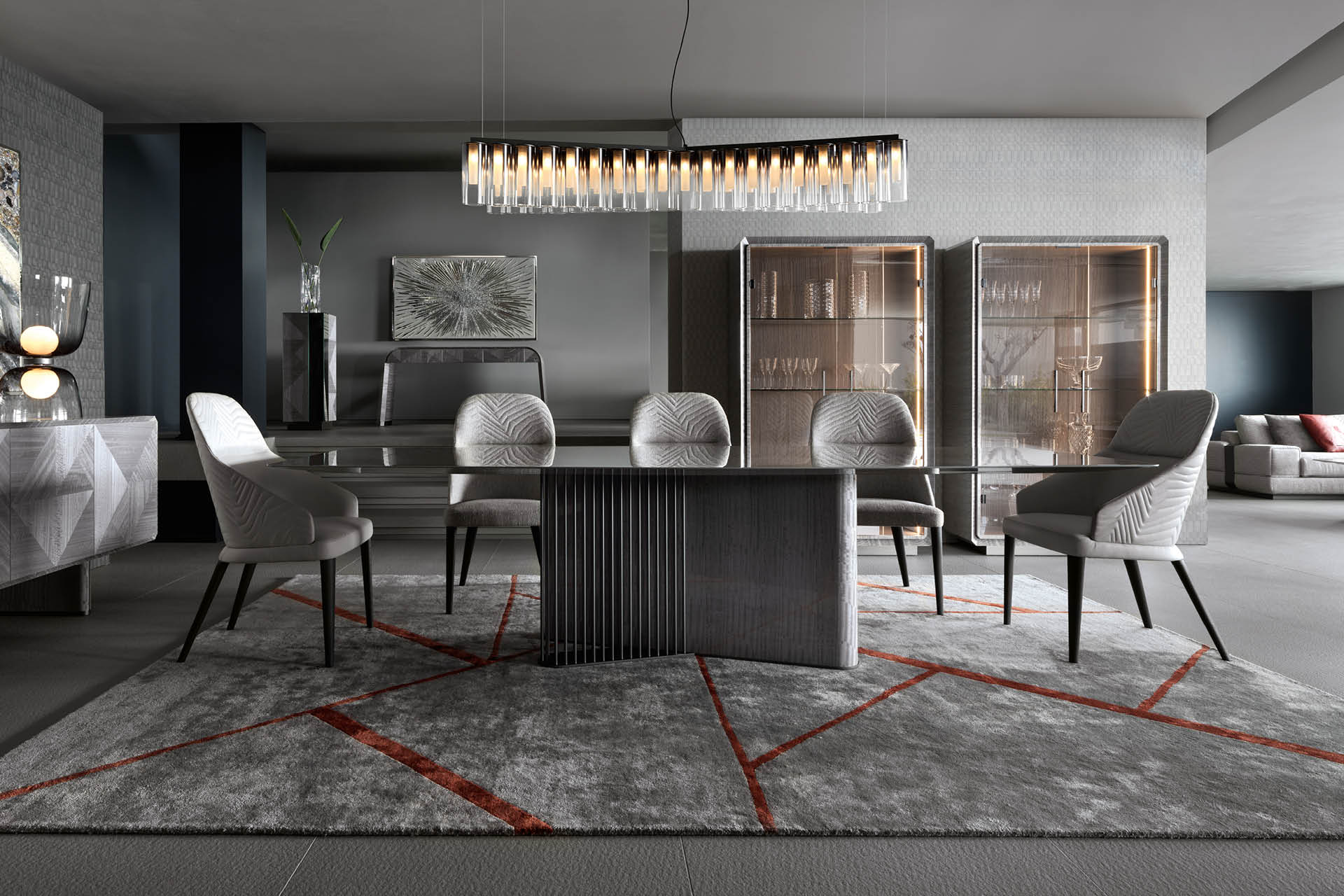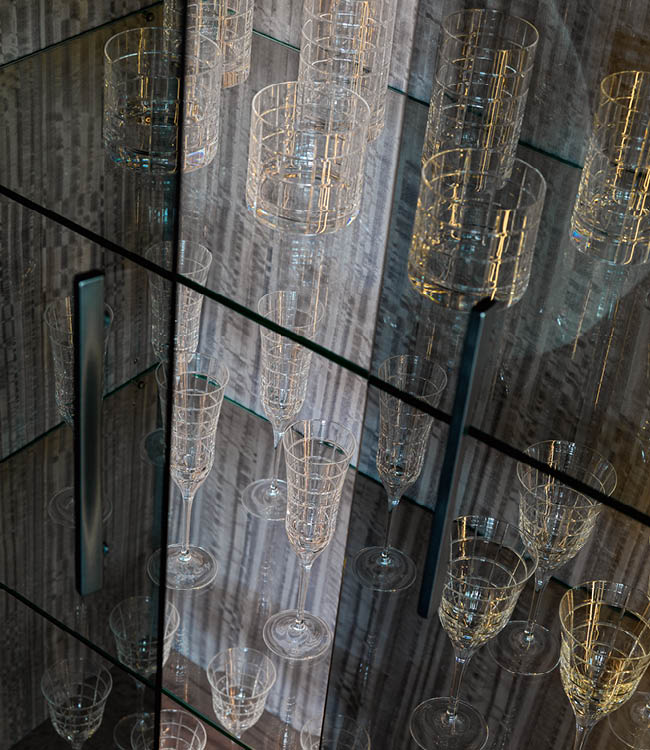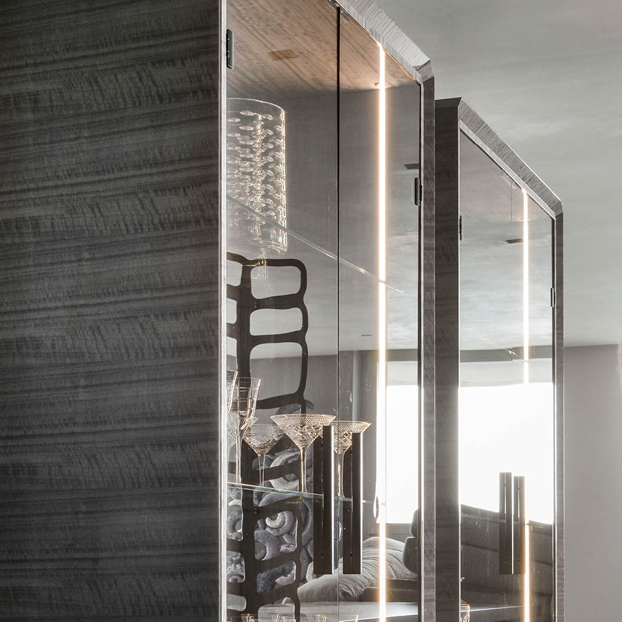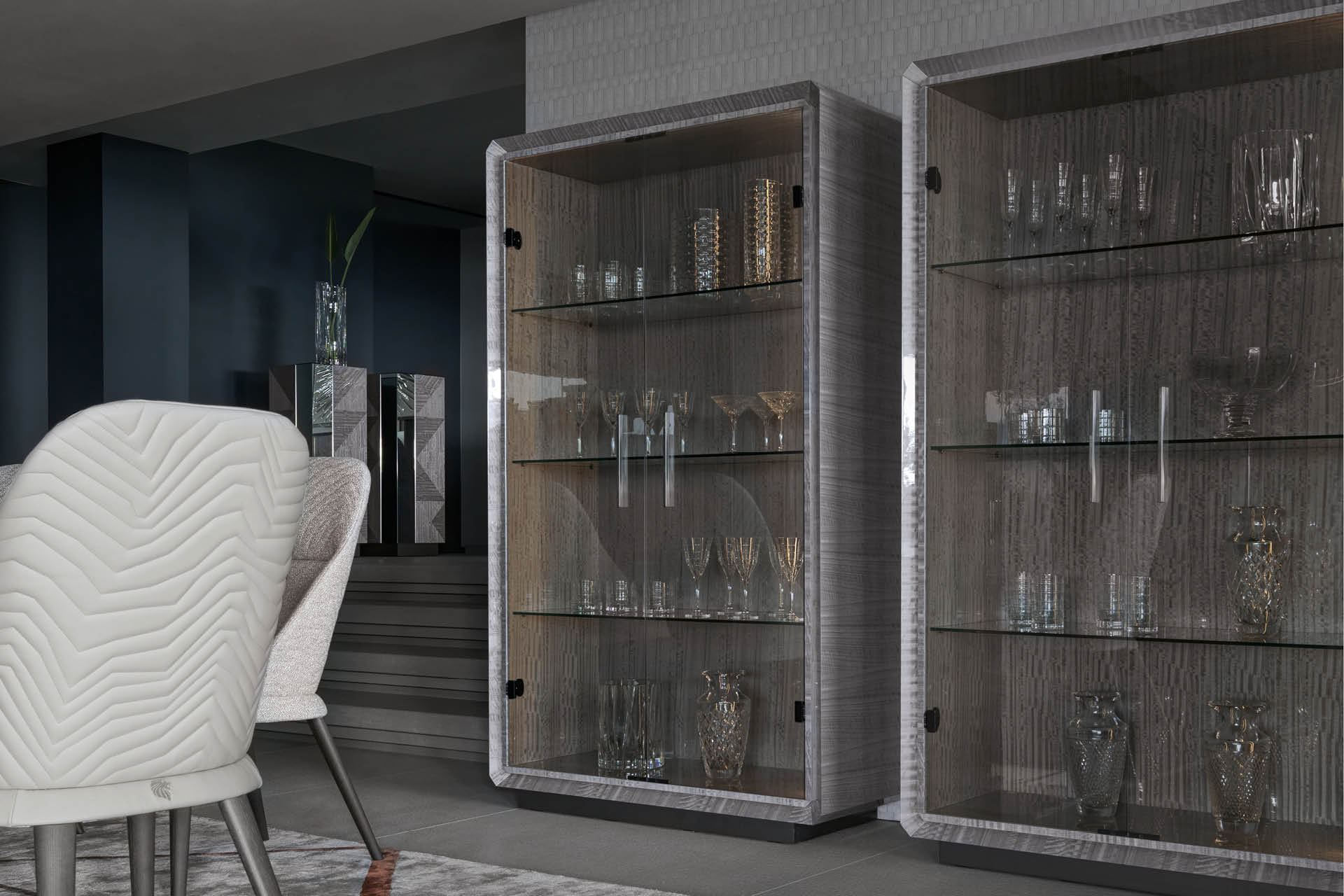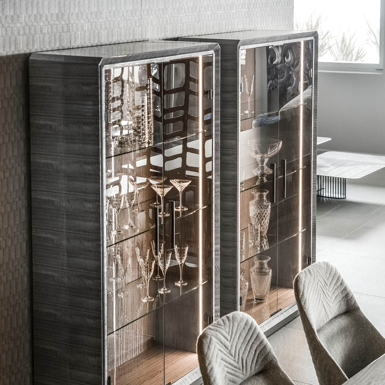 Vetrine with 2 glass doors, structure in Tasmanian curly Eucaliptus veneer with high gloss polyester finish. Base and handles in satin grey nickel stainless steel. Led lights including switch. 3 inside adjustable tempered glass shelves.