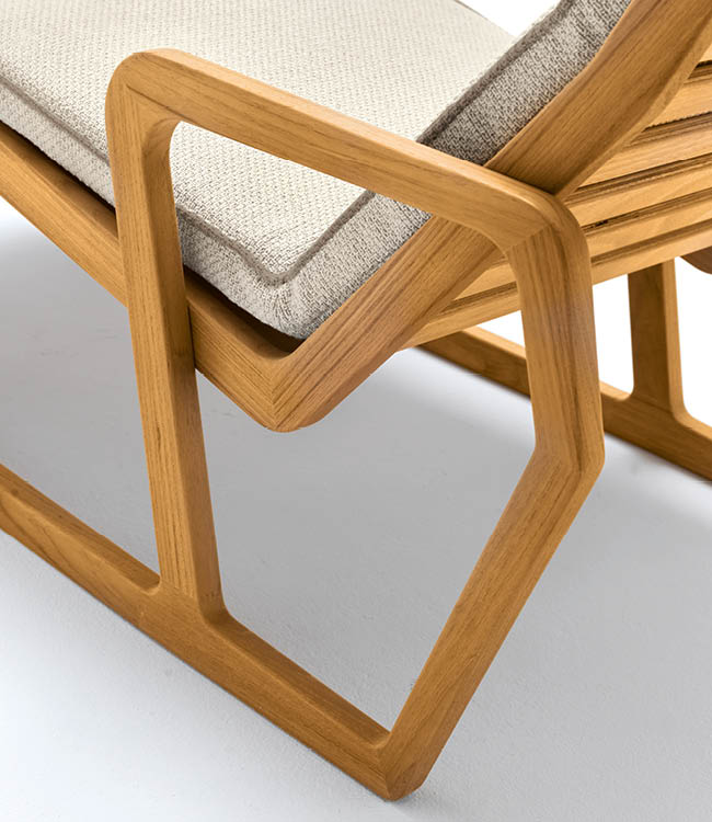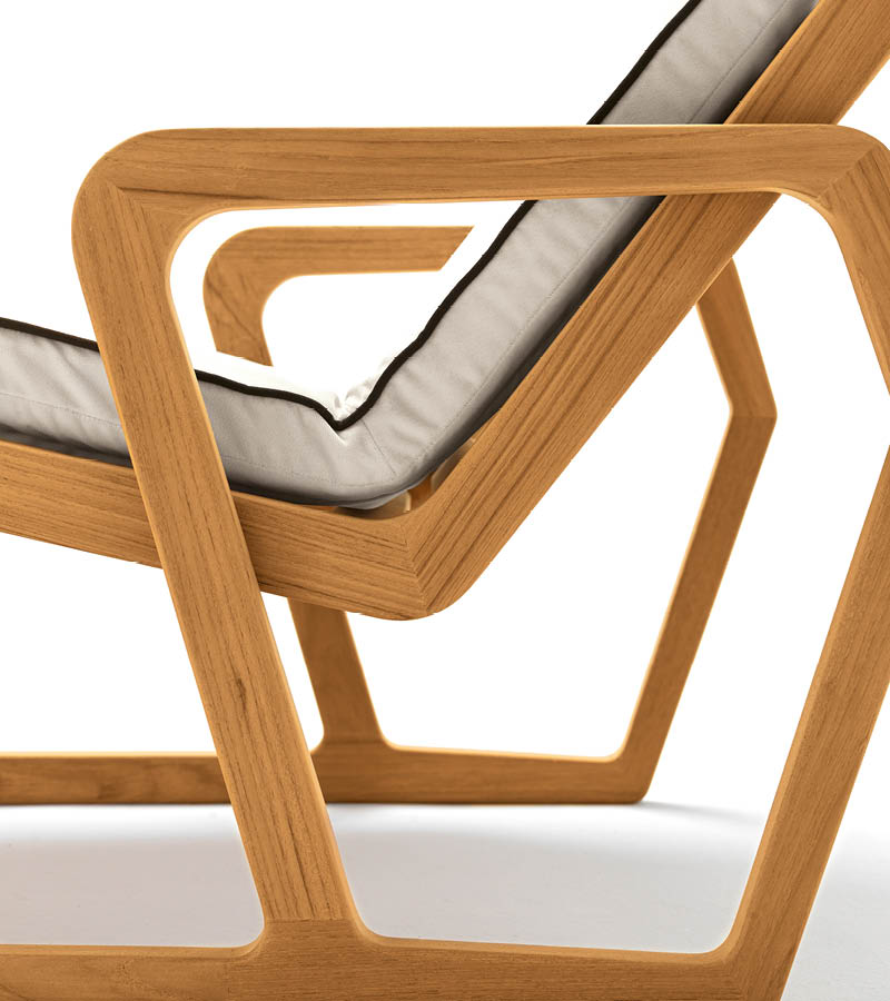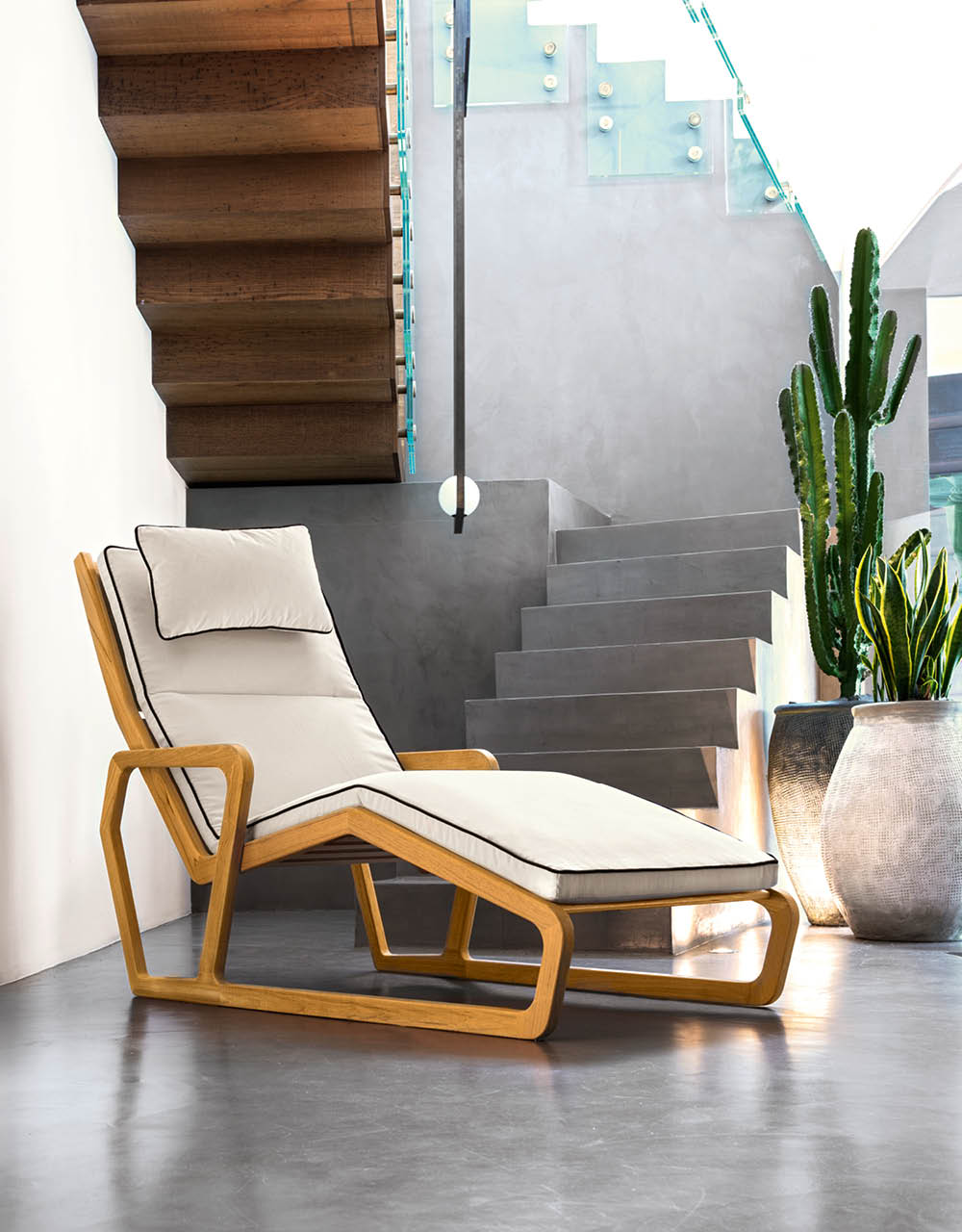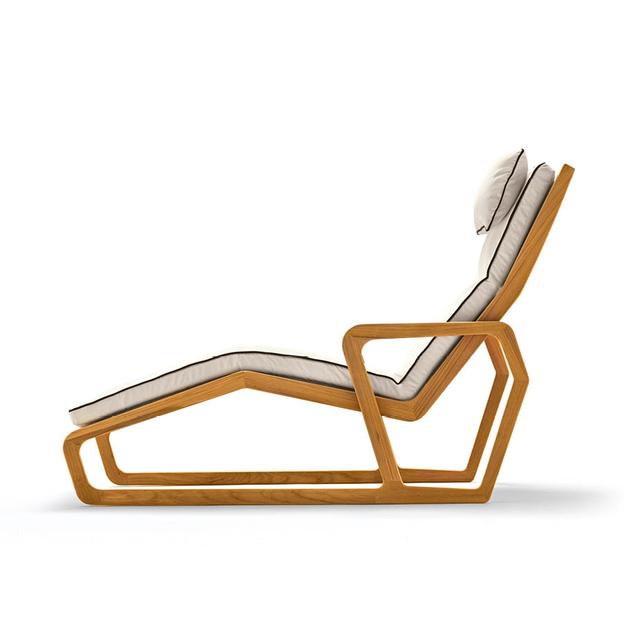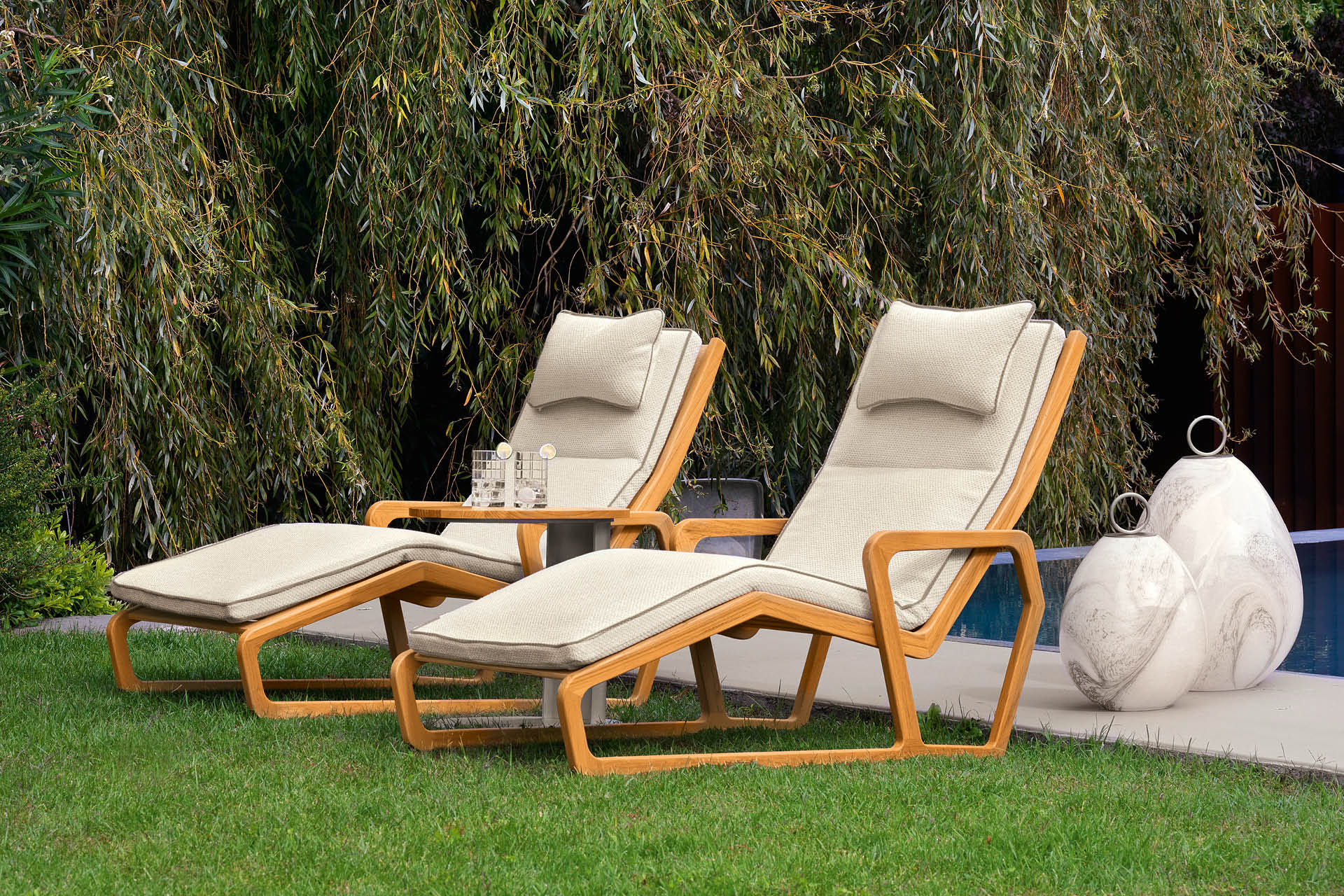 Outdoor deckchair available in special treated fabric or first grade leather. Structure in solid natural Burma Teak.