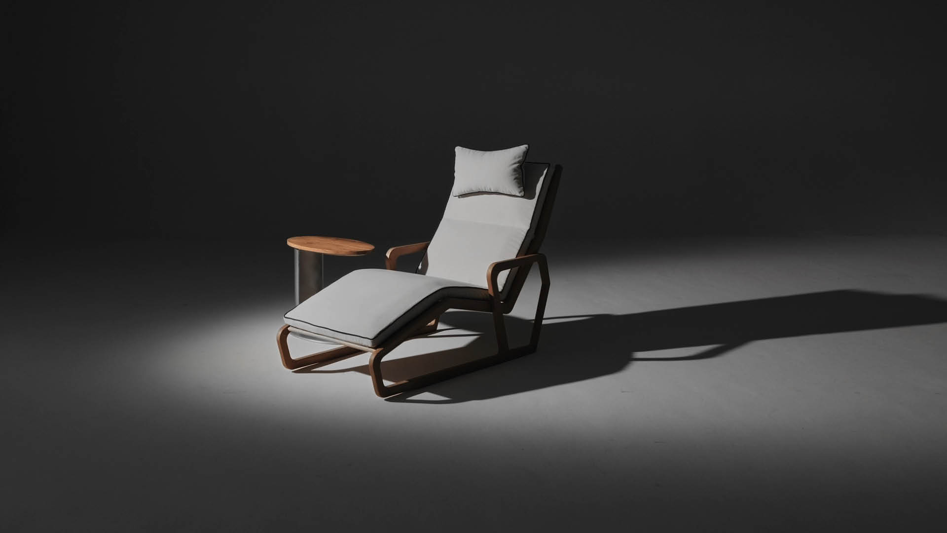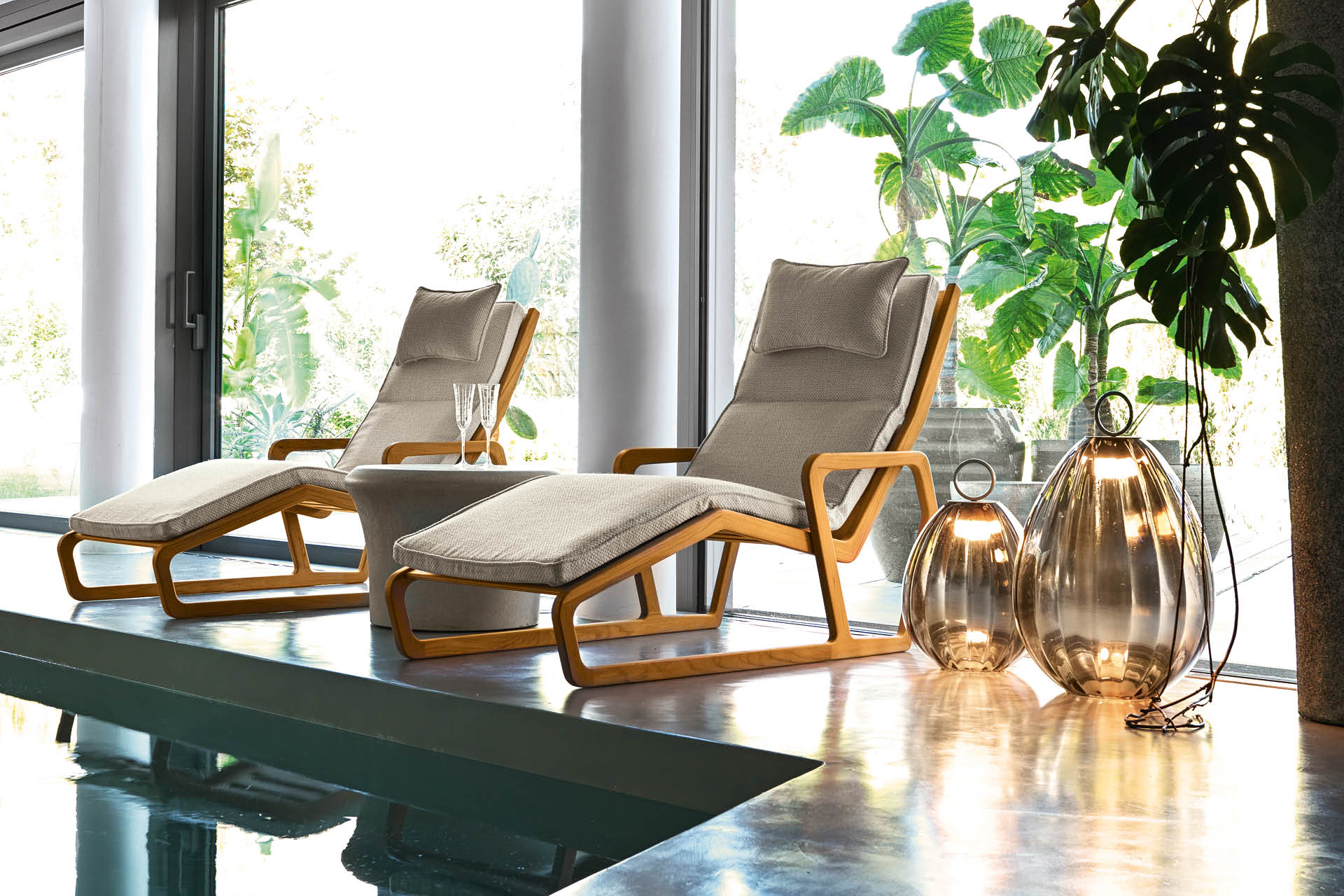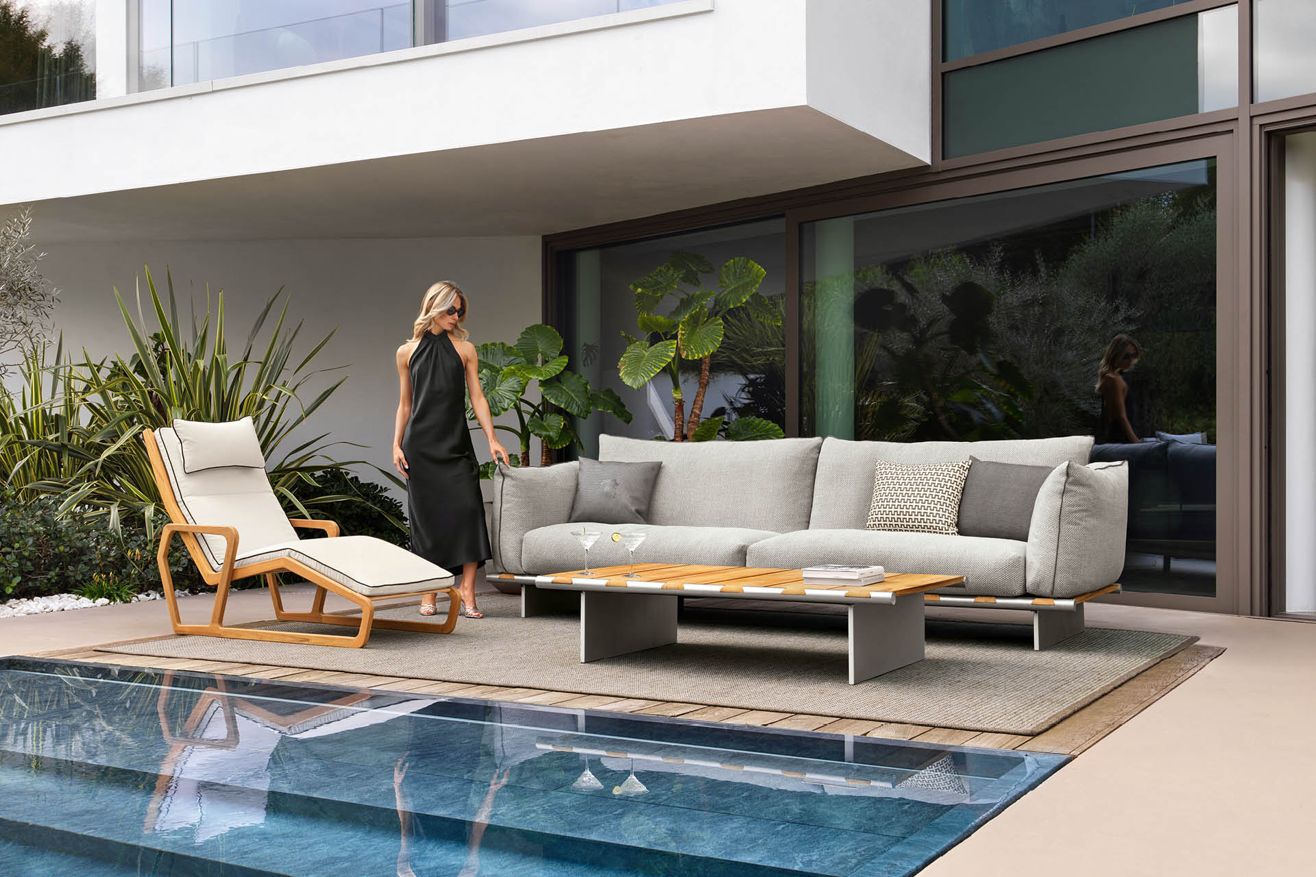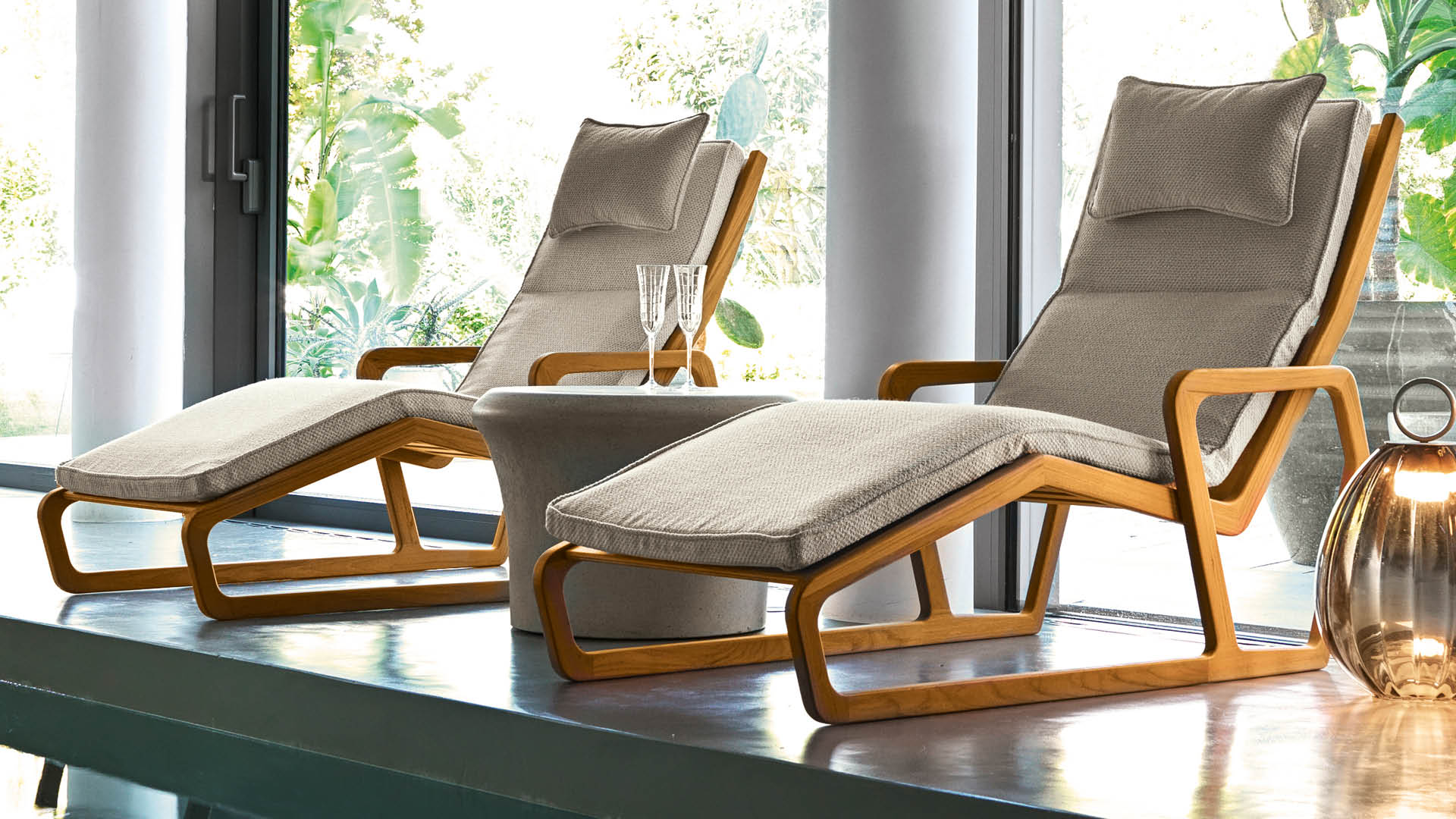 Outdoor deckchair available in special treated fabric or first grade leather. Structure in solid natural Burma Teak.