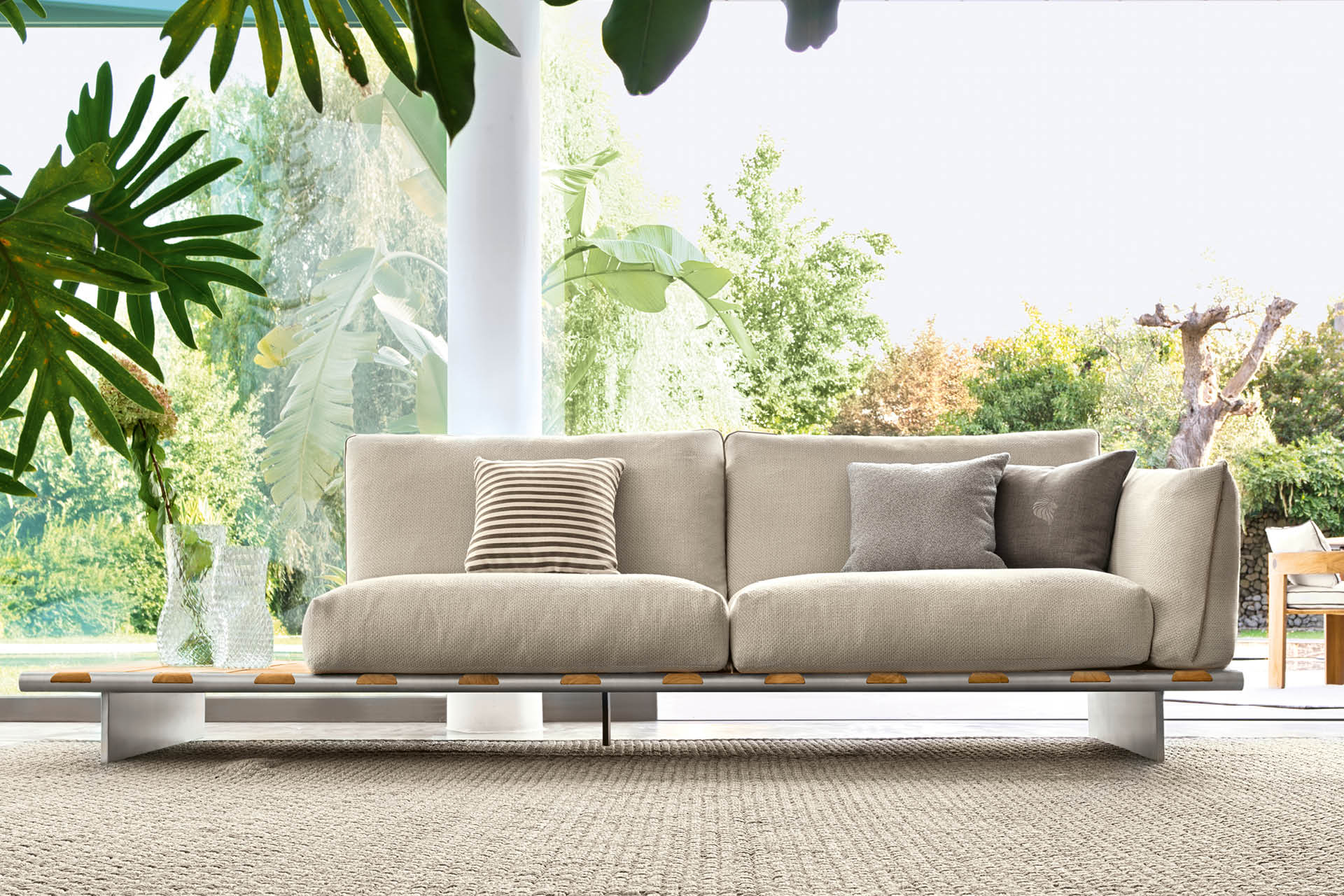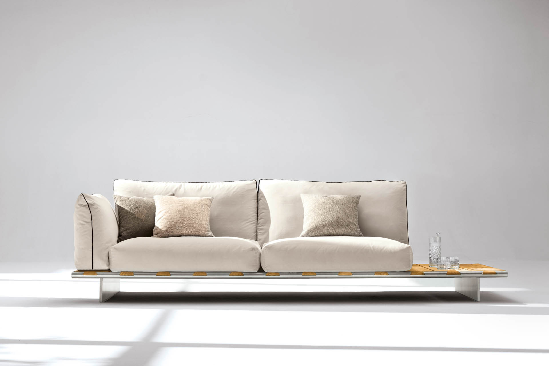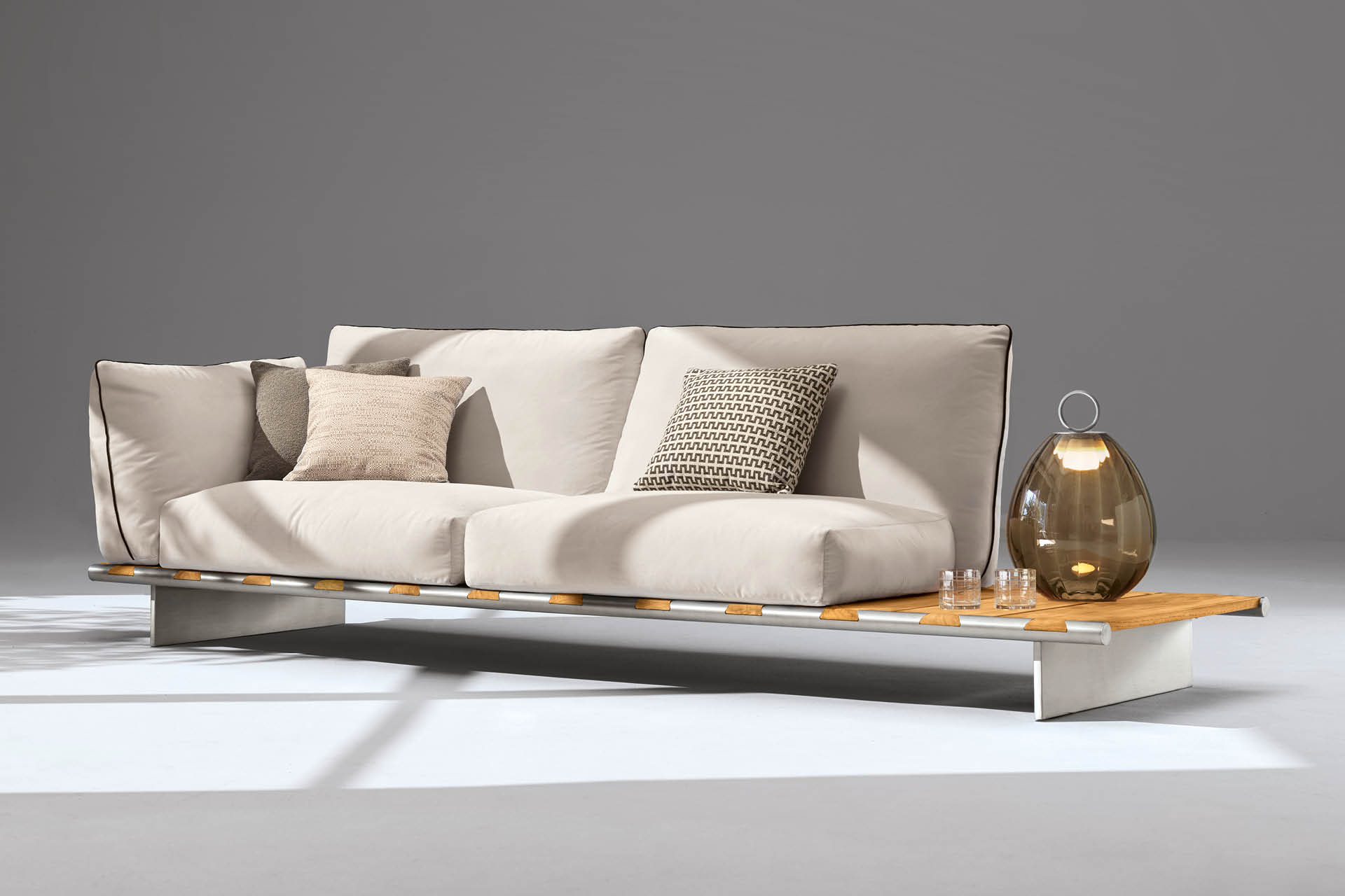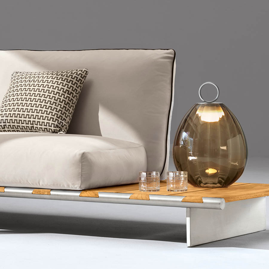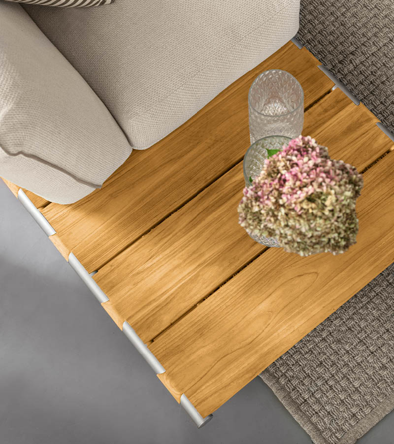 Outdoor sofa with wooden table available in special treated fabric or first grade leather. Base made by slats of solid natural Burma Teak in combination with two tubular structures in satined stainless steel with Giorgio Collection logo. Legs in satined stainless steel. Cushions filling in waterproof dacron.