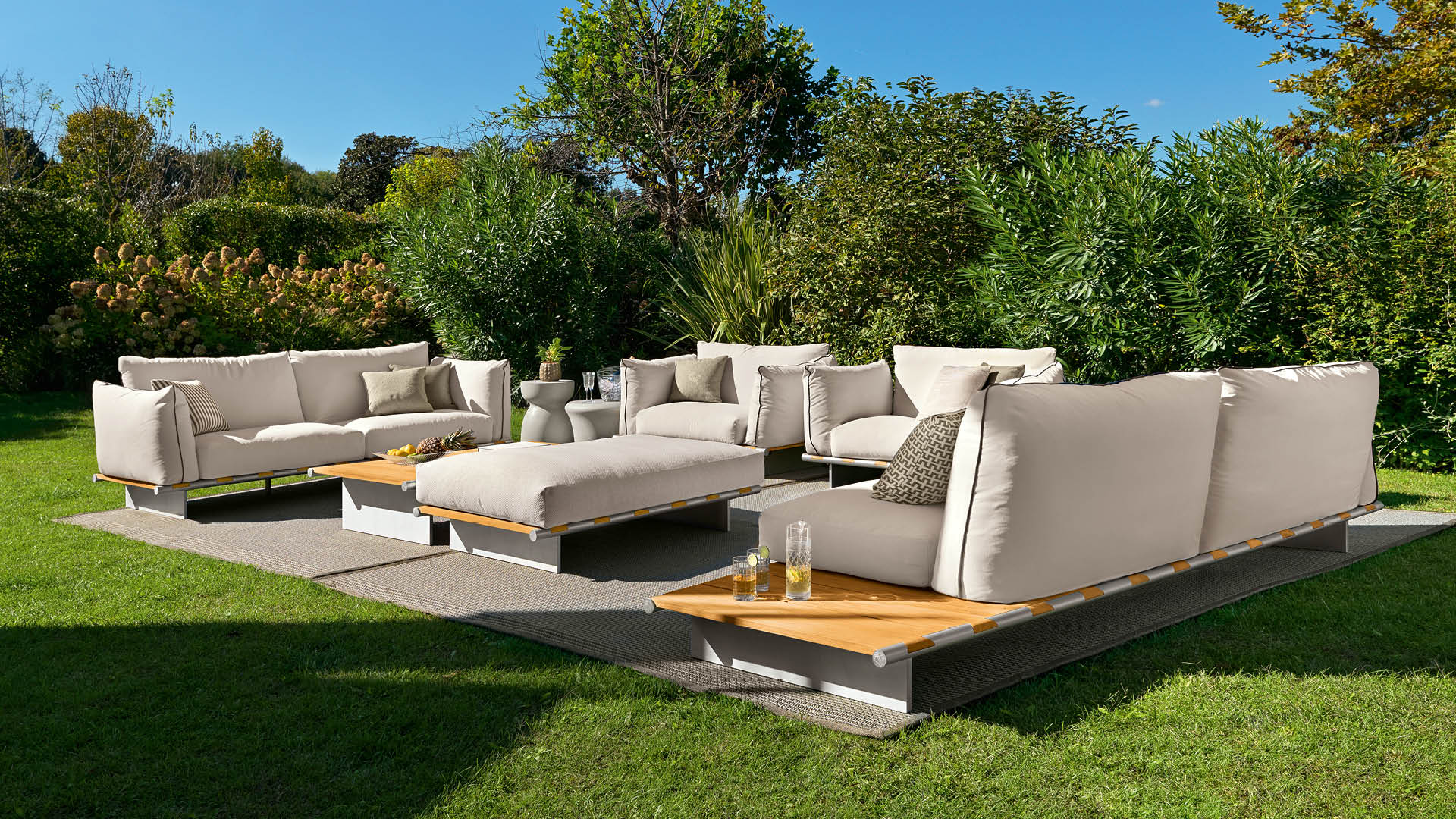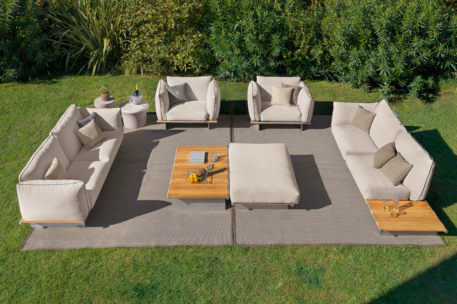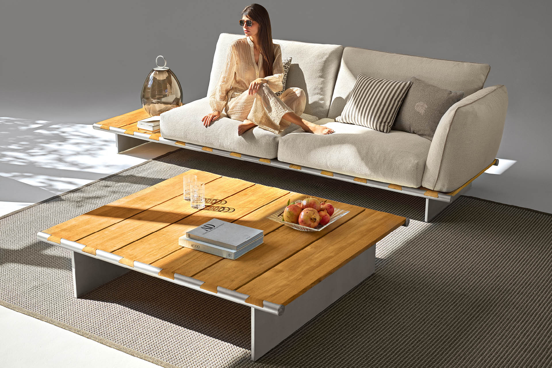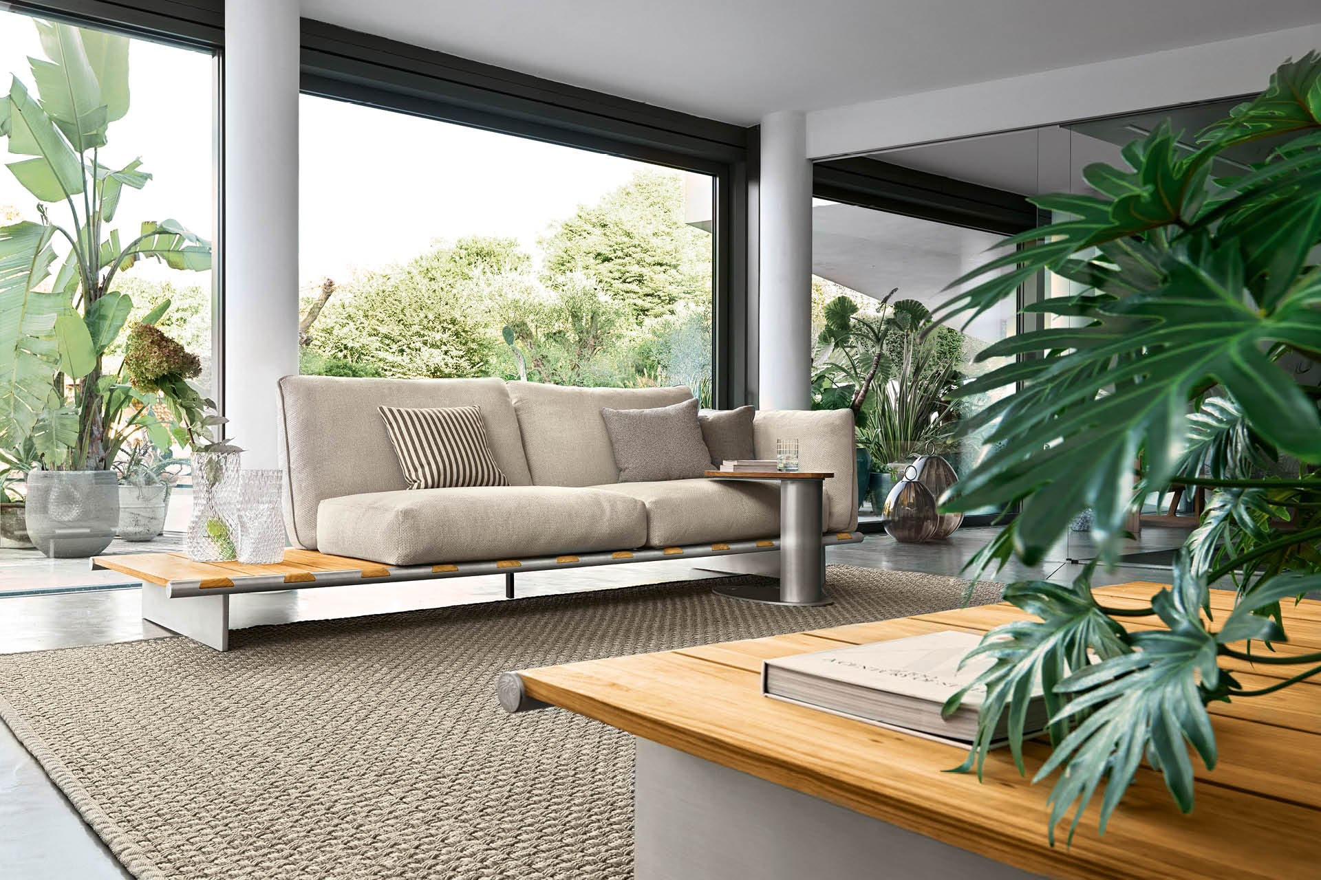 Outdoor sofa with wooden table available in special treated fabric or first grade leather. Base made by slats of solid natural Burma Teak in combination with two tubular structures in satined stainless steel with Giorgio Collection logo. Legs in satined stainless steel. Cushions filling in waterproof dacron.