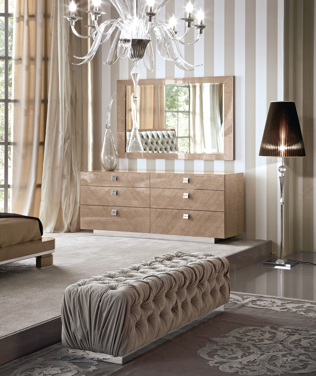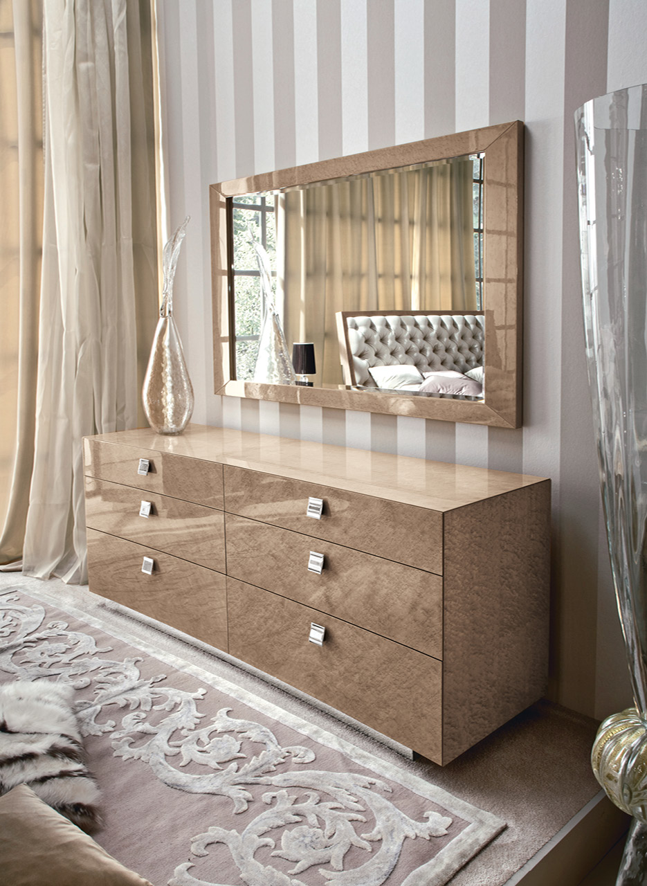 Dresser available in high gloss polyester champagne bird’s eye maple veneer. Chrome stainless steel handles and base.