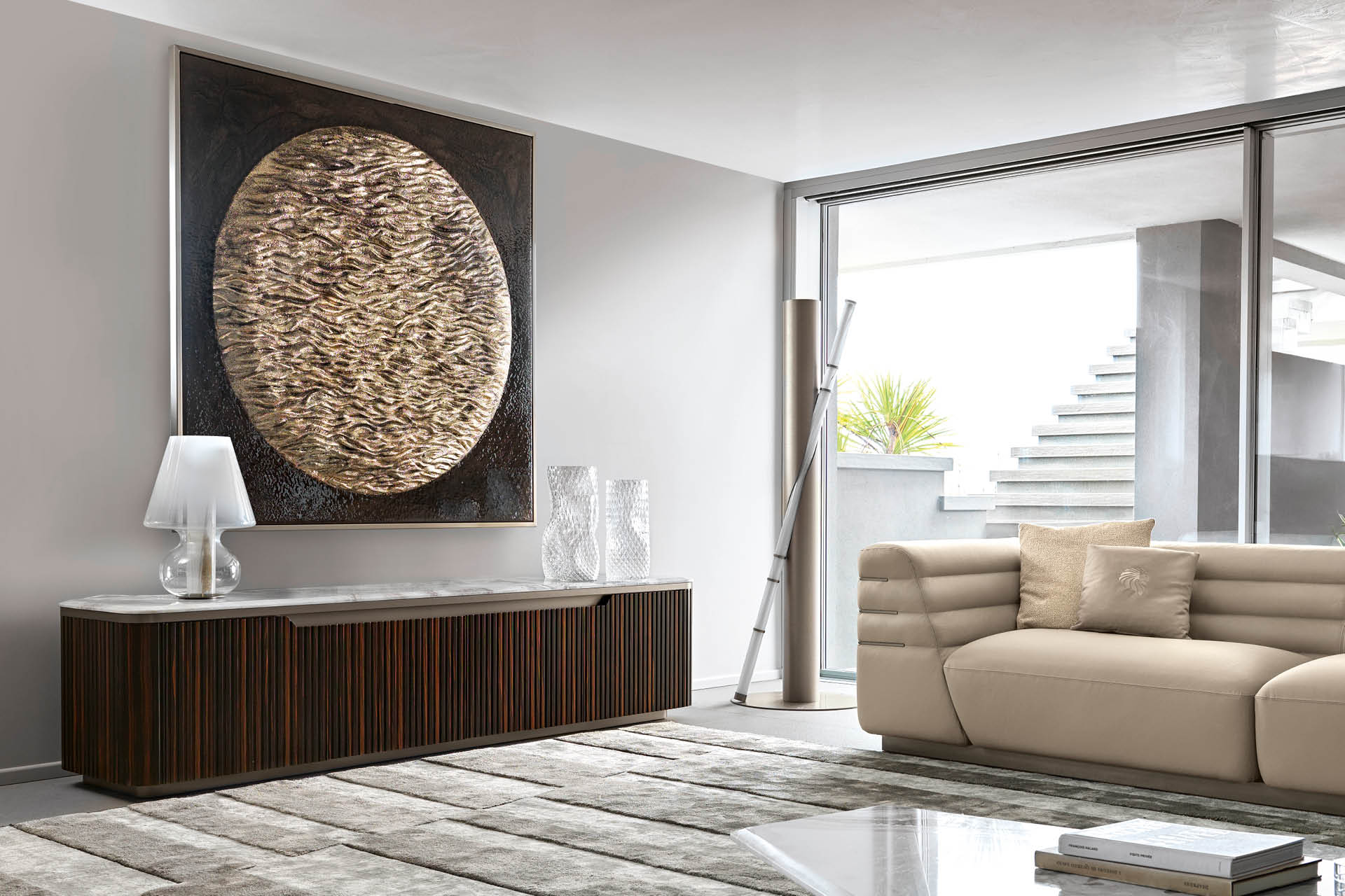 Square painting in wooden structure with satined galvanized titanium finish stainless steel frame. High relief epoxy resin with UV protection base and gold details.