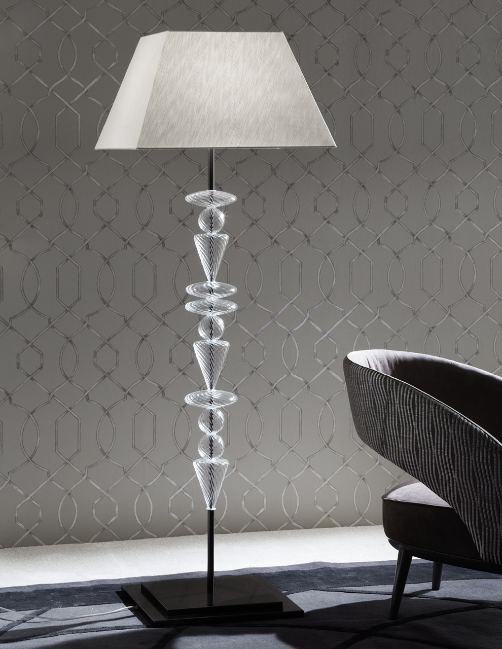 Venetian "Murano" blown clear glass Floor lamp. Base in black nickel steel. Cream satin silk shade.