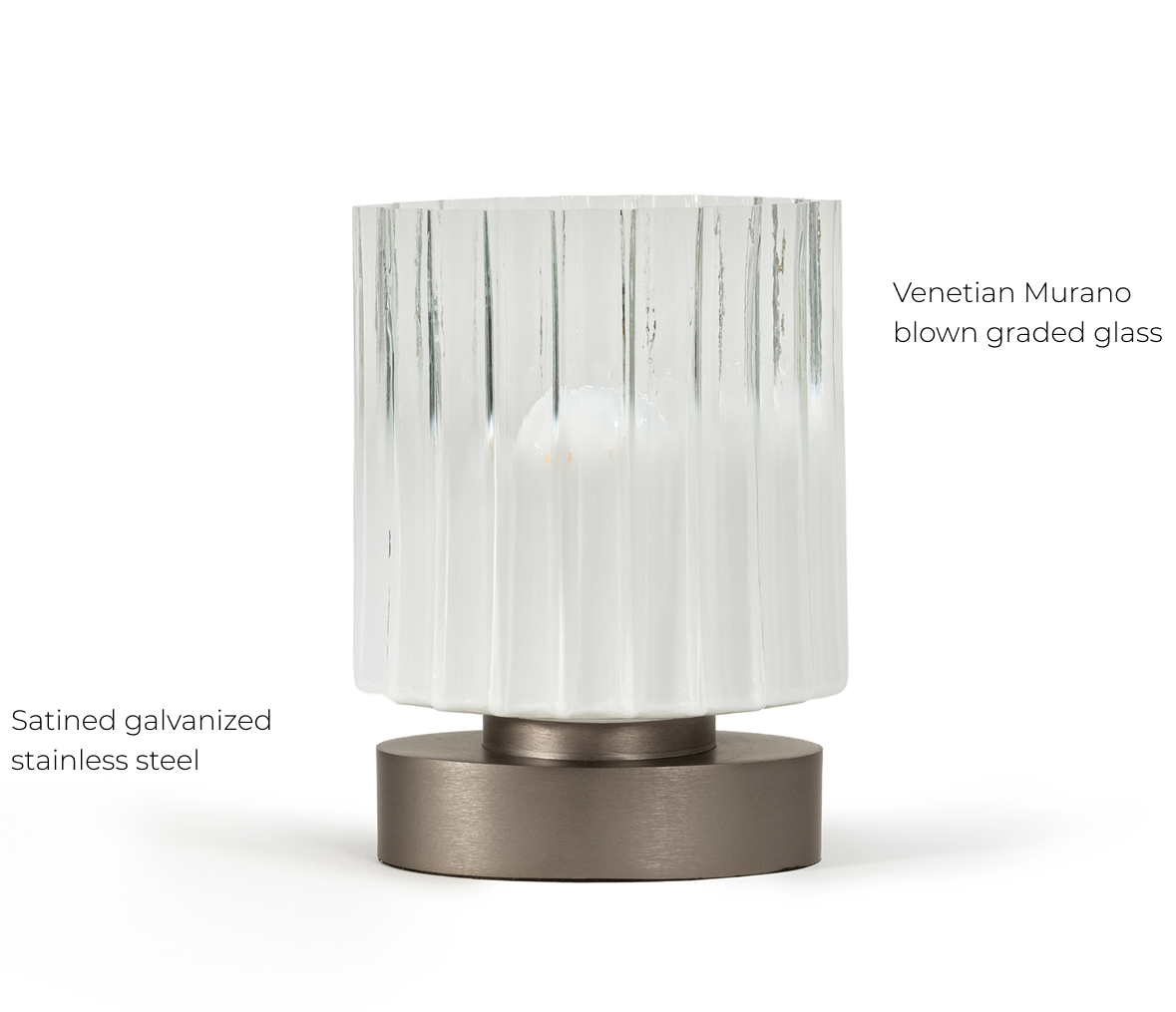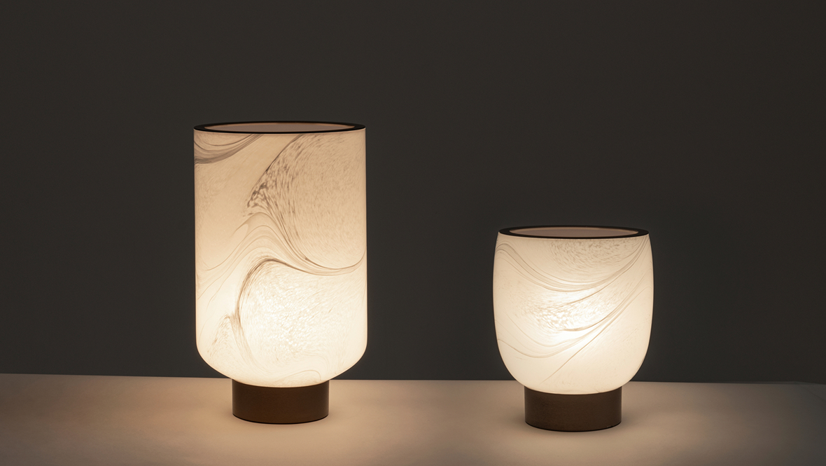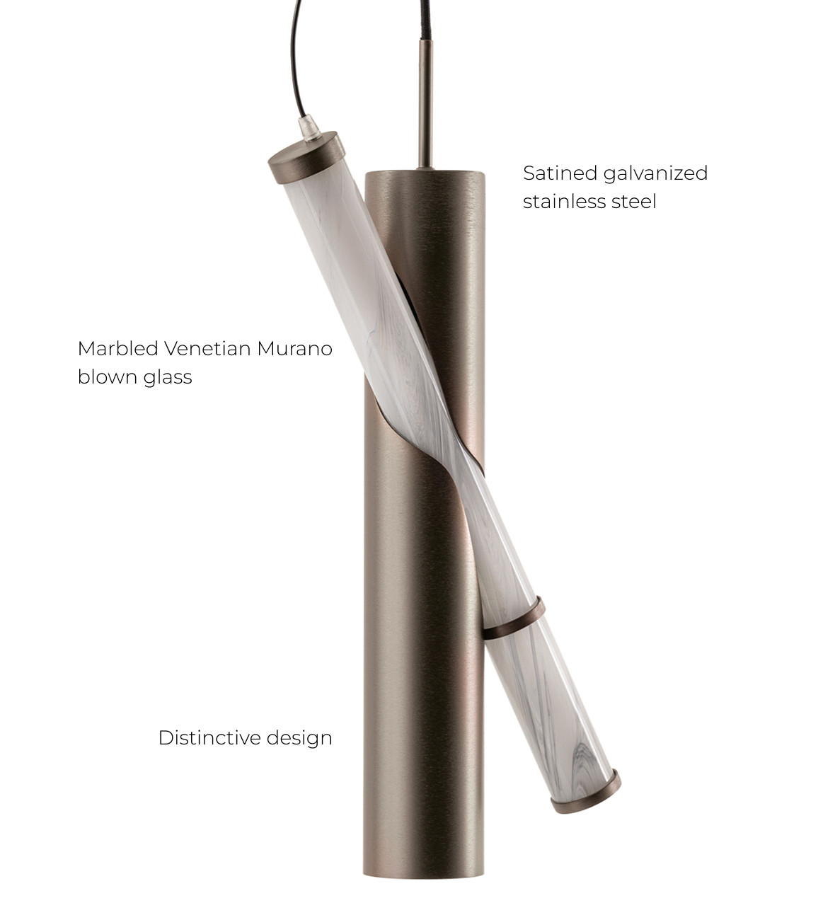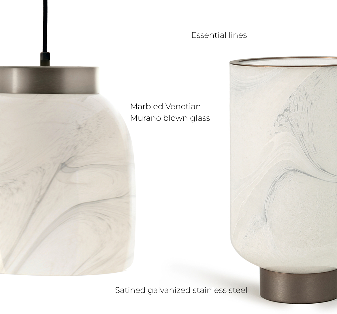 Ramses evokes elegant simplicity and sculptural balance. Minimalistic yet irresistibly chic, this range of chandeliers and lamps feature essential lines and refined tones thanks to the Marbled Venetian Murano blown glass and details in satined galvanized titanium finish stainless steel, creating a sophisticated interplay of texture.