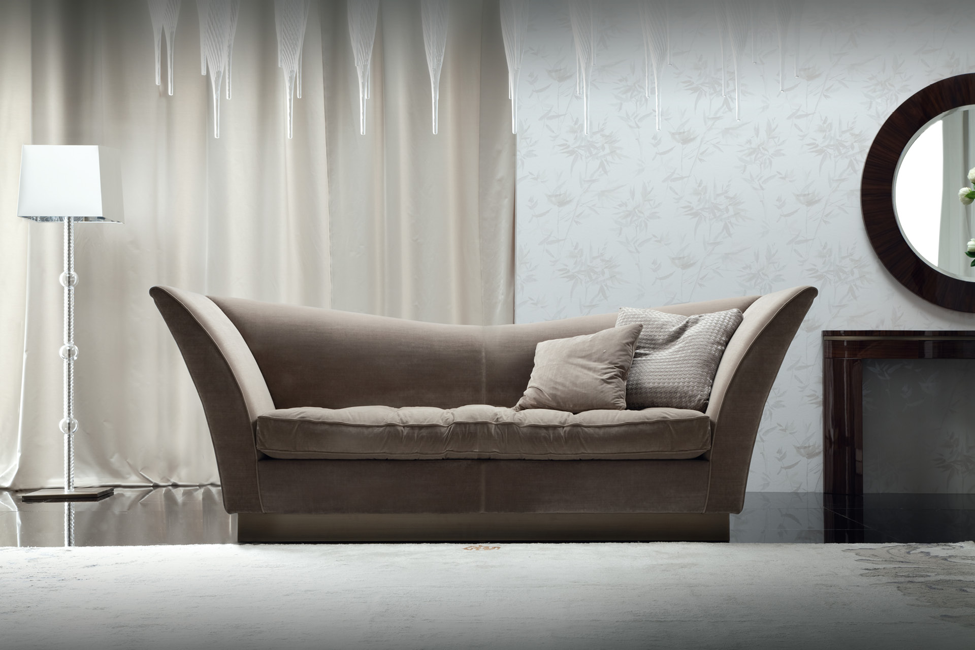 Фиксированный диван с n. 2 сиденьями и n. 2 броскими подушками. Основание из бронзовой нержавеющей стали.