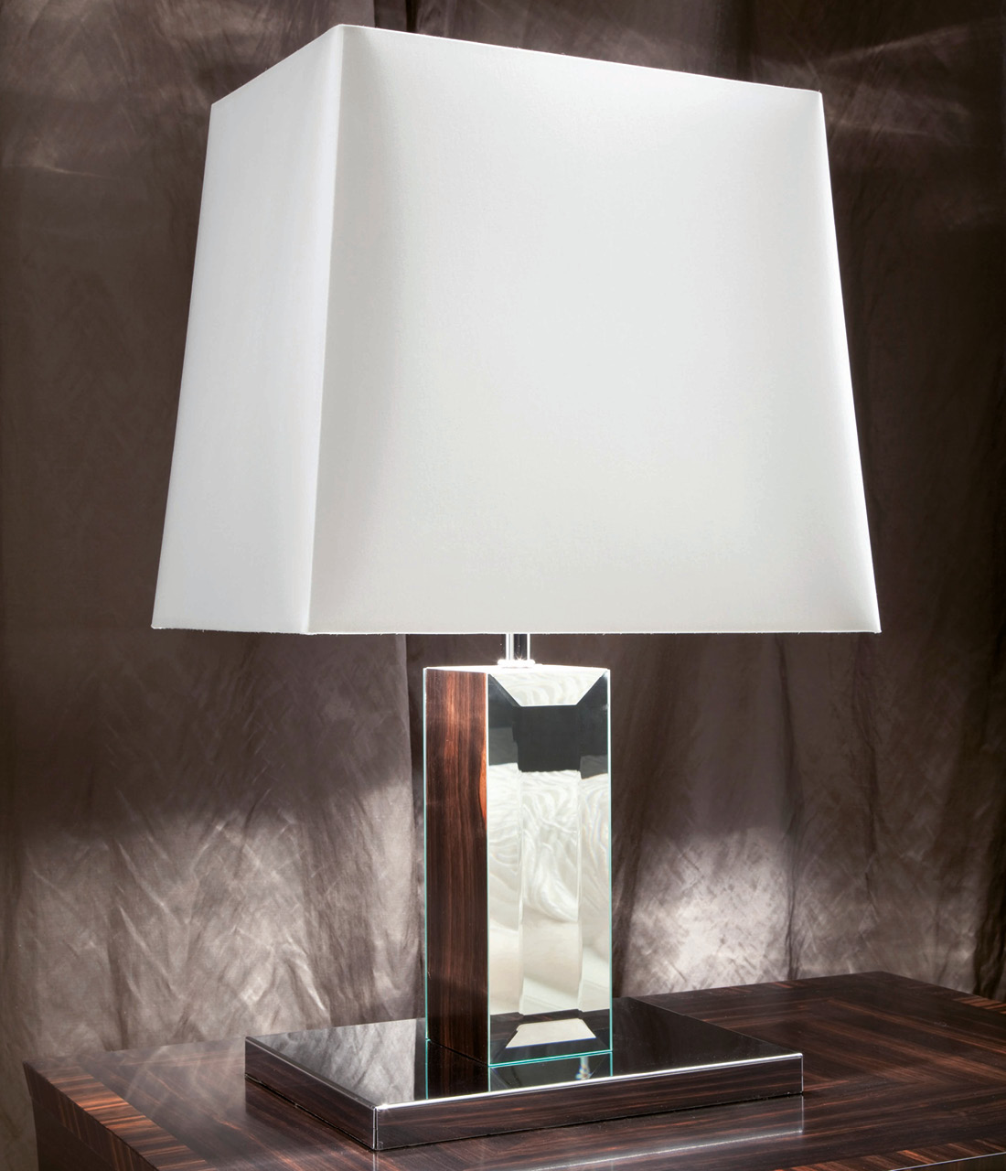 Керамическая лампа бежевого цвета с логотипом "Giorgio collection" в платиновой отделке. Основание из хромированной нержавеющей стали. Абажур из белого атласного шелка.
