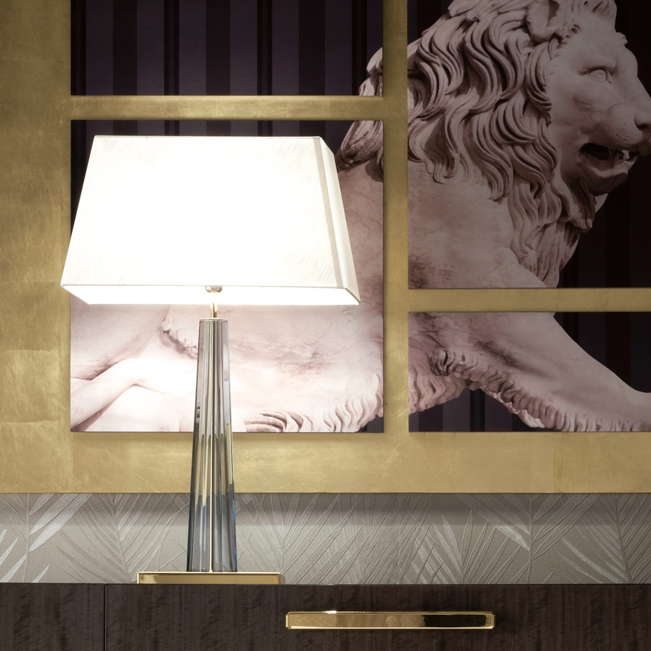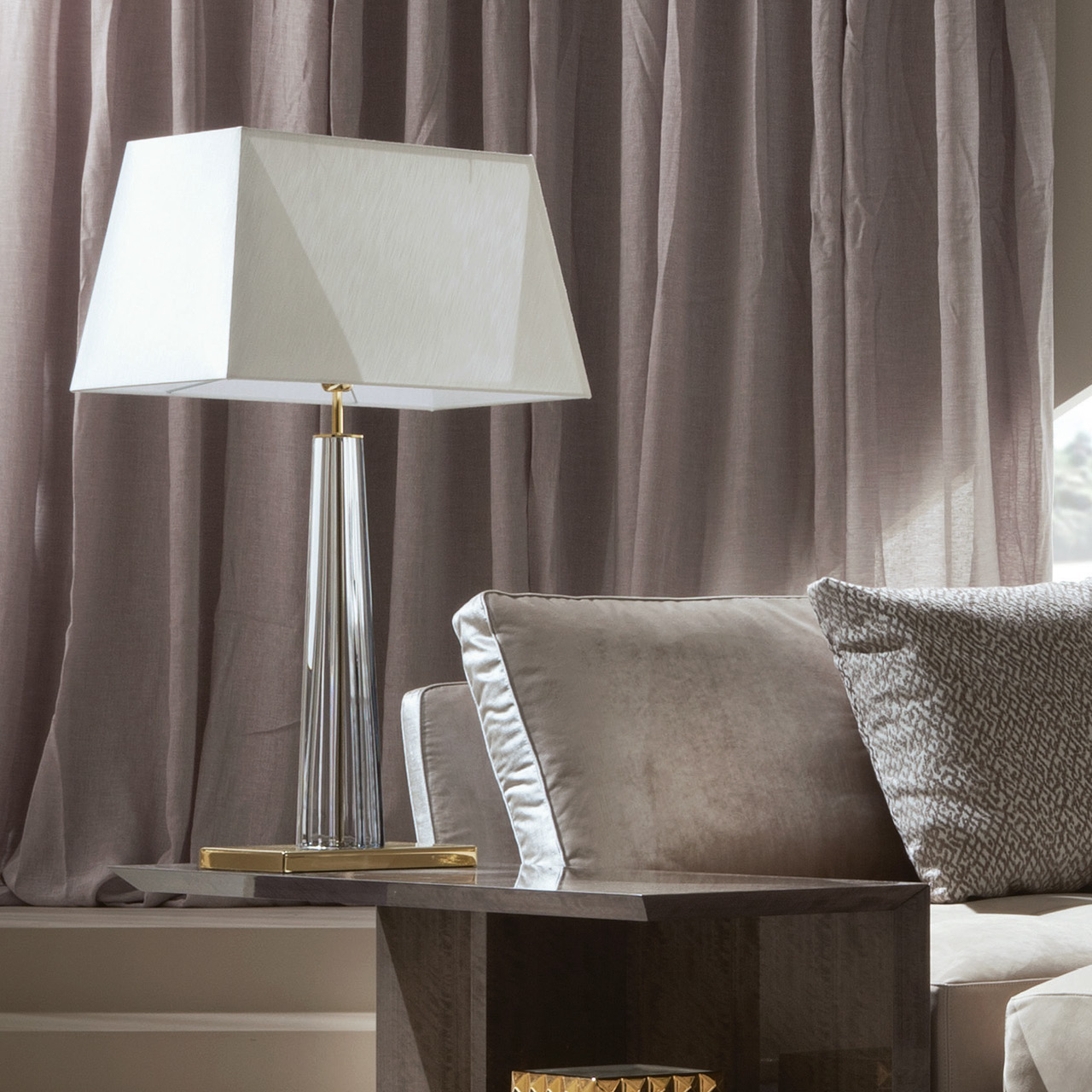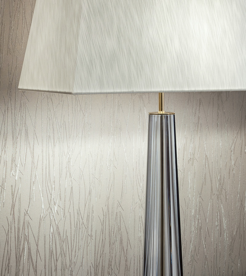 Светильник среднего размера из нержавеющей стали с золотистым хромом, структура из прозрачного венецианского стекла "Мурано". Абажур из белого шелка.