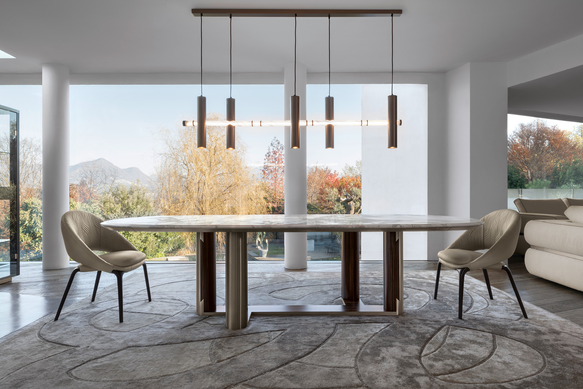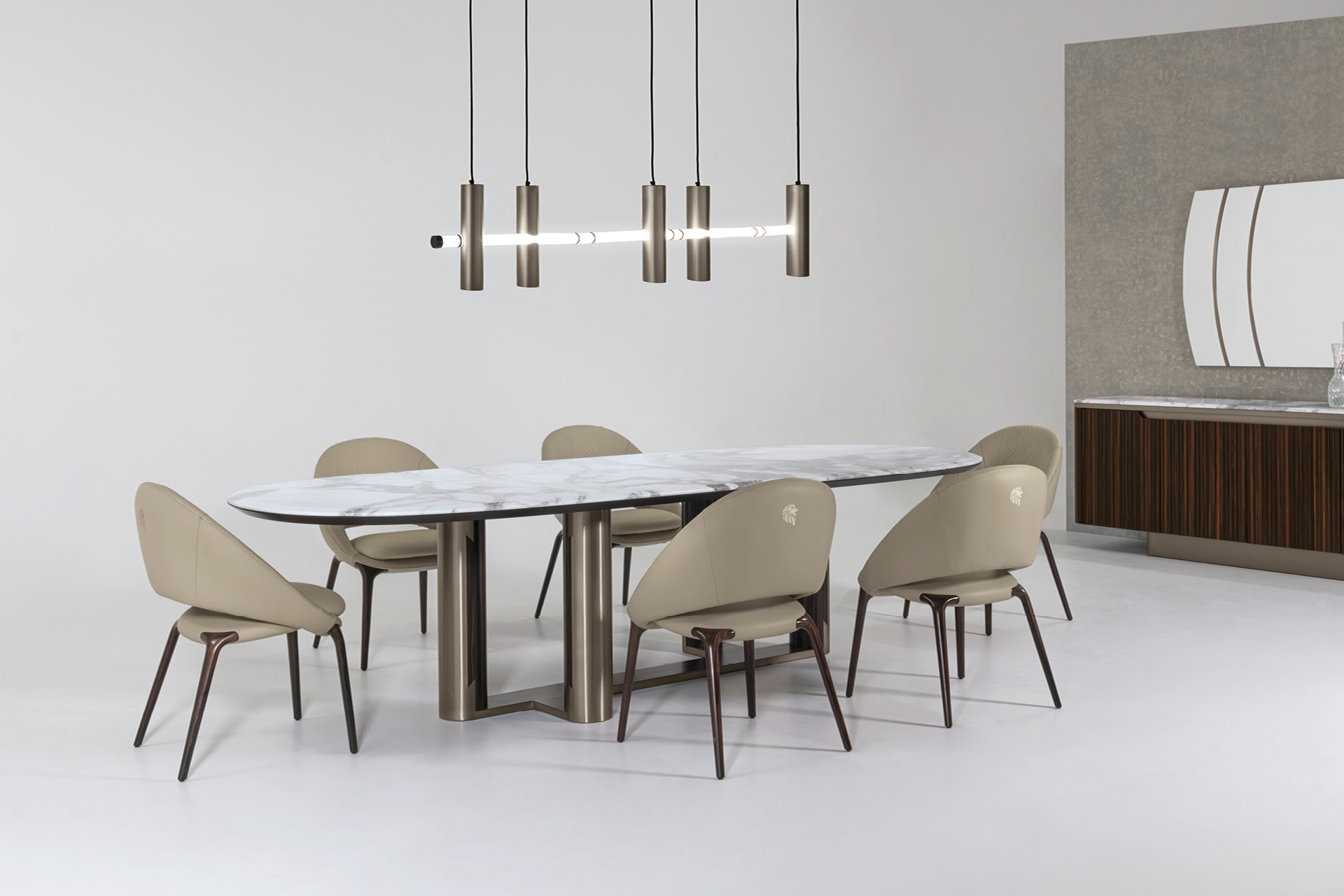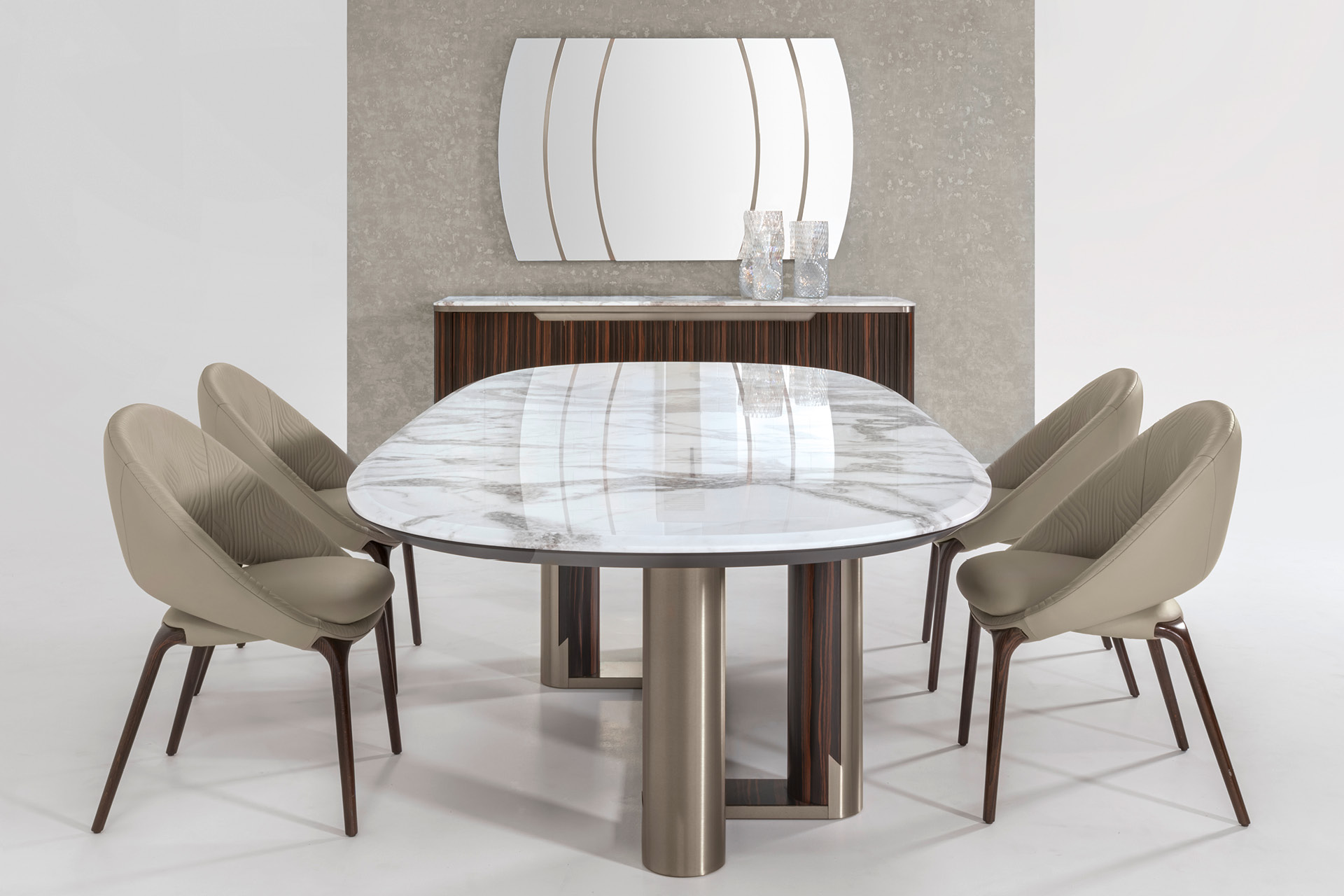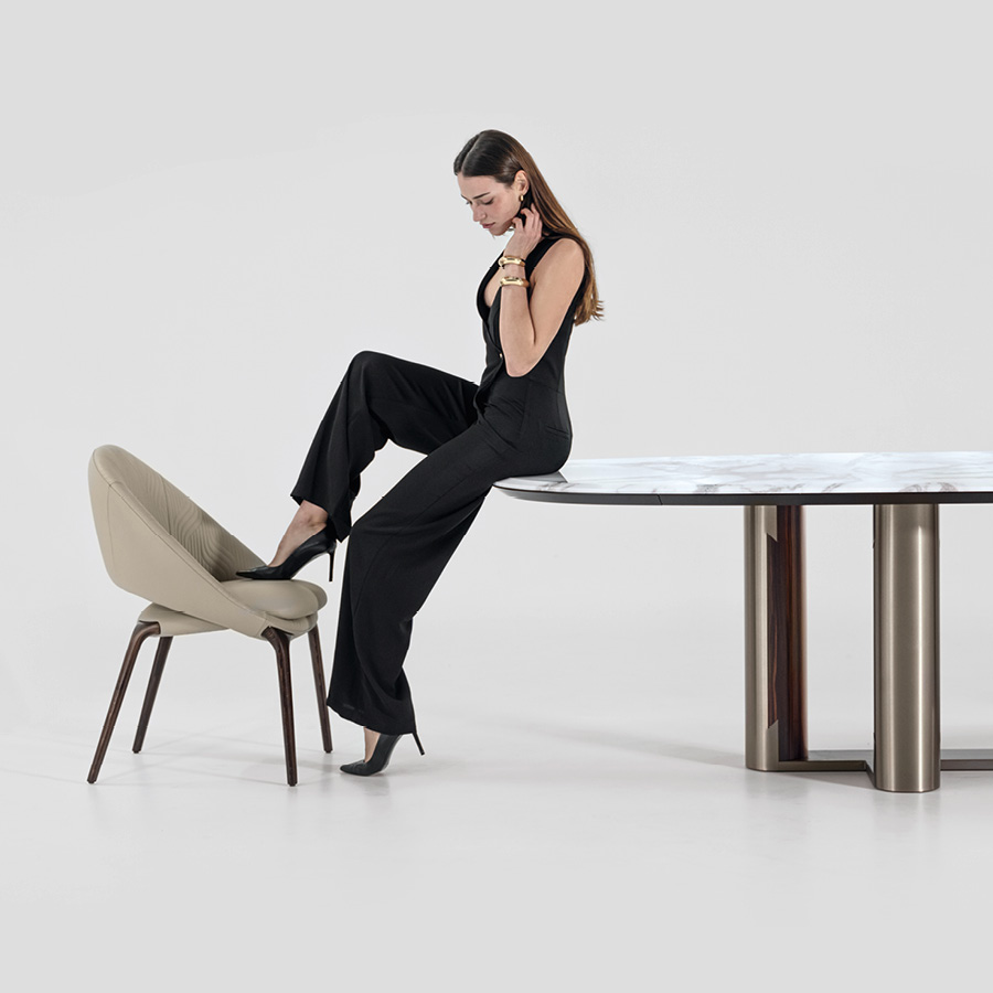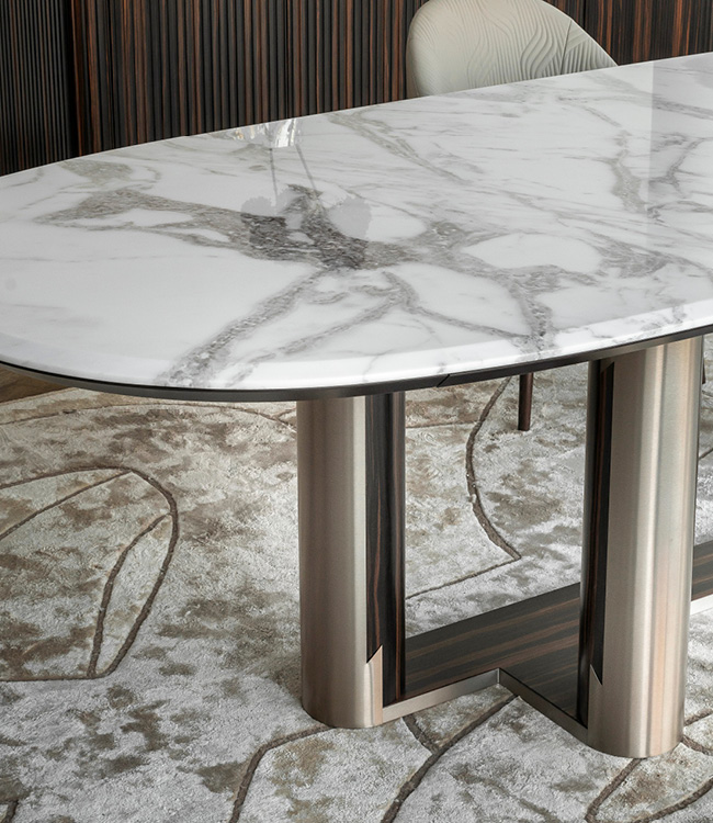 Овальный стол в форме лодки, столешница со скошенной кромкой из глянцевого намибийского мрамора Ойстер. 4 ножки и основание из сатинированного шпона макассарского эбена, скомбинированного с нержавеющей сталью с отделкой сатинированный титан.