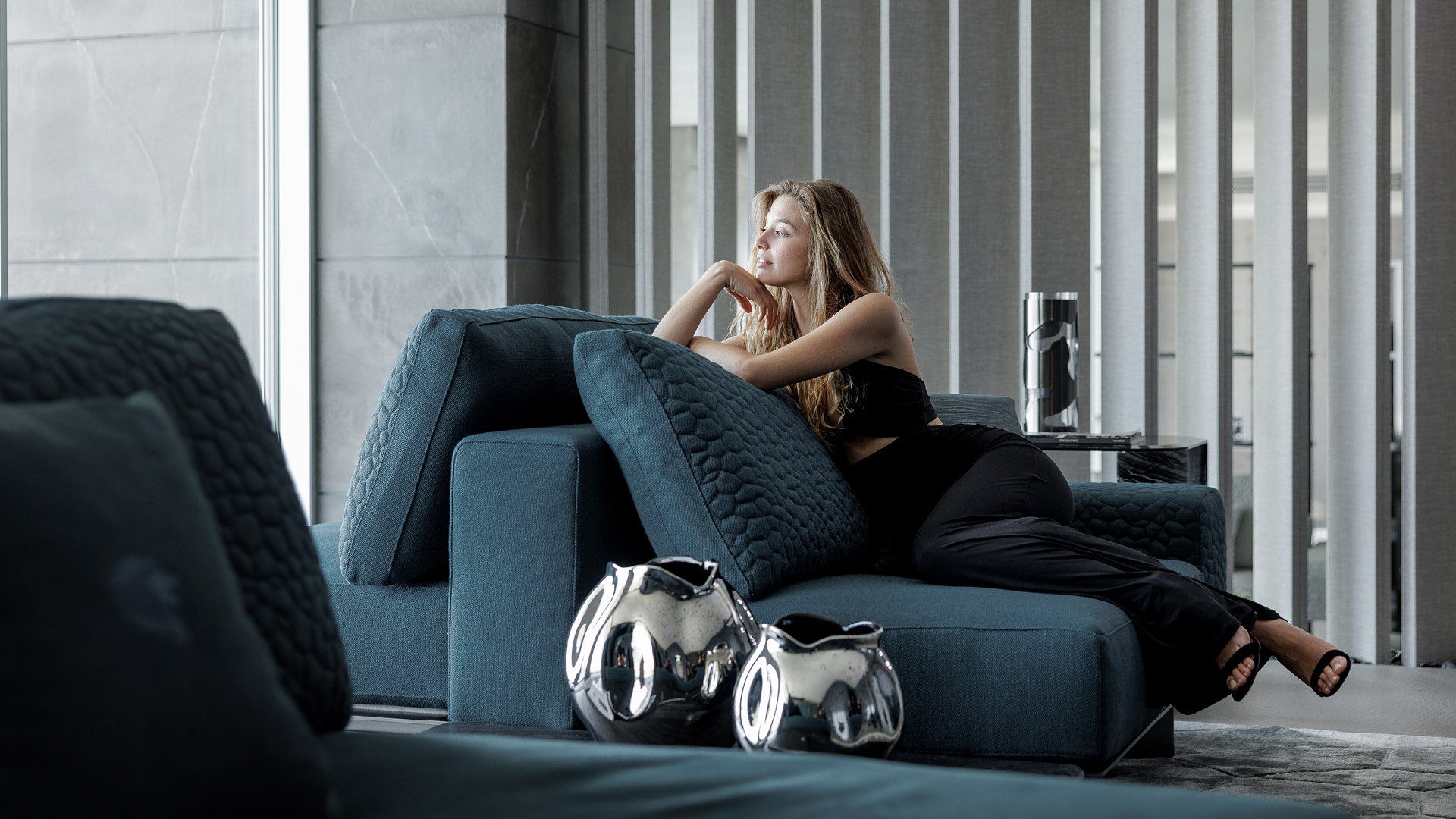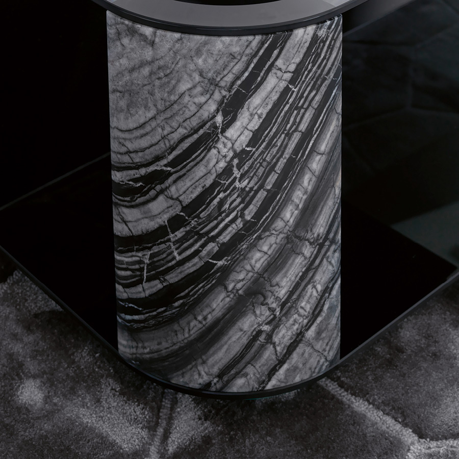 Квадратный большой приставной столик со столешницей и основанием из дымчатого закаленного скошенного стекла. 4 ножки из массивного матового мрамора Kenya Black.