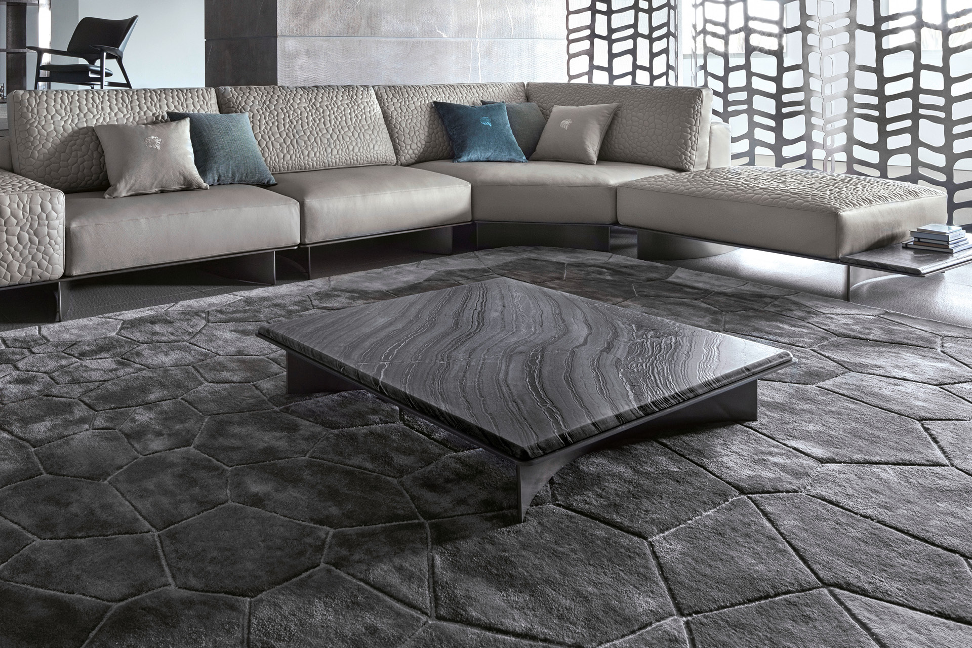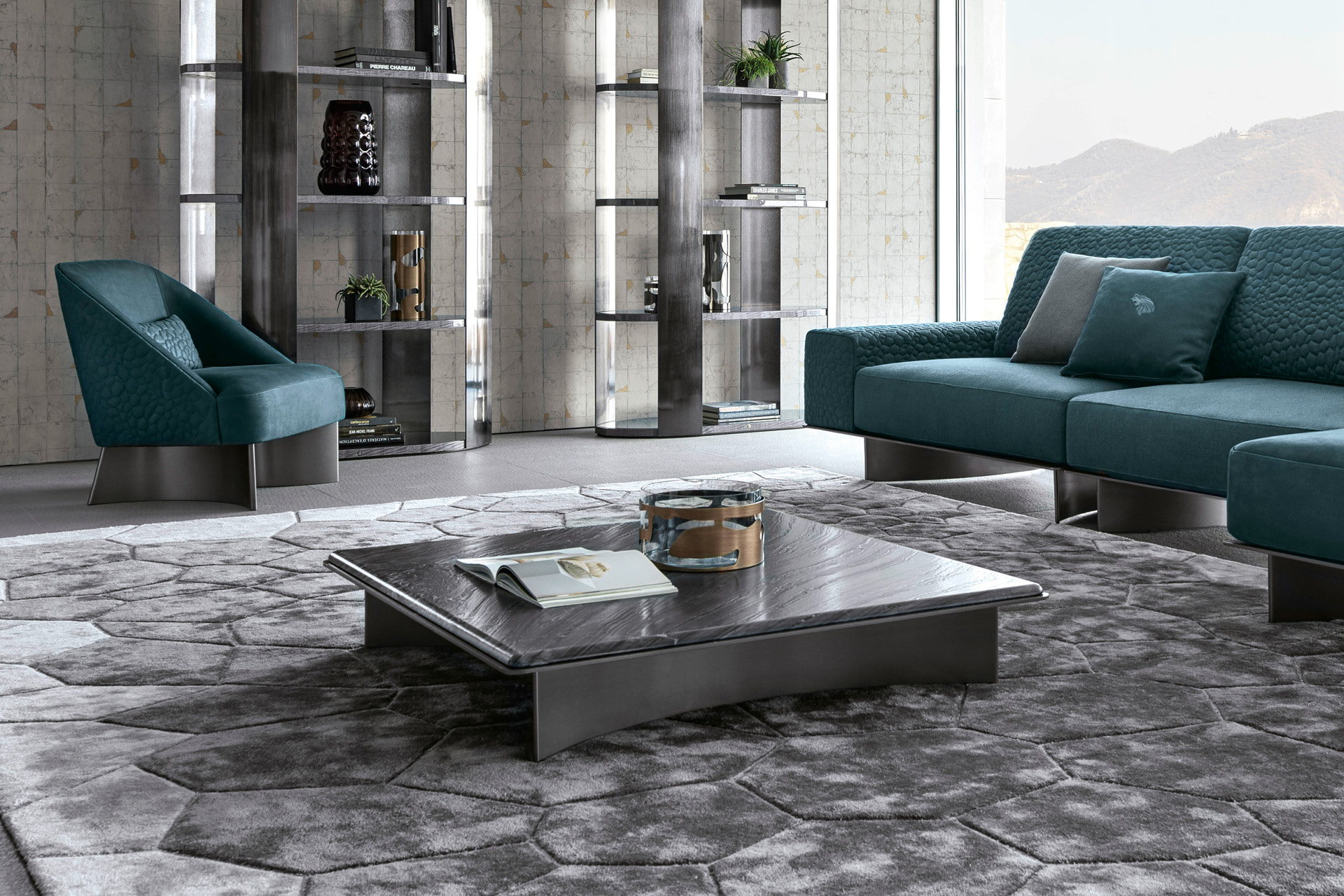 Квадратный коктейльный столик со столешницей из матового мрамора Kenya Black. Основание из сатинированной нержавеющей стали с черным никелем.