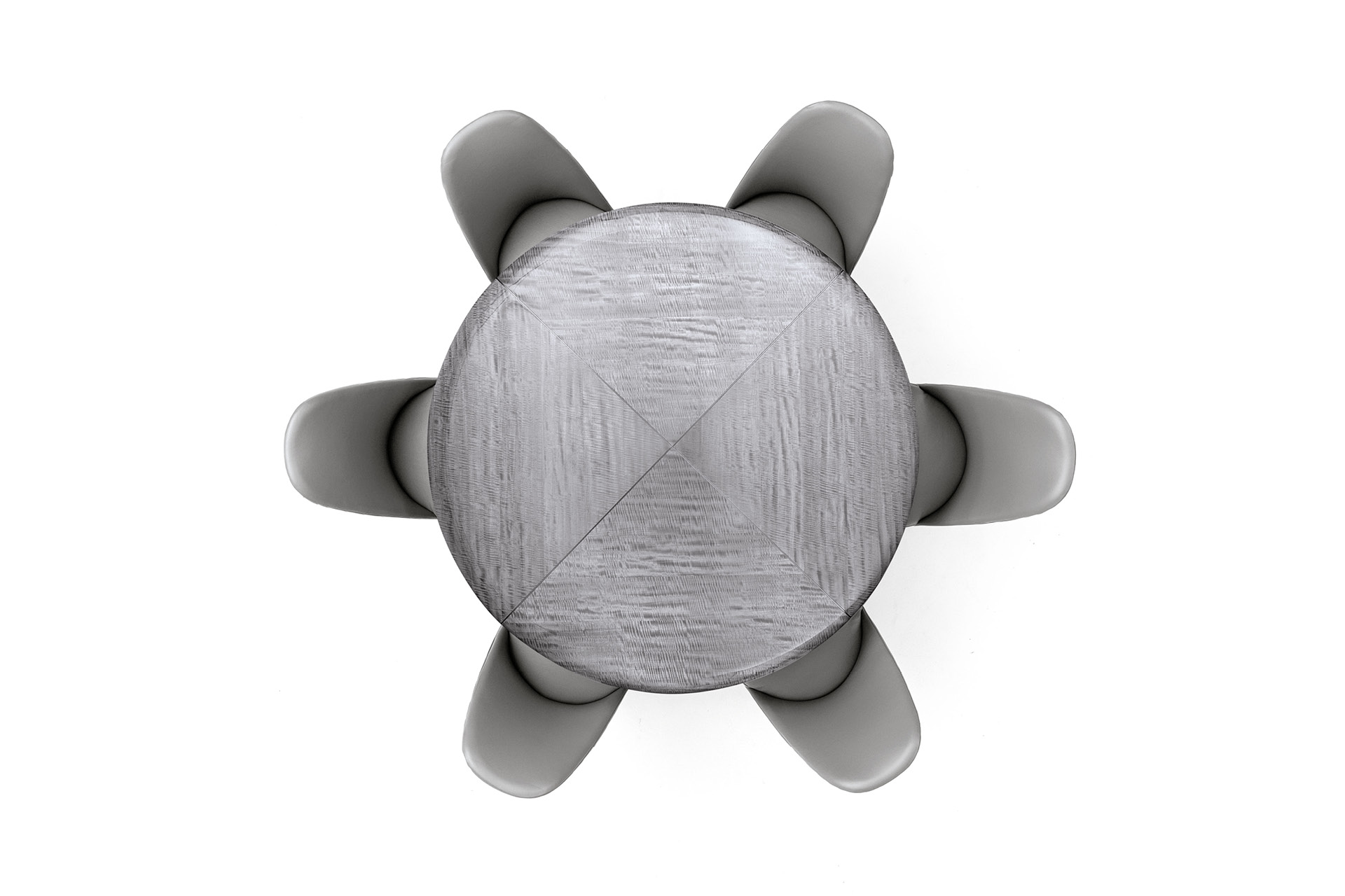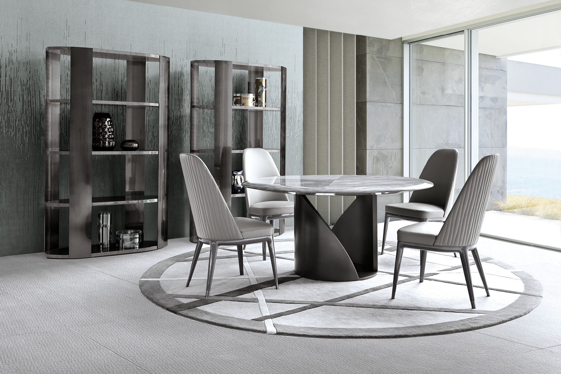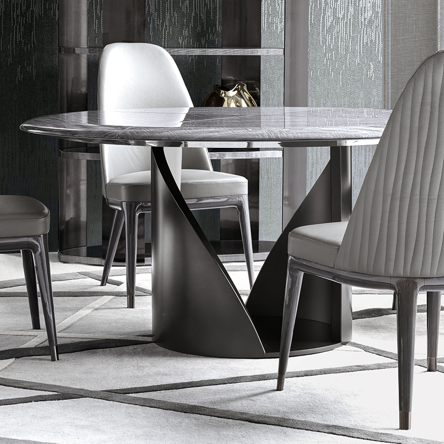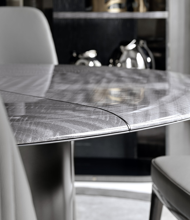 Круглый стол из мадагаскарского фигурного шпона Mowinghi с глянцевым полиэфирным покрытием. Детали столешницы и основания из сатинированной нержавеющей стали с черным никелем и лазером с логотипом Giorgio Collection.