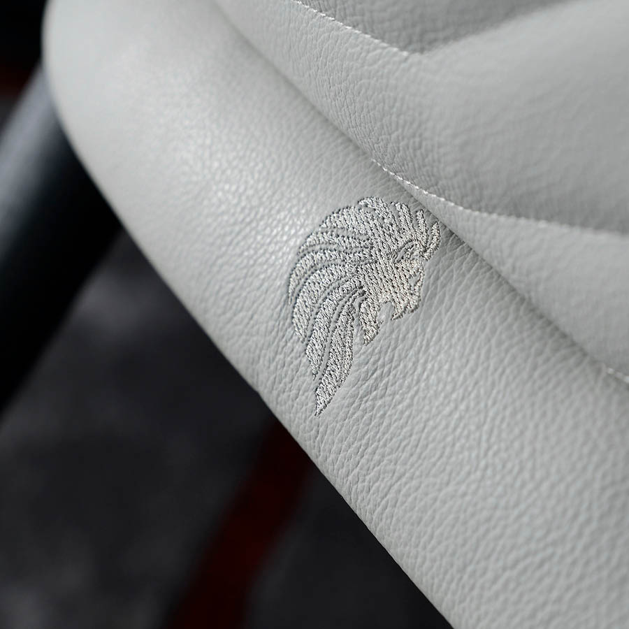 Полностью обитый стул с подлокотниками имеет каркас из массива дуба. Спинка с простежкой может быть выполнена из кожи высшего качества, нубука, кожи с принтом под ящерицу, вельвета или замши. На задней части мягкого сидения вышит логотип «Giorgio Collection». Ножки изготовлены из массива дуба покрытого матовой краской с открытыми порами.
