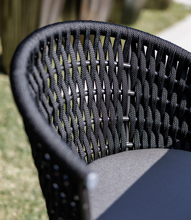 Открытый барный стул с ножками и конструкцией из сатинированного черного металла. Заднее сиденье из светло-серого или черного плетеного шнура.