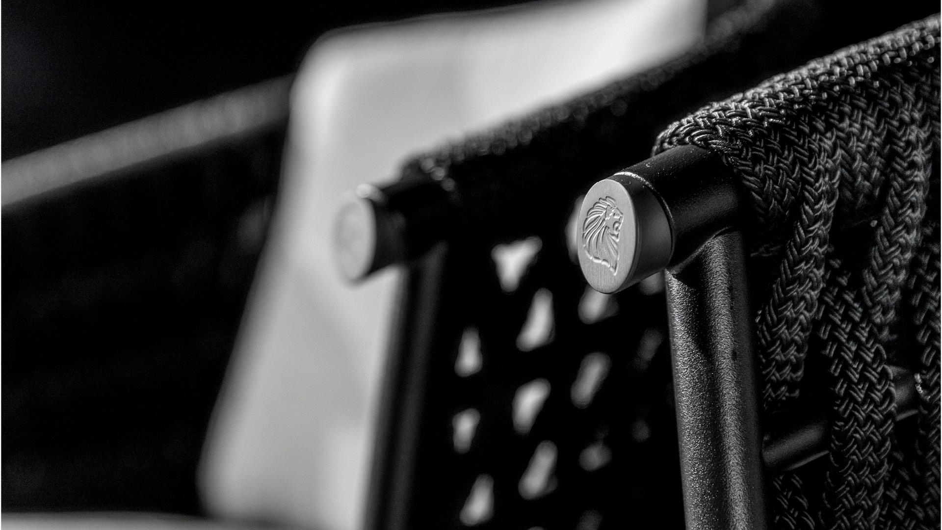 Стул для улицы с ножками и конструкцией из сатинированного черного металла. Спинка стула из светло-серого или черного плетеного корда.