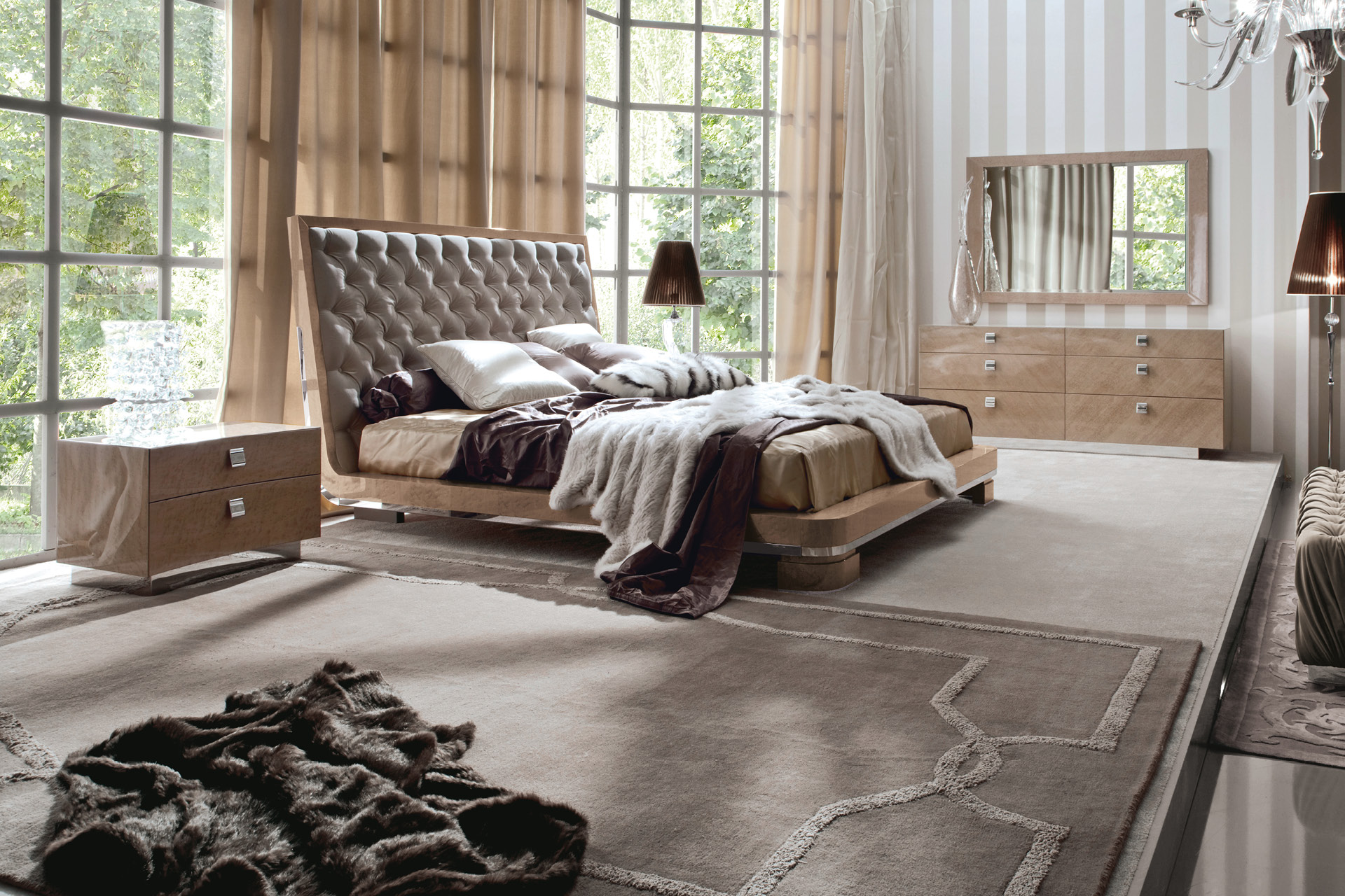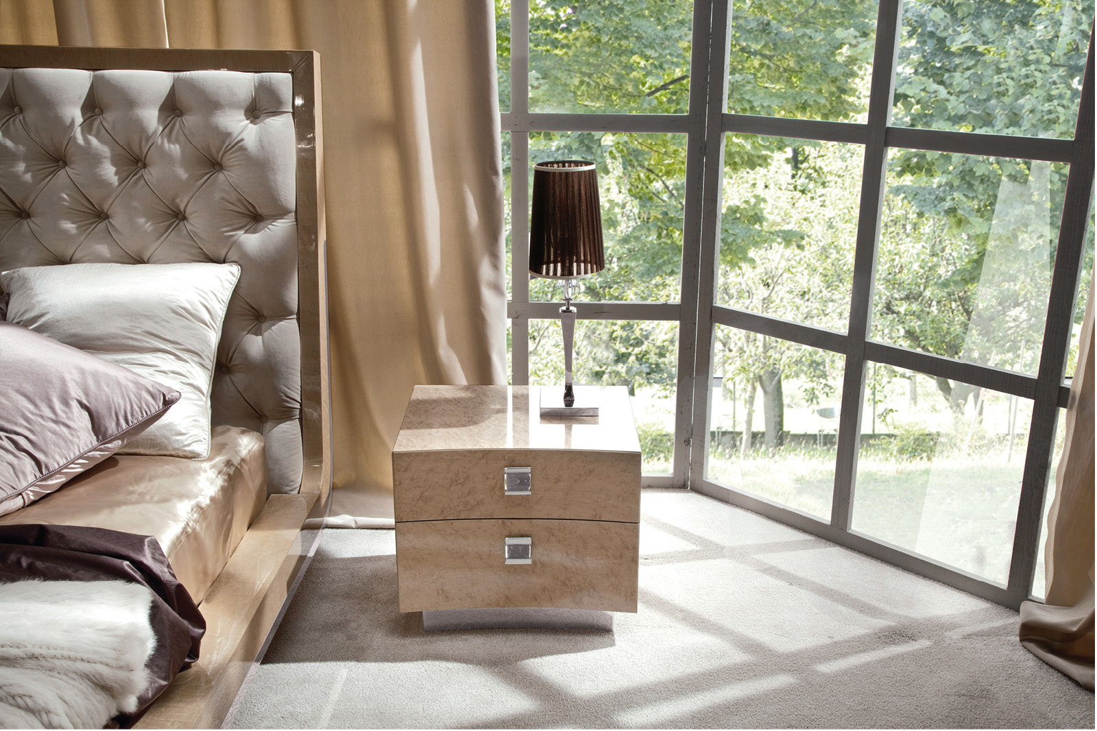 Прикроватная тумба предлагается в отделке глянцевым шпоном клена птичьего глаза. Ручки и основание из хромированной нержавеющей стали.