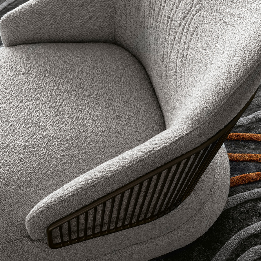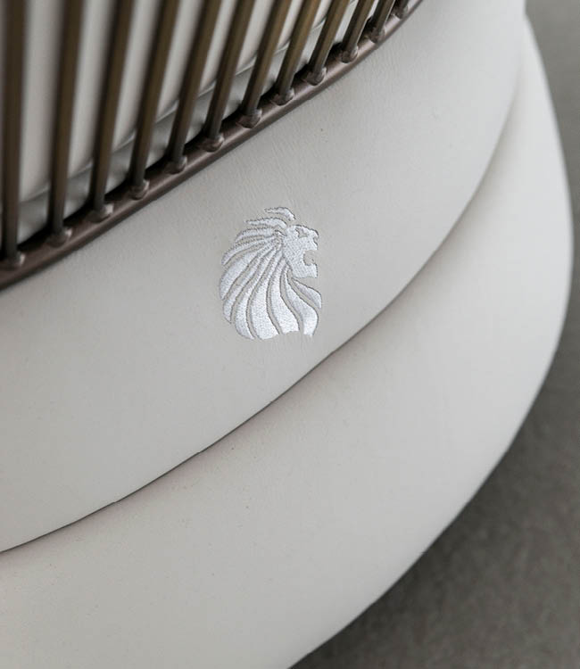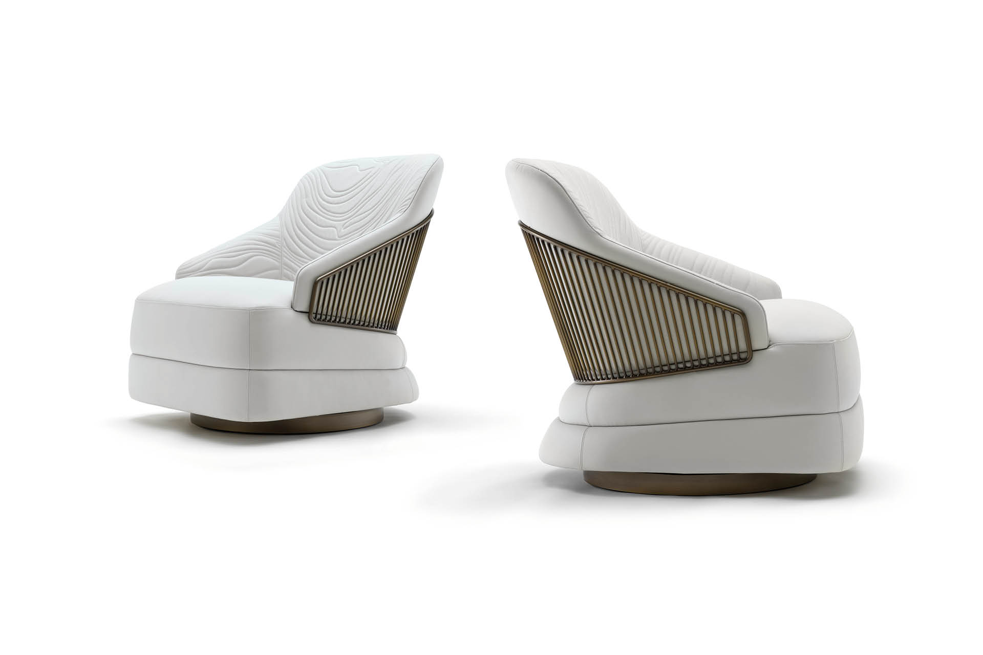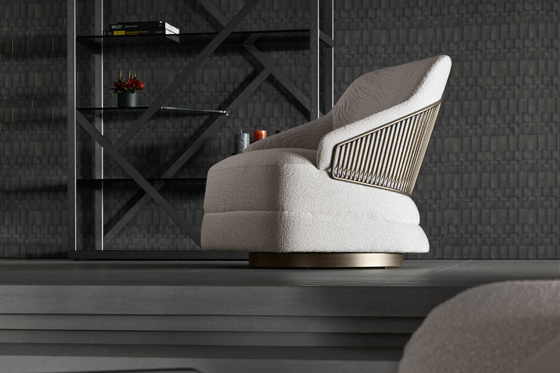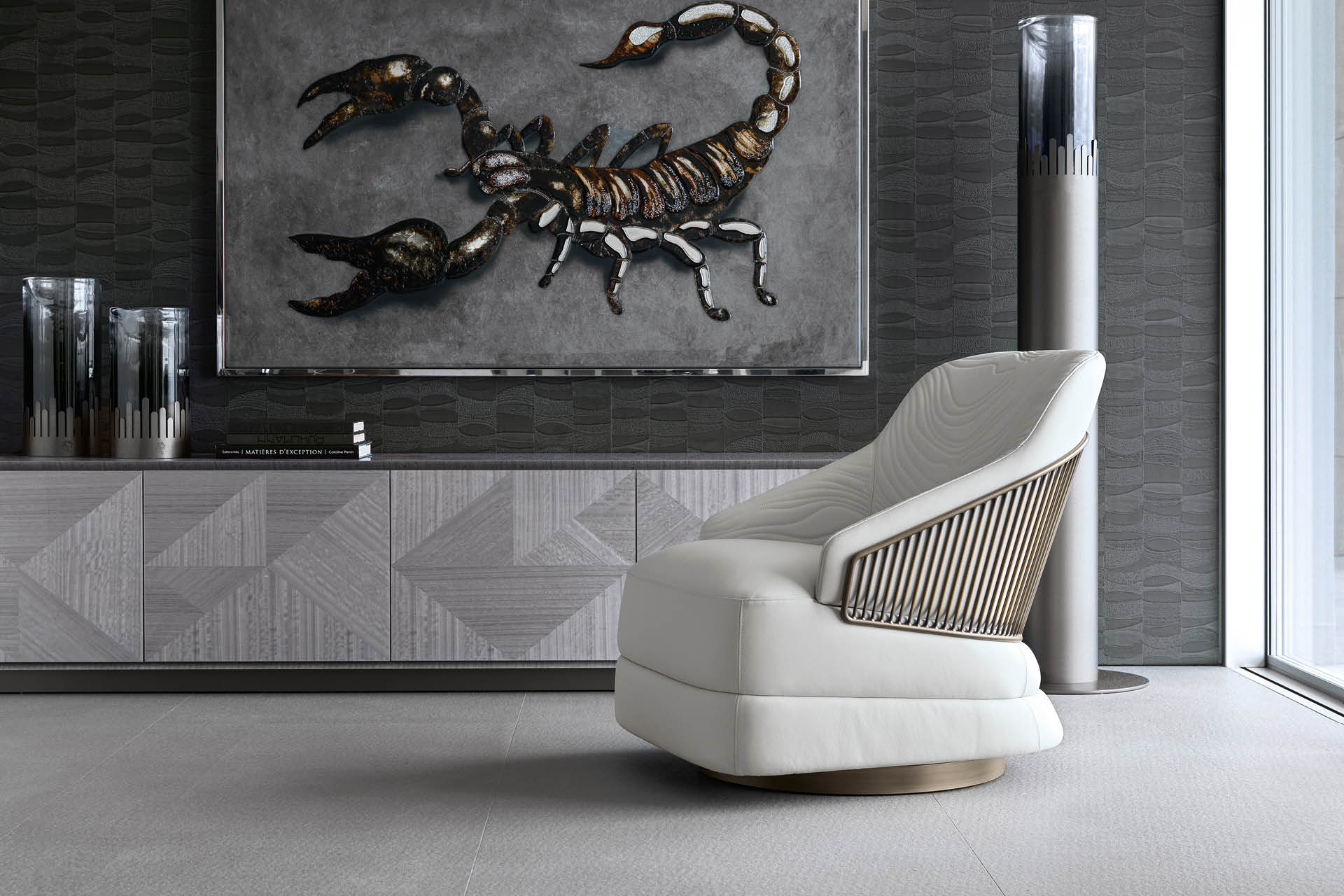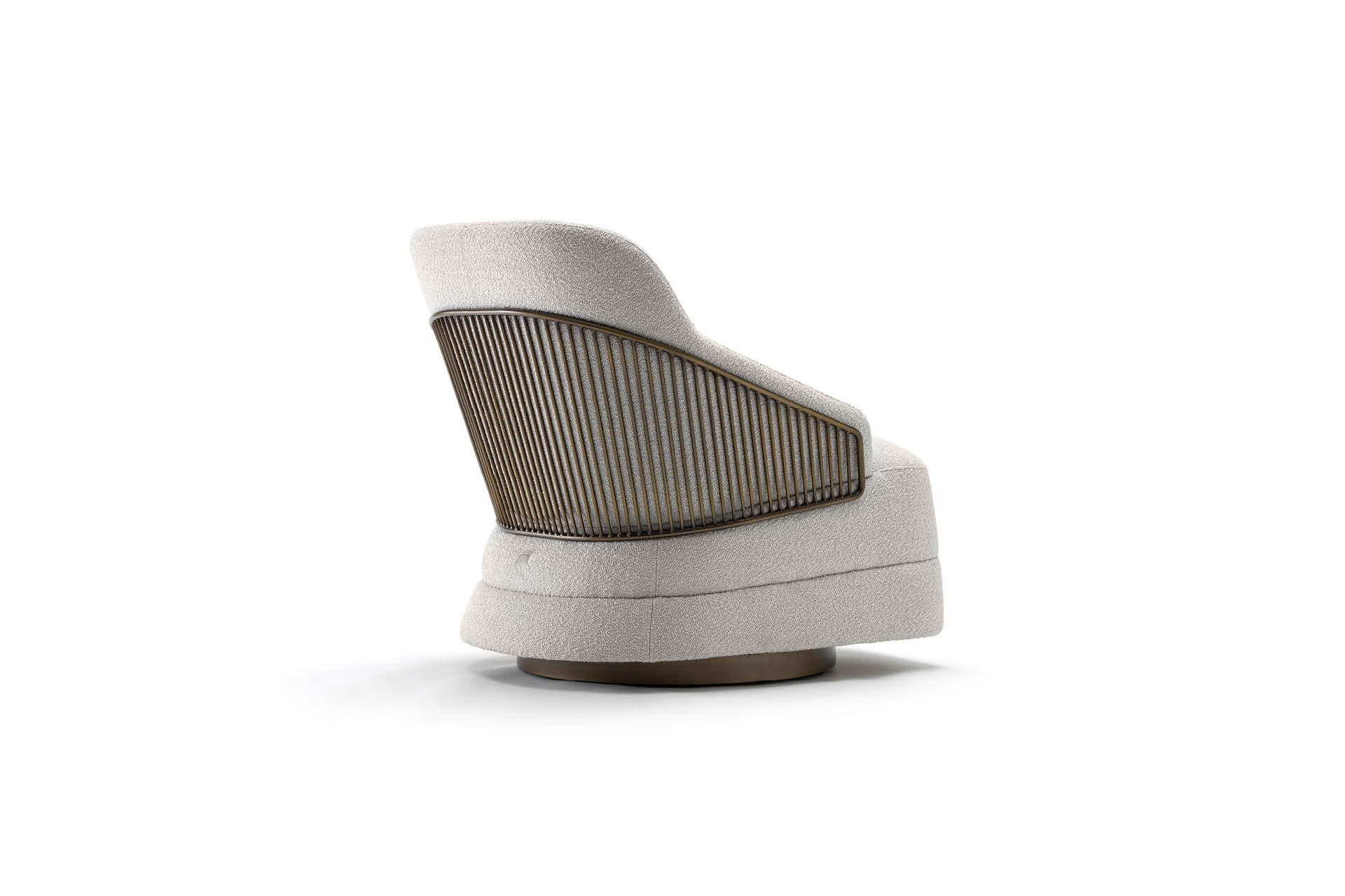 Вращающееся кресло доступно в первоклассной коже, нубуке, коже с принтом ящерицы, вельвете или замше. Внутреннее наполнение сидения и боковин - пенополиуретан, обернутый пуховым пером и прошитый двойной строчкой. Спинка стеганая с каркасом из нержавеющей стали в цвет сатинированной бронзы. Высота сиденья см. 39.
