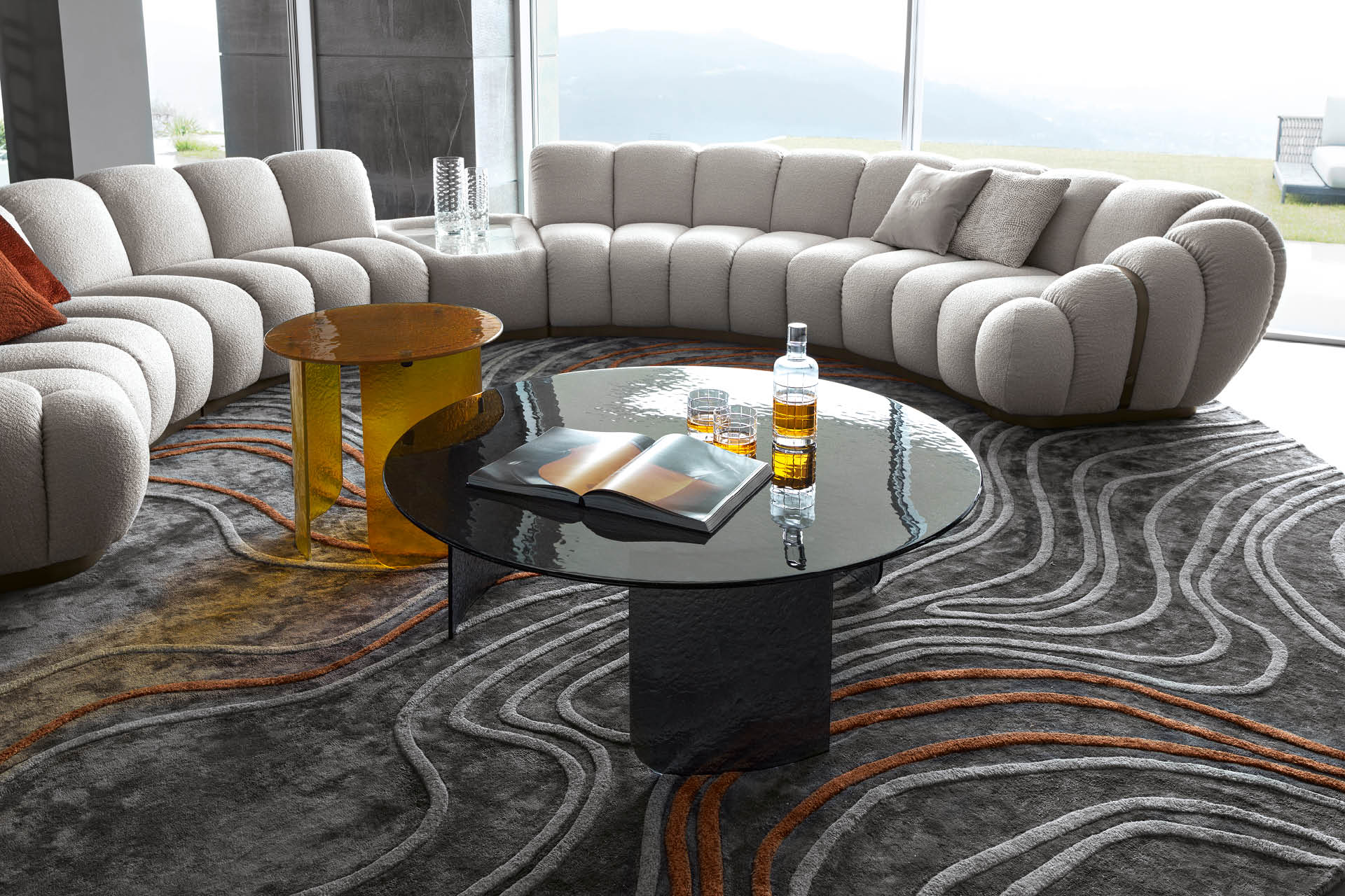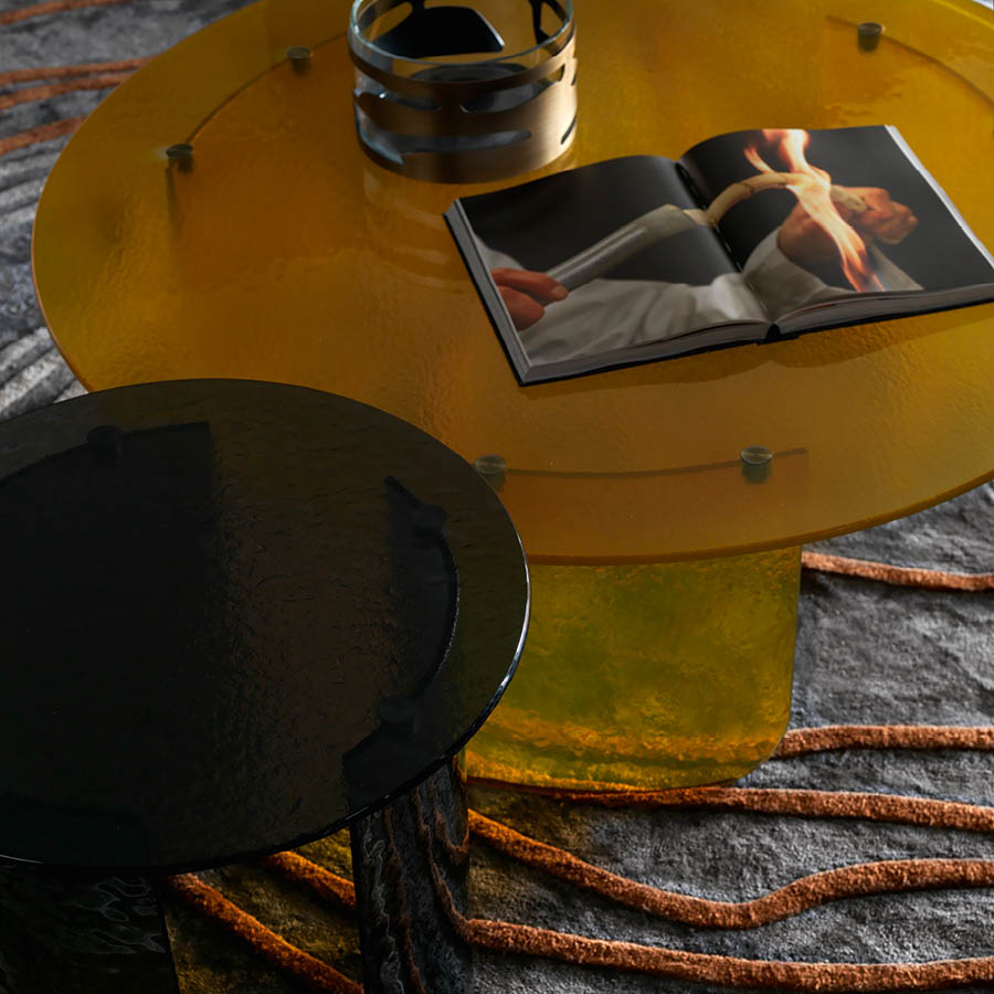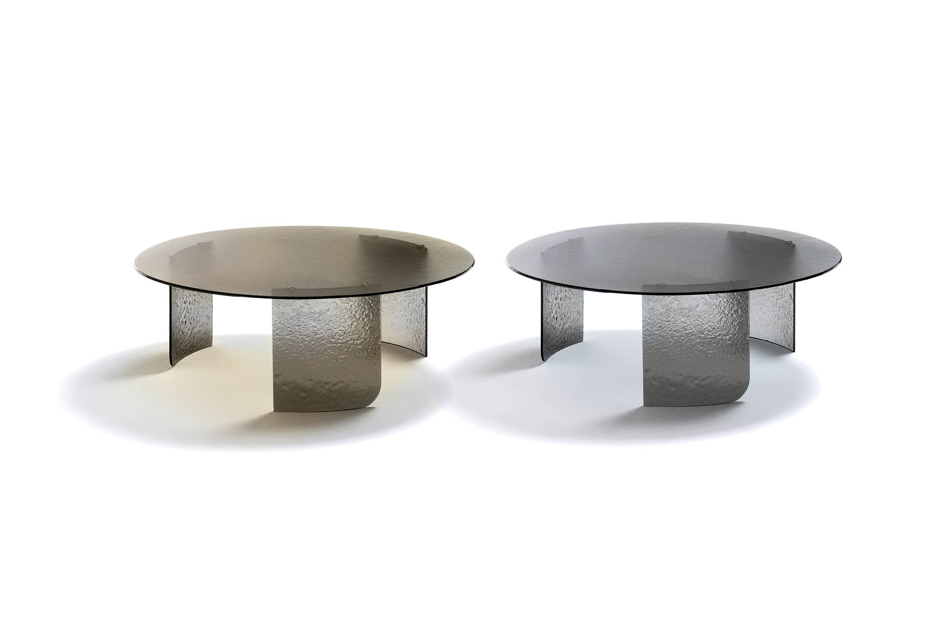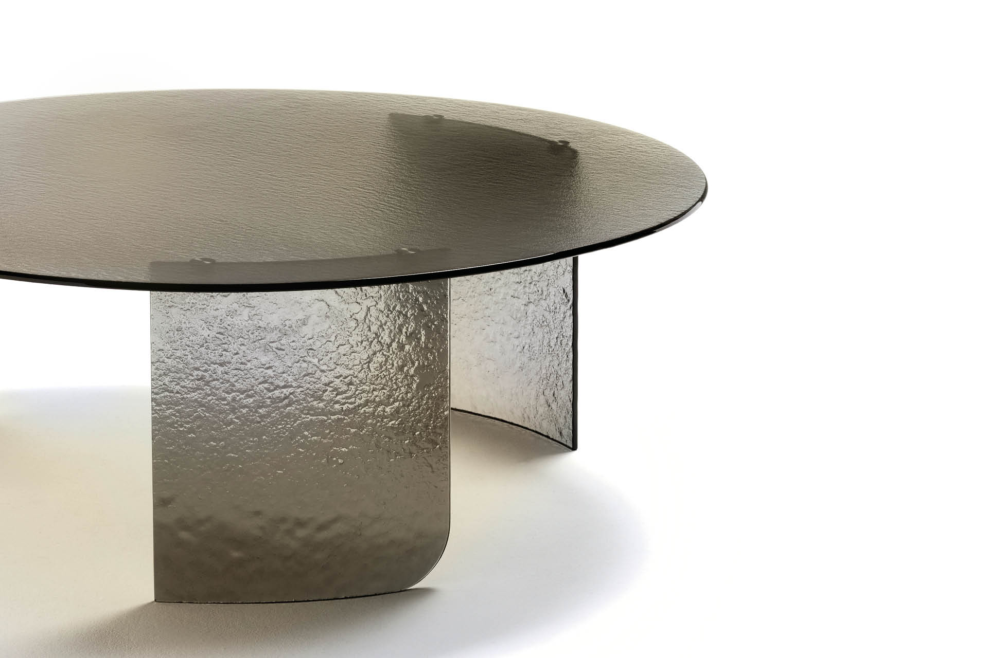 Круглый коктейльный столик со столешницей и основанием из коричневого, дымчатого или янтарного стекла, выплавленного вручную.