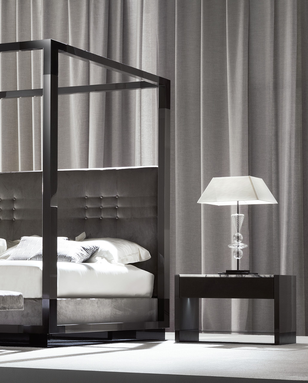 Прикроватная тумба в глянцевом полиэфирном лаке серого цвета с мраморной столешницей. Система сенсорной светодиодной подсветки под столешницей. Основание из стали цвета черного никеля со вставкой логотипа Giorgio Collection. Ножки и ручка из черной никелевой стали.
